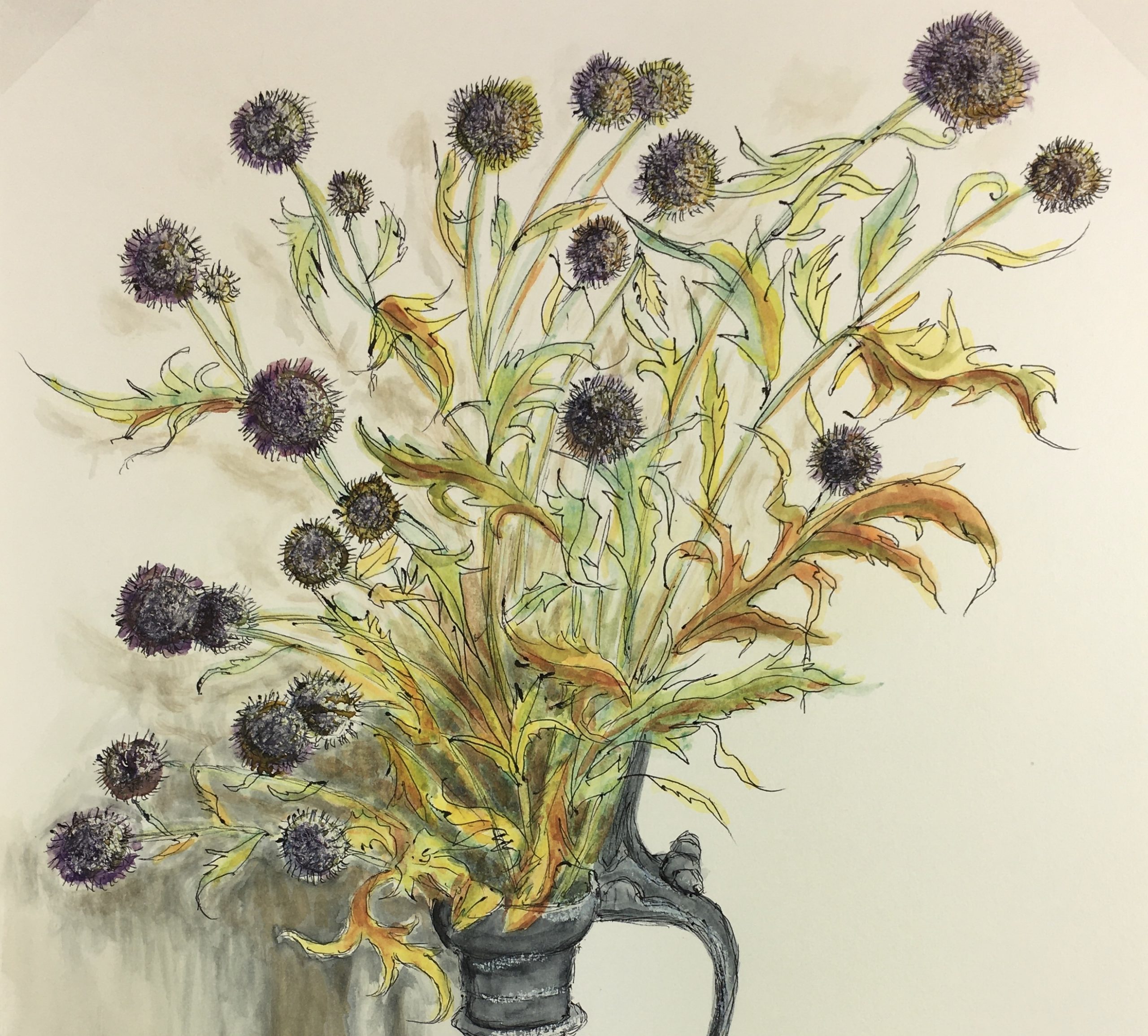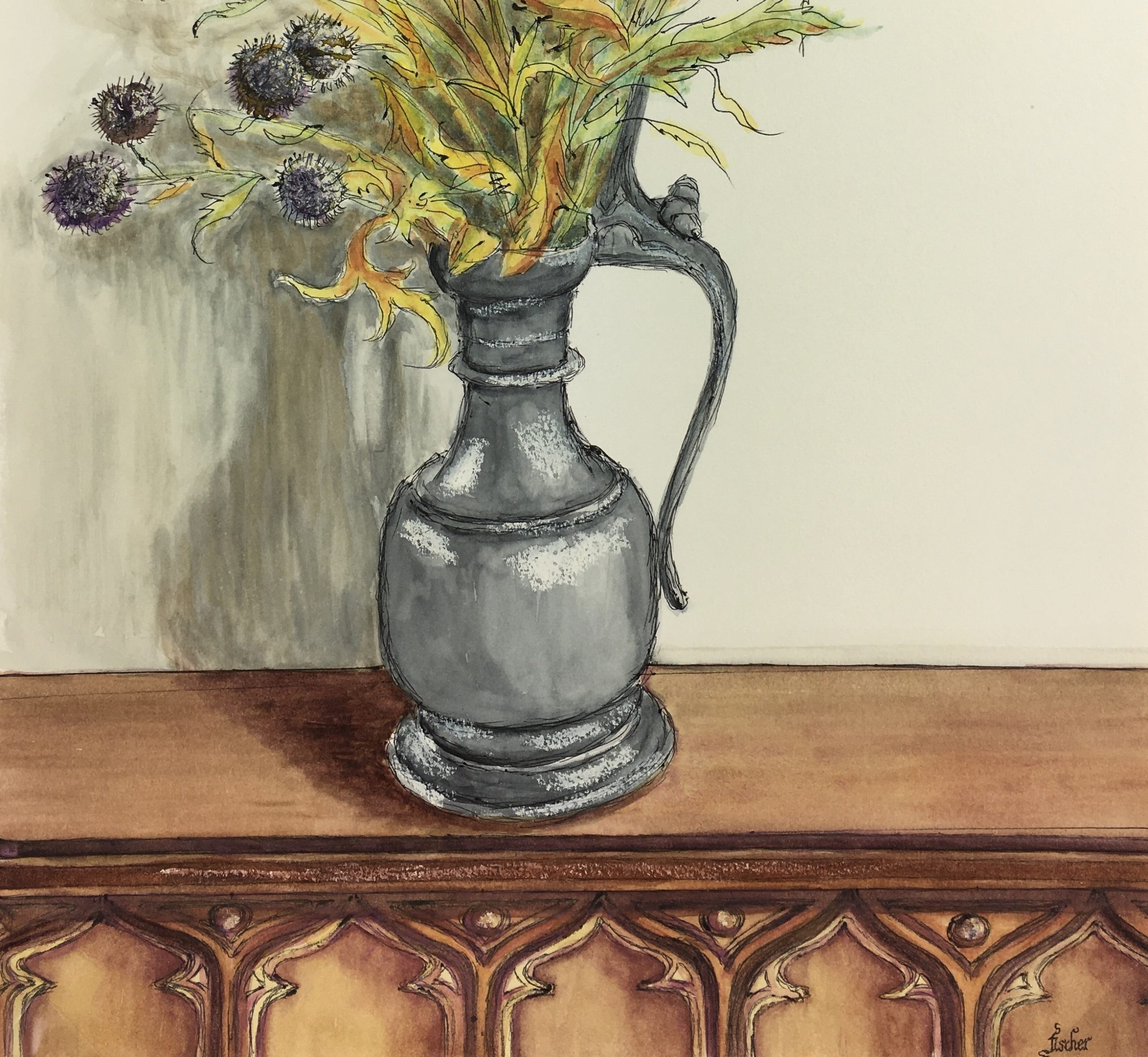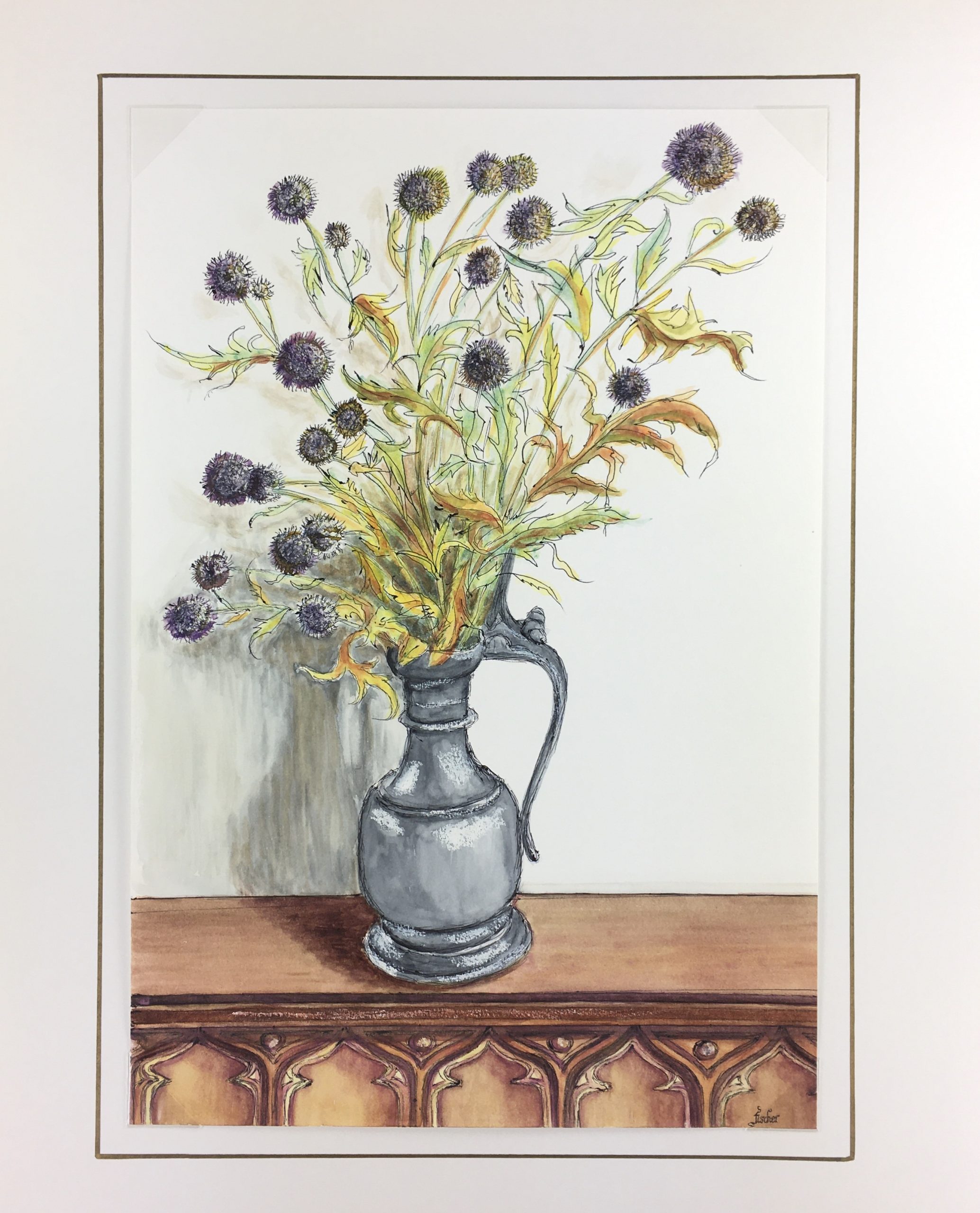 Original Art on paper displayed on a white mat with a gold border. Mat fits a standard-size frame. Archival plastic sleeve and Certificate of Authenticity included. Original Art, 11″W x 16.25″H; mat, 16″W x 20″H.
