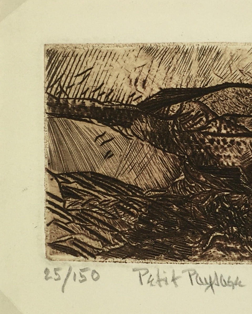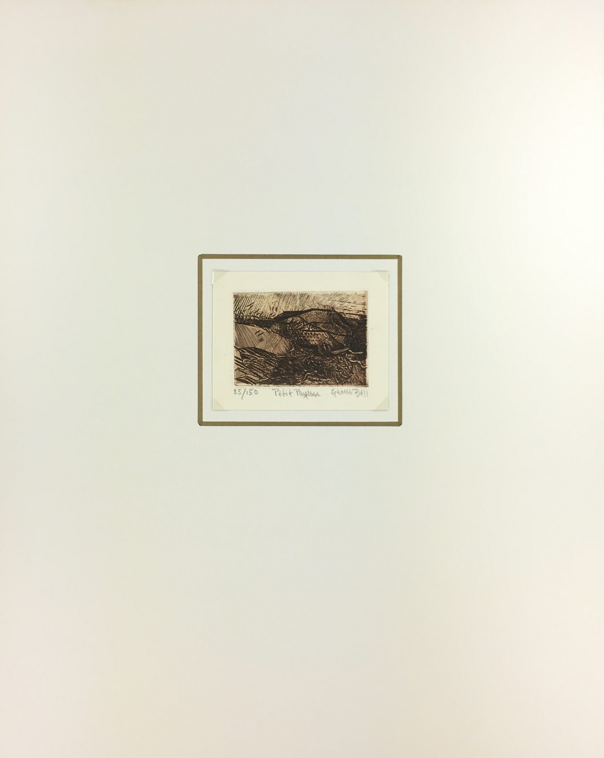 Original Art on paper displayed on a white mat with a gold border. Mat fits a standard-size frame. Archival plastic sleeve and Certificate of Authenticity included. Original Art, 4.5″W x 3.5″H; mat, 16″W x 20″H.