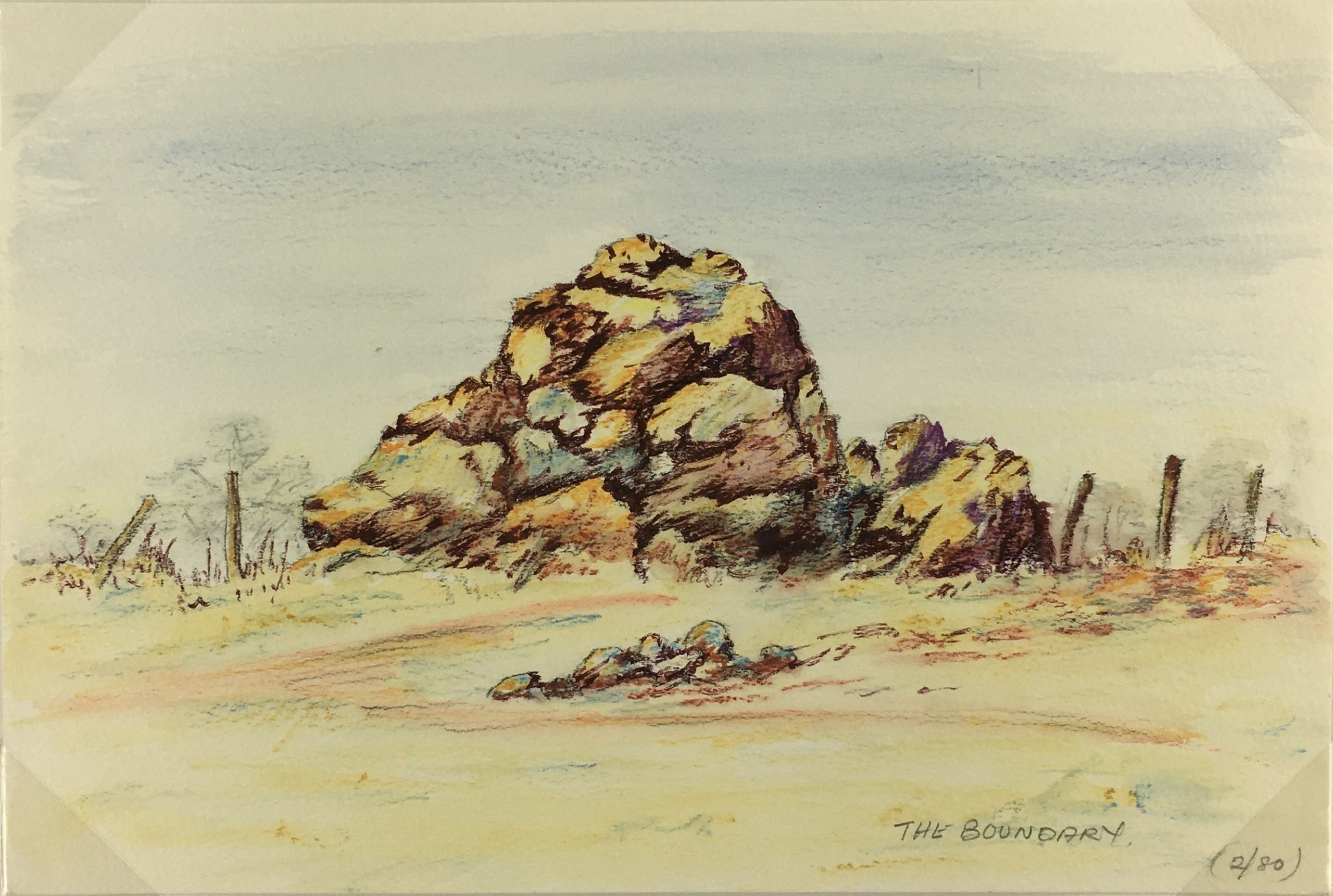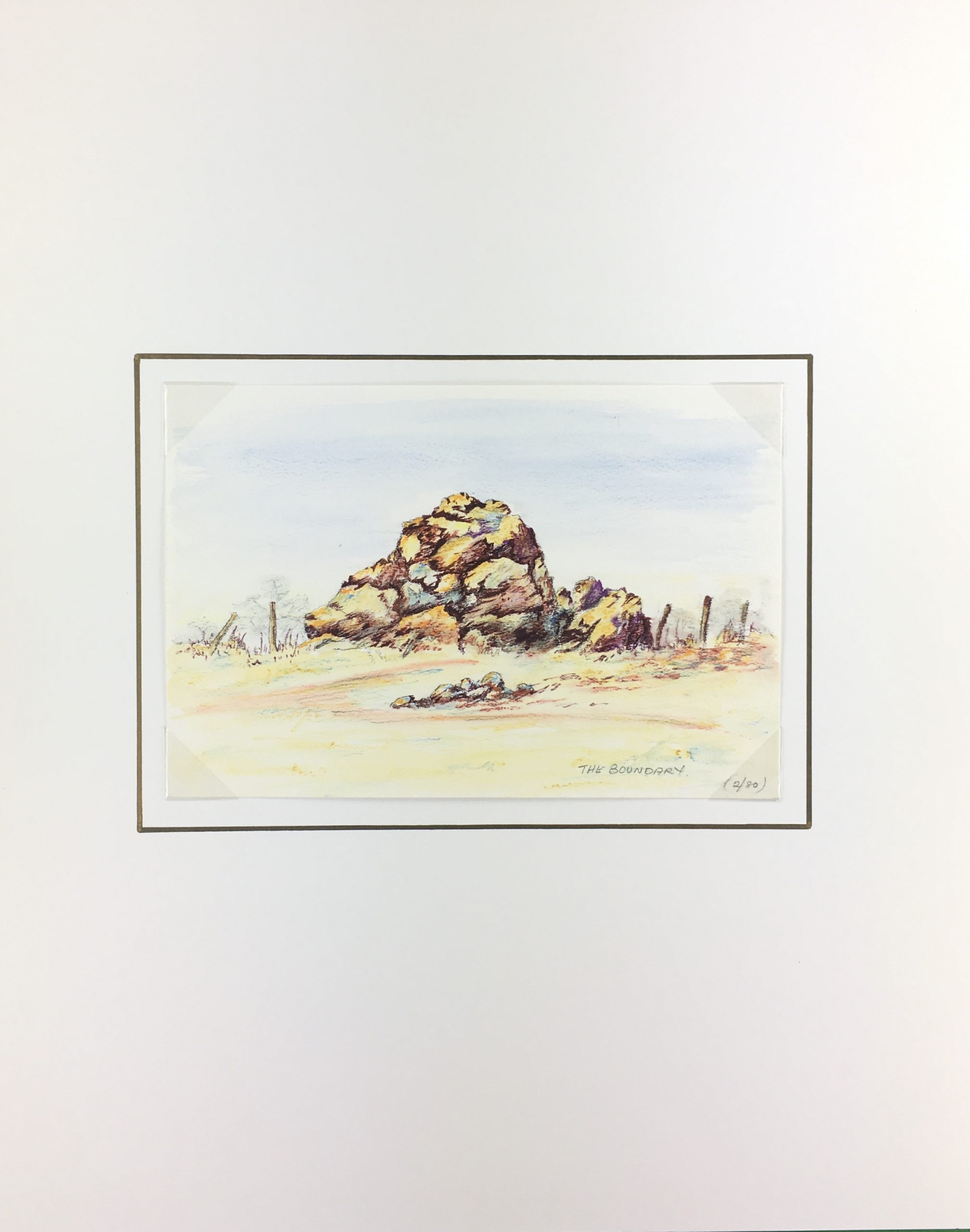 Original Art on paper displayed on a white mat with a gold border. Mat fits a standard-size frame. Archival plastic sleeve and Certificate of Authenticity included. Original Art, 10″W x 6.75″H; mat, 16″W x 20″H.