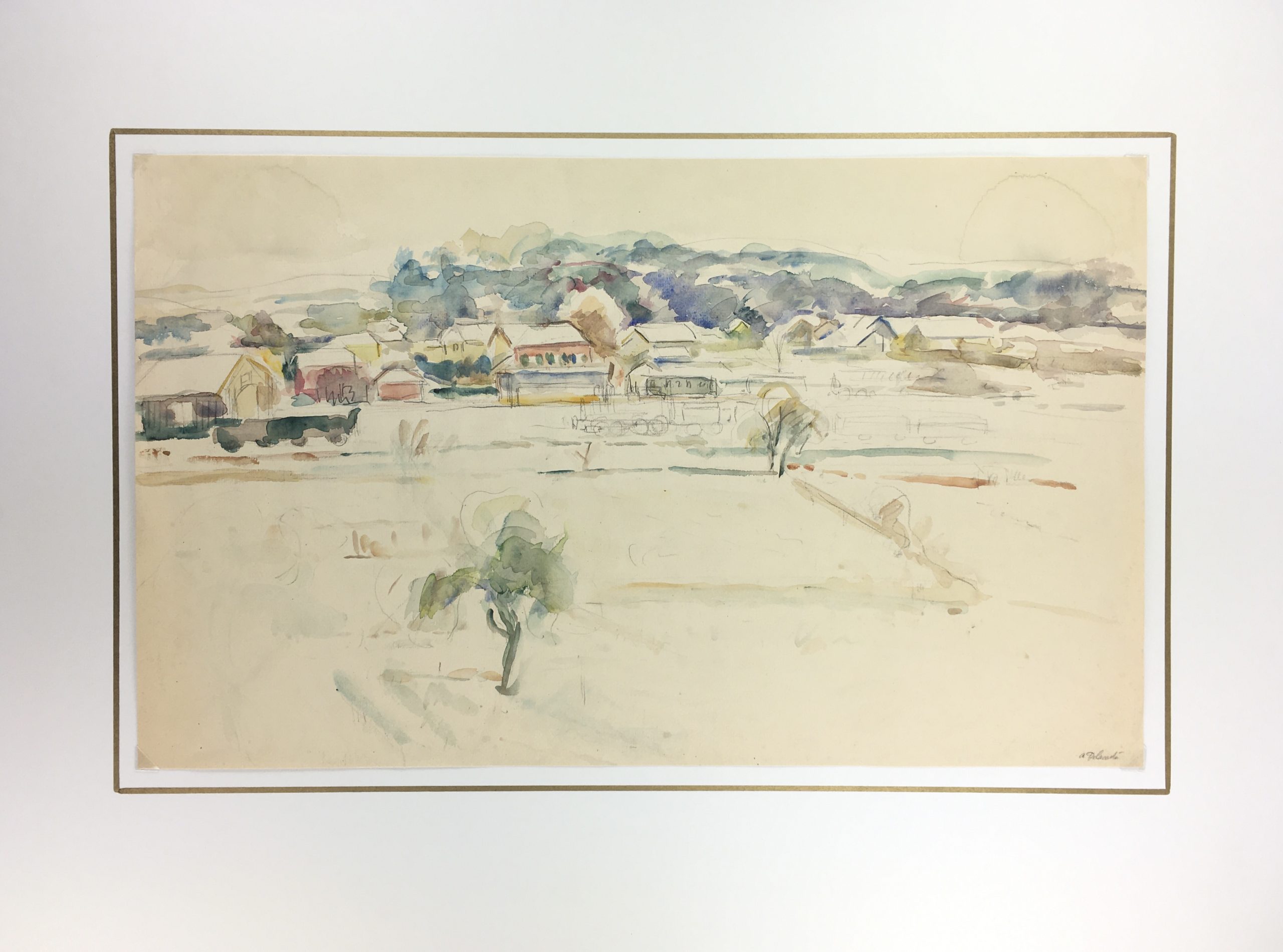 Original Art on paper displayed on a white mat with a gold border. Mat fits a standard-size frame. Archival plastic sleeve and Certificate of Authenticity included. Original Art, 18″W x 11″H; mat, 24″W x 18″H.