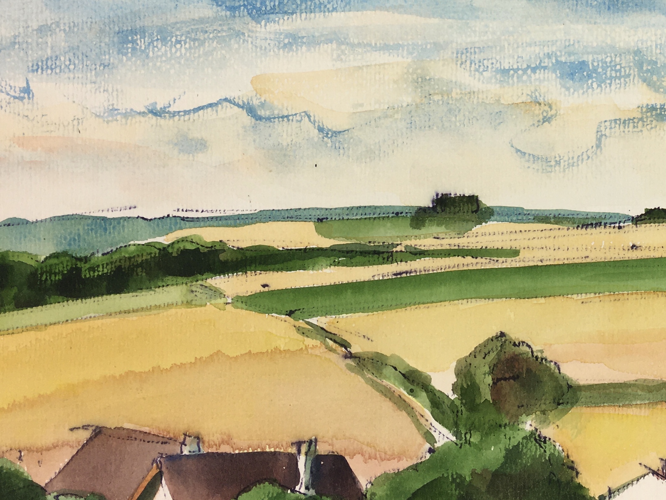 Original Art on paper displayed on a white mat with a gold border. Mat fits a standard-size frame. Archival plastic sleeve and Certificate of Authenticity included. Original Art, 17.25″W x 10″H; mat, 24″W x 18″H.
