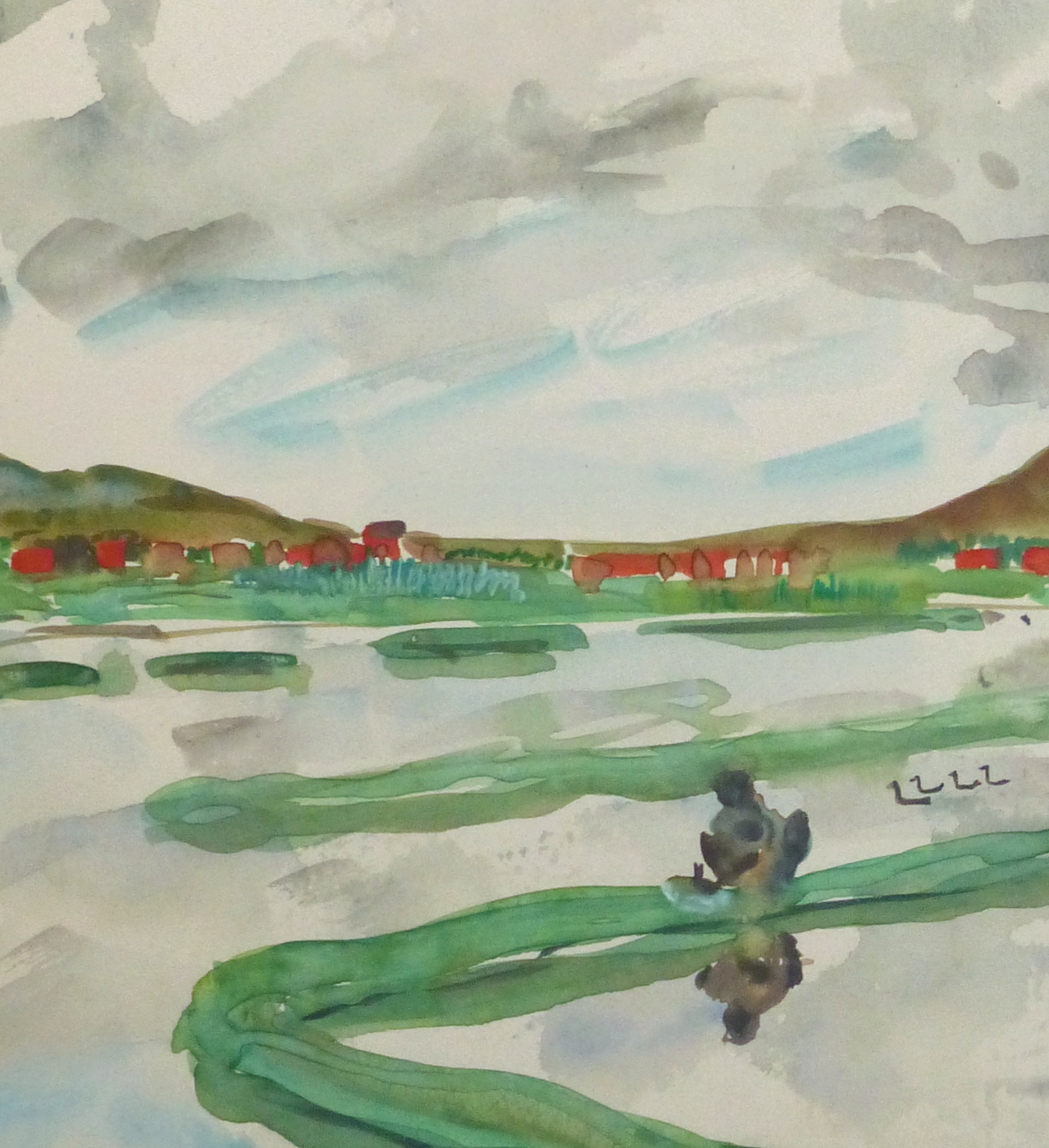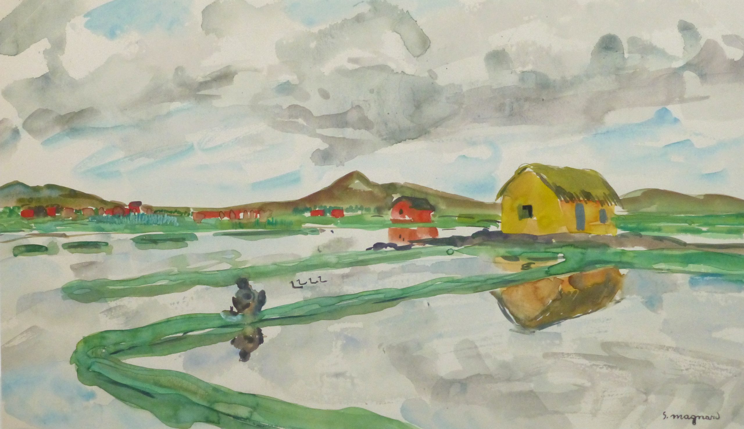 Quaint watercolor of the terraced rice fields on the island of Madagascar by French artist Stephane Magnard, circa 1950. Signed lower right.