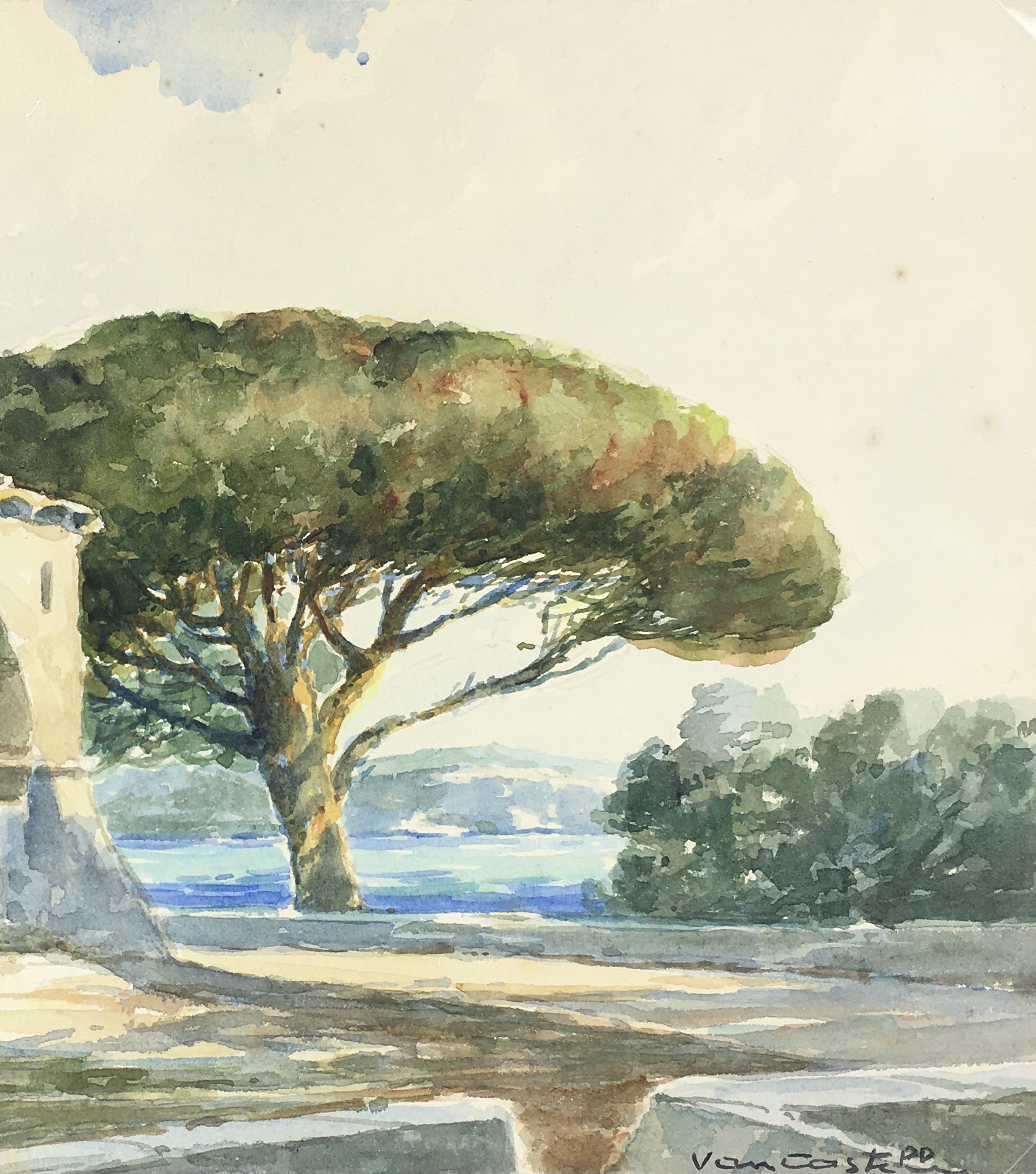 Original Art on paper displayed on a white mat with a gold border. Mat fits a standard-size frame. Archival plastic sleeve and Certificate of Authenticity included. Original Art, 10.25″W x 7″H; mat, 16″W x 20″H.