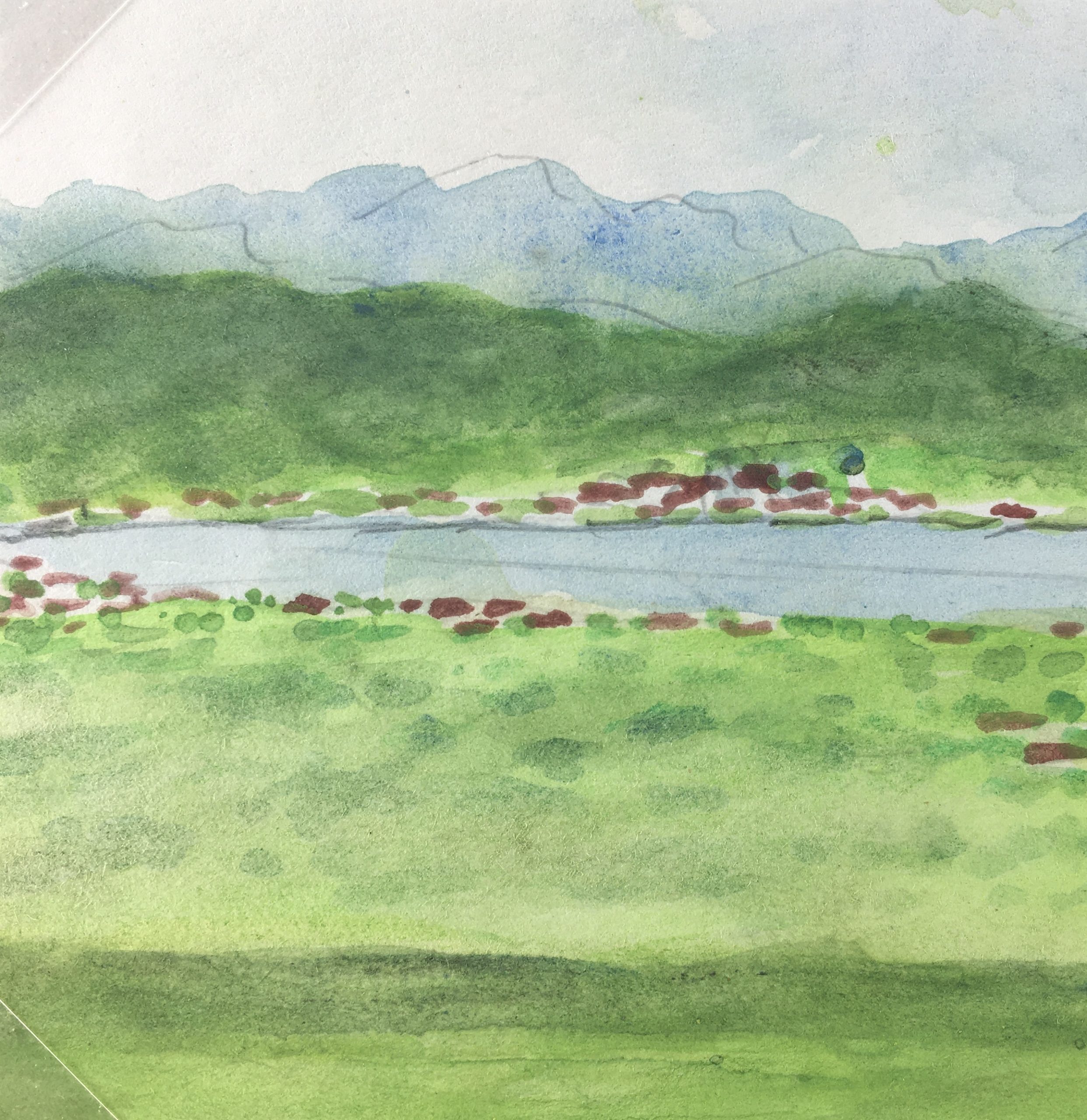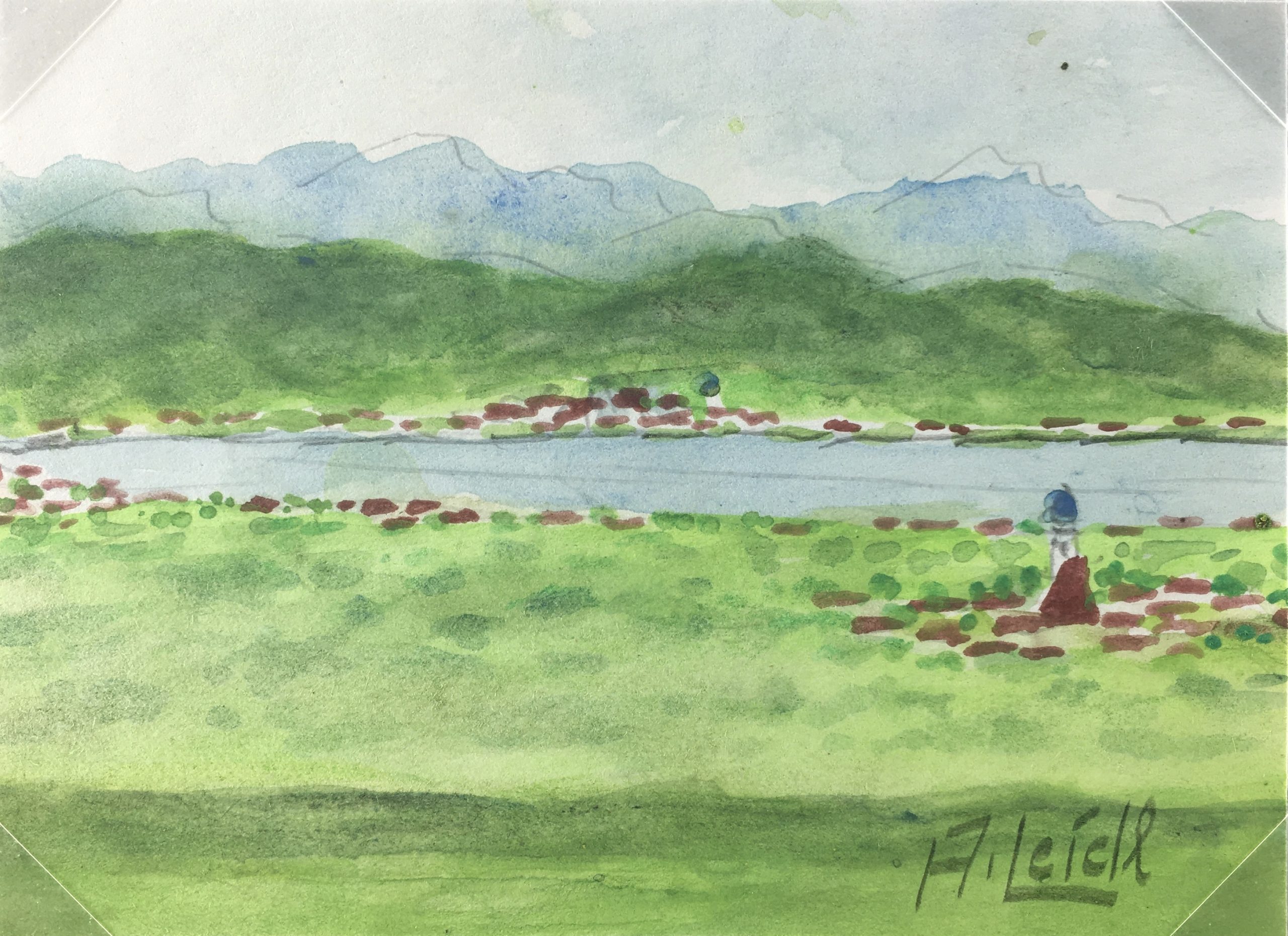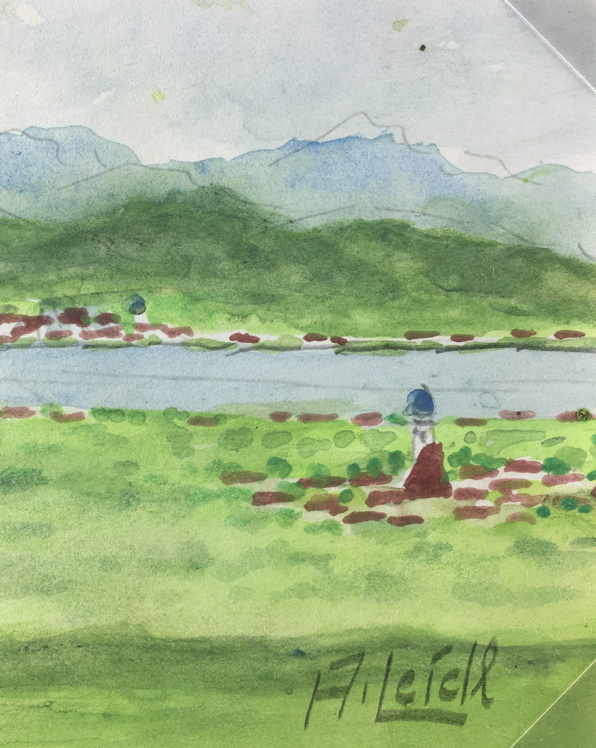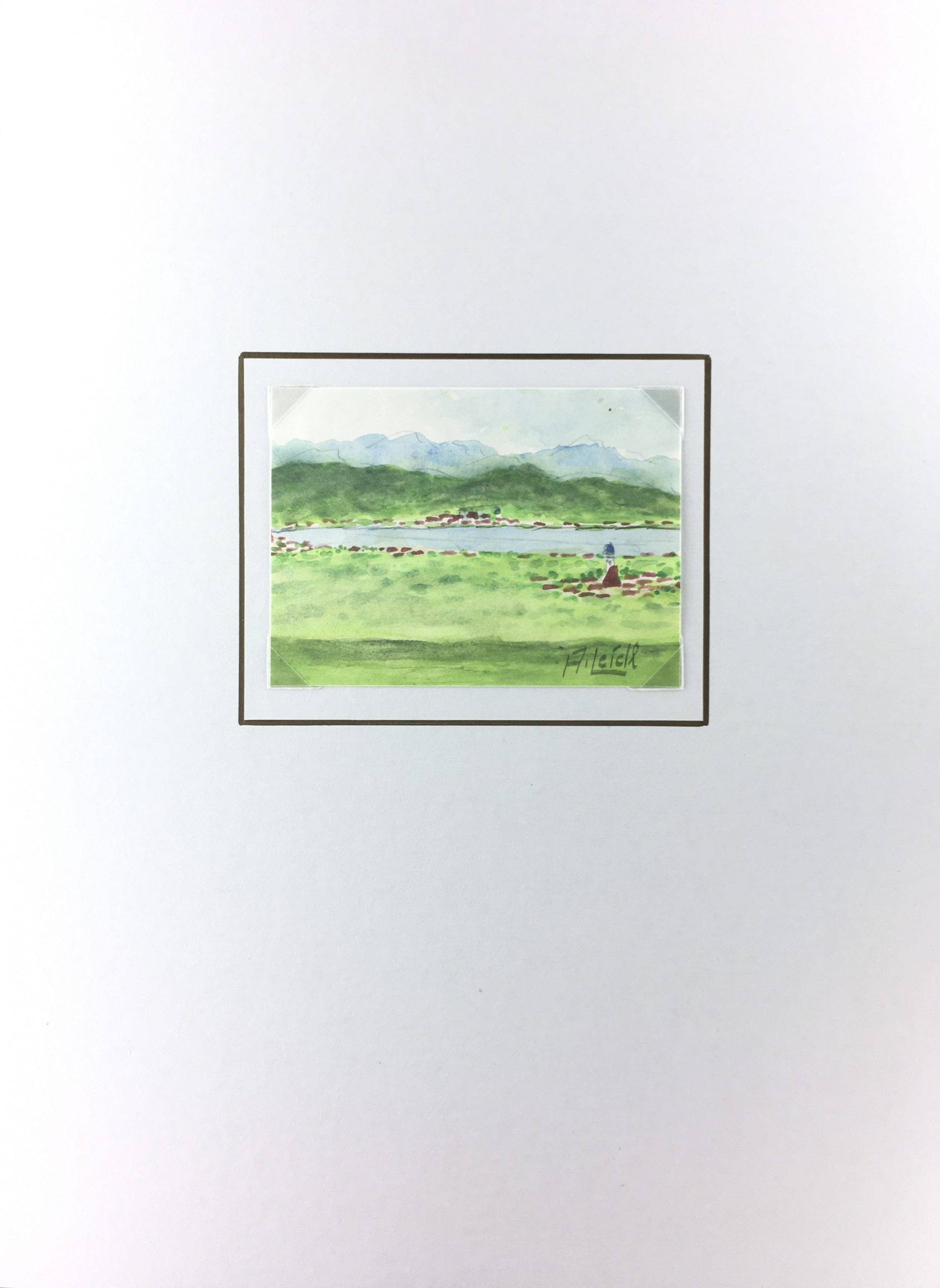 Original Art on paper displayed on a white mat with a gold border. Mat fits a standard-size frame. Archival plastic sleeve and Certificate of Authenticity included. Original Art, 5.25″W x 3.75″H; mat, 12″W x 16″H.