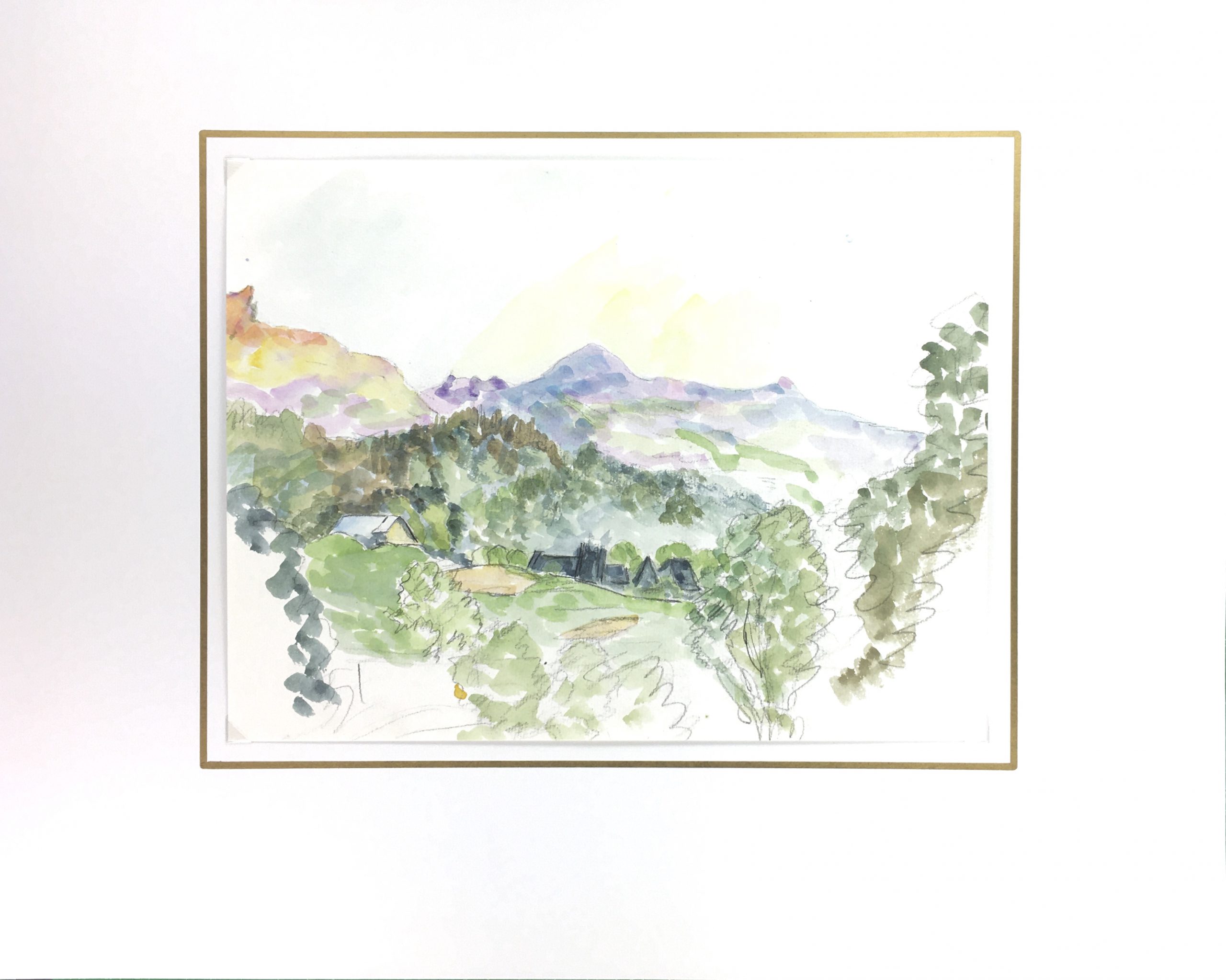 Original Art on paper displayed on a white mat with a gold border. Mat fits a standard-size frame. Archival plastic sleeve and Certificate of Authenticity included. Original Art, 12.25″W x 9.25″H; mat, 20″W x 16″H.