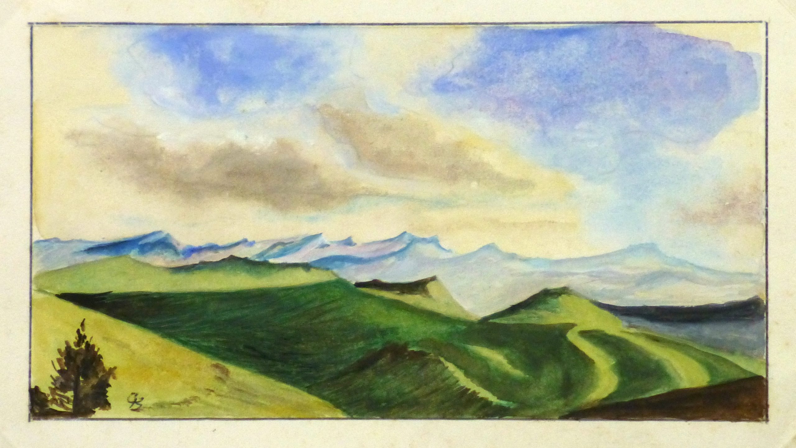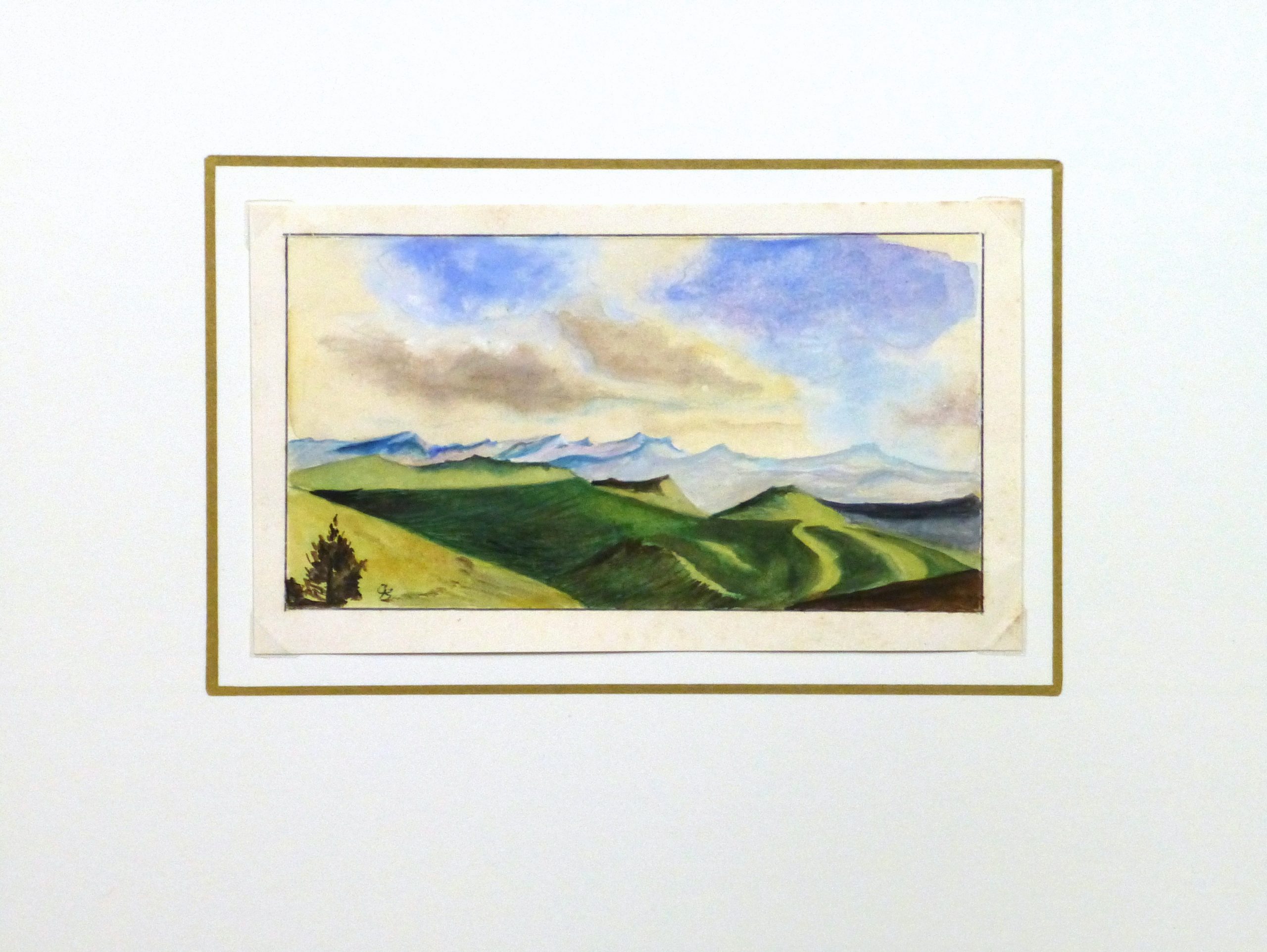 Small watercolor landscape of a sweeping view of small mountains by English artist G. Buckthorp, circa 1980. Initialed lower left.