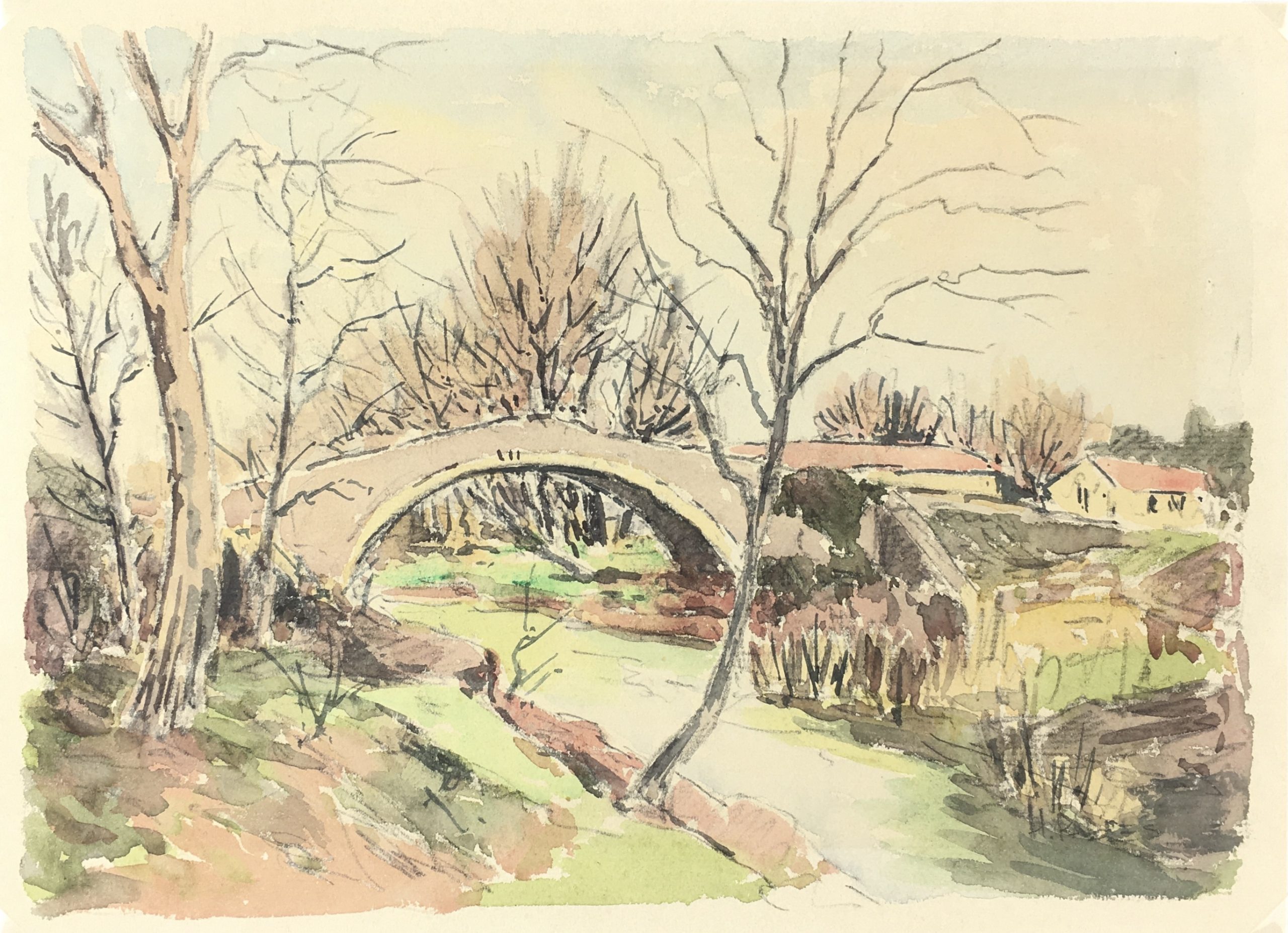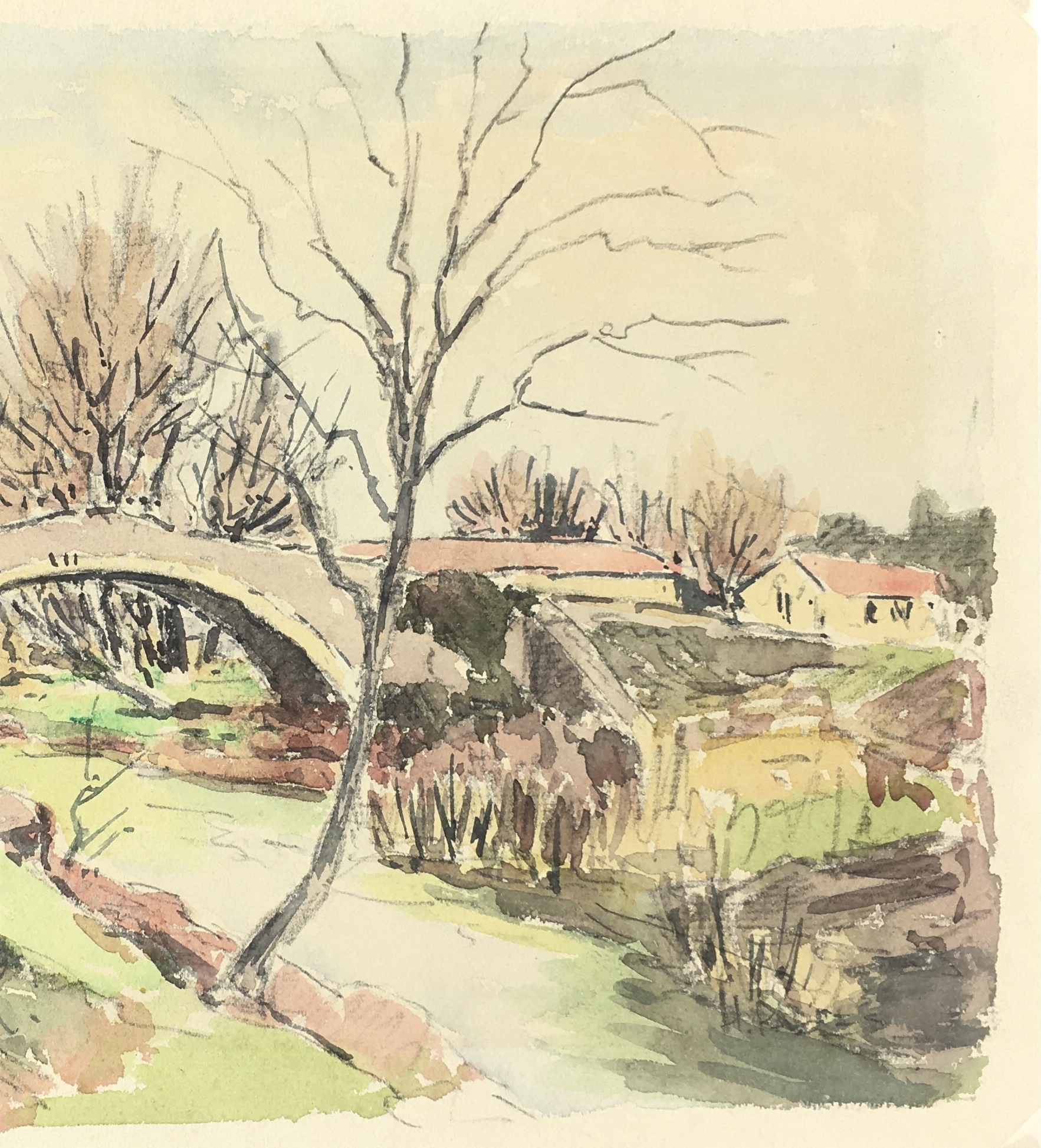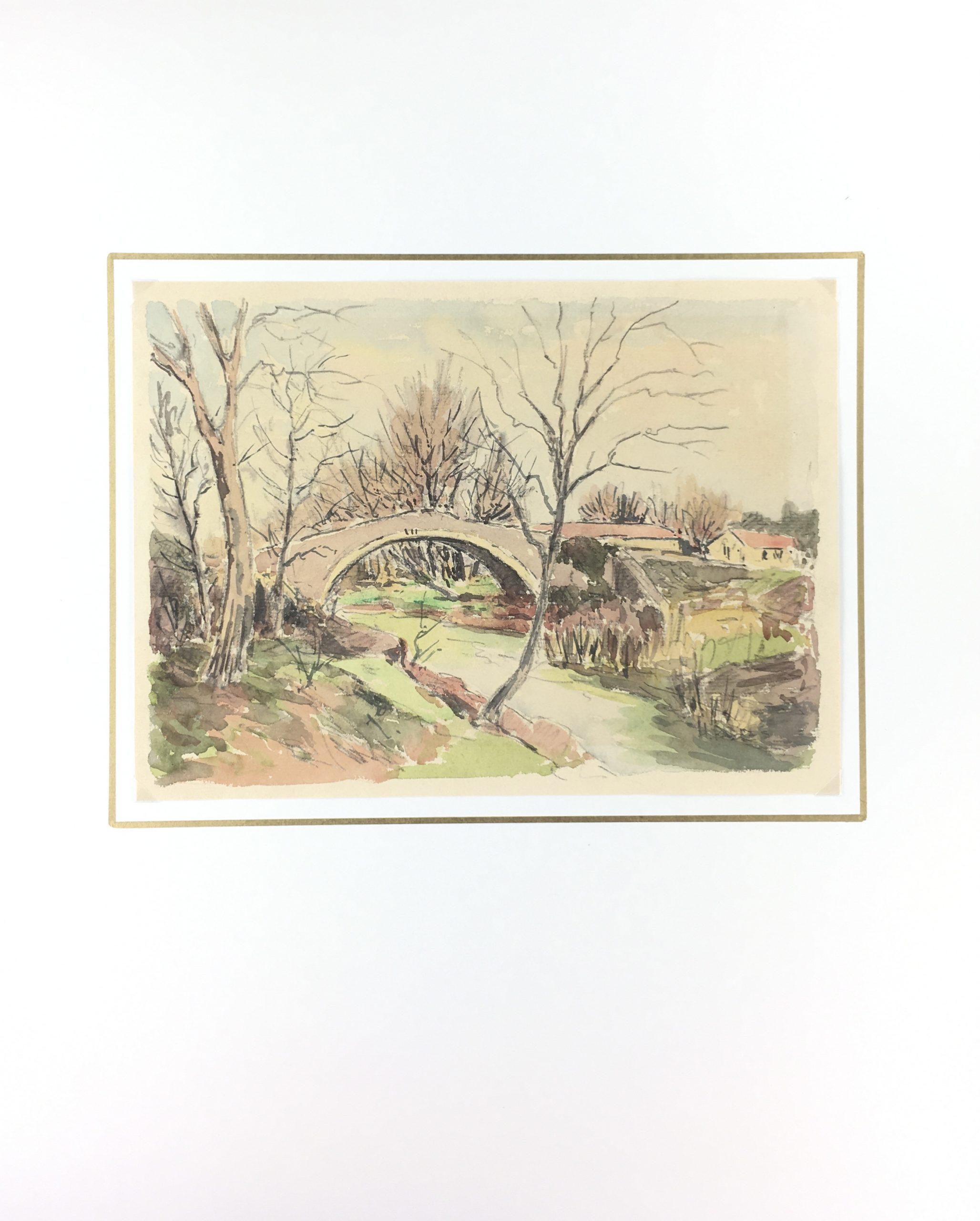 Original Art on paper displayed on a white mat with a gold border. Mat fits a standard-size frame. Archival plastic sleeve and Certificate of Authenticity included. Original Art, 11″W x 8″H; mat, 16″W x 20″H.
