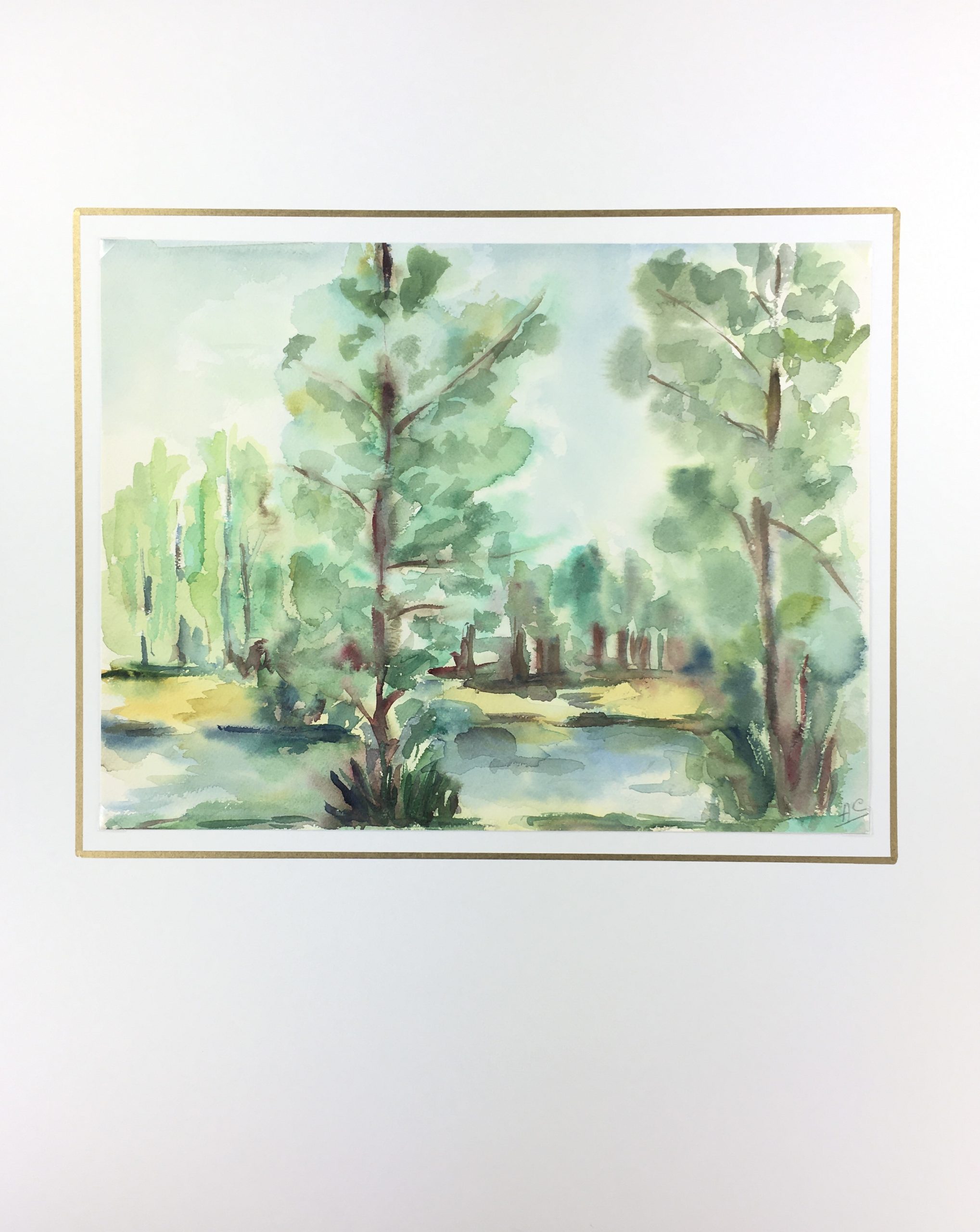 Original Art on paper displayed on a white mat with a gold border. Mat fits a standard-size frame. Archival plastic sleeve and Certificate of Authenticity included. Original Art, 12.25″W x 9.5″H; mat, 16″W x 20″H.