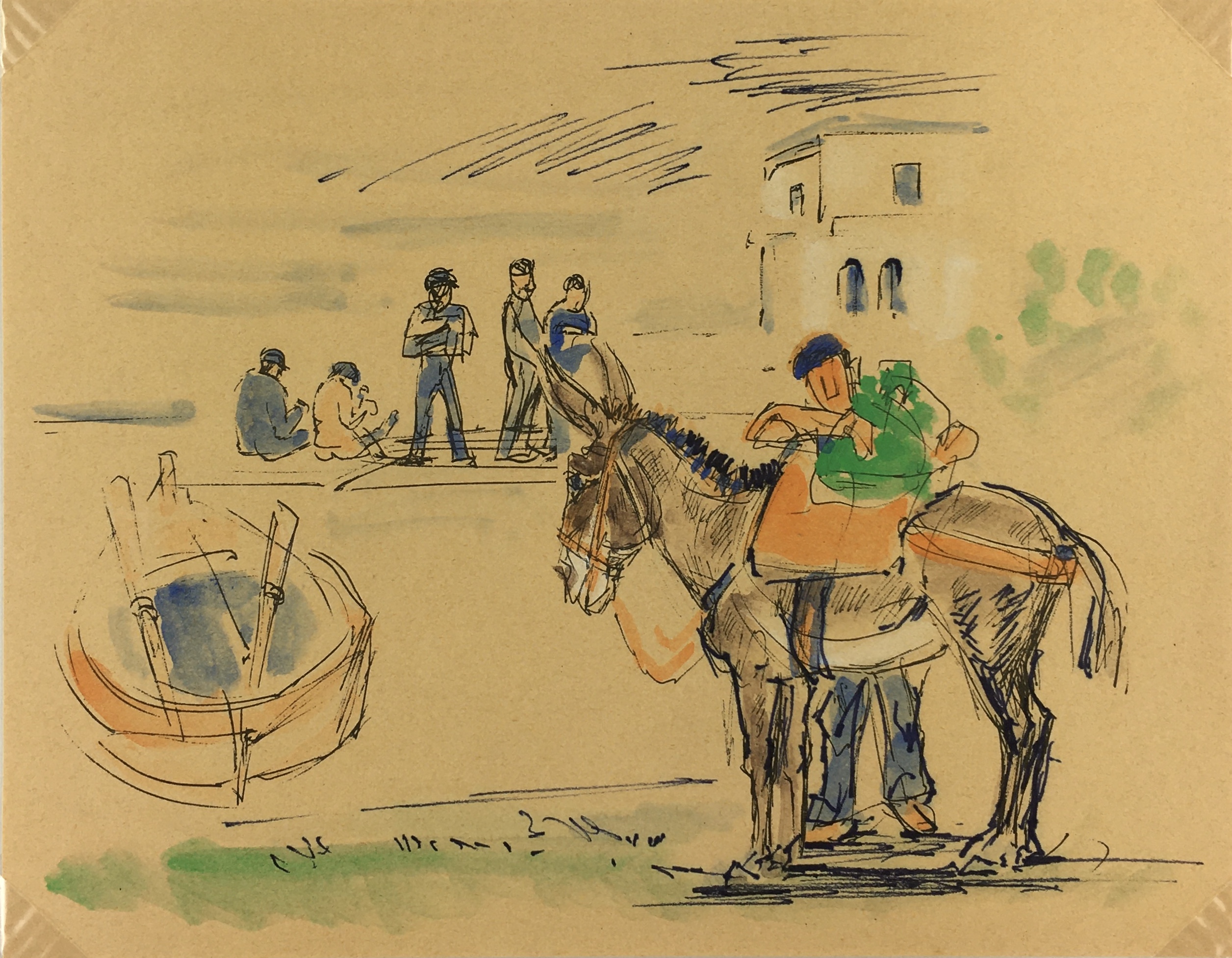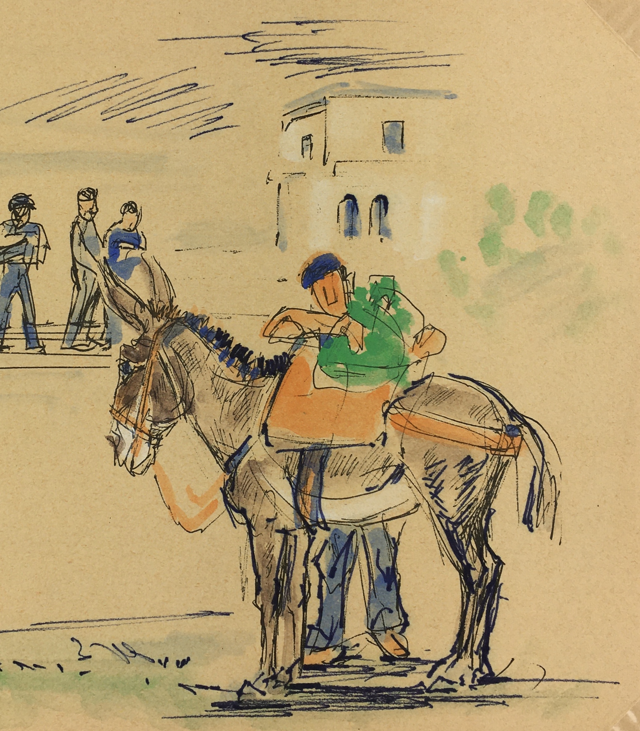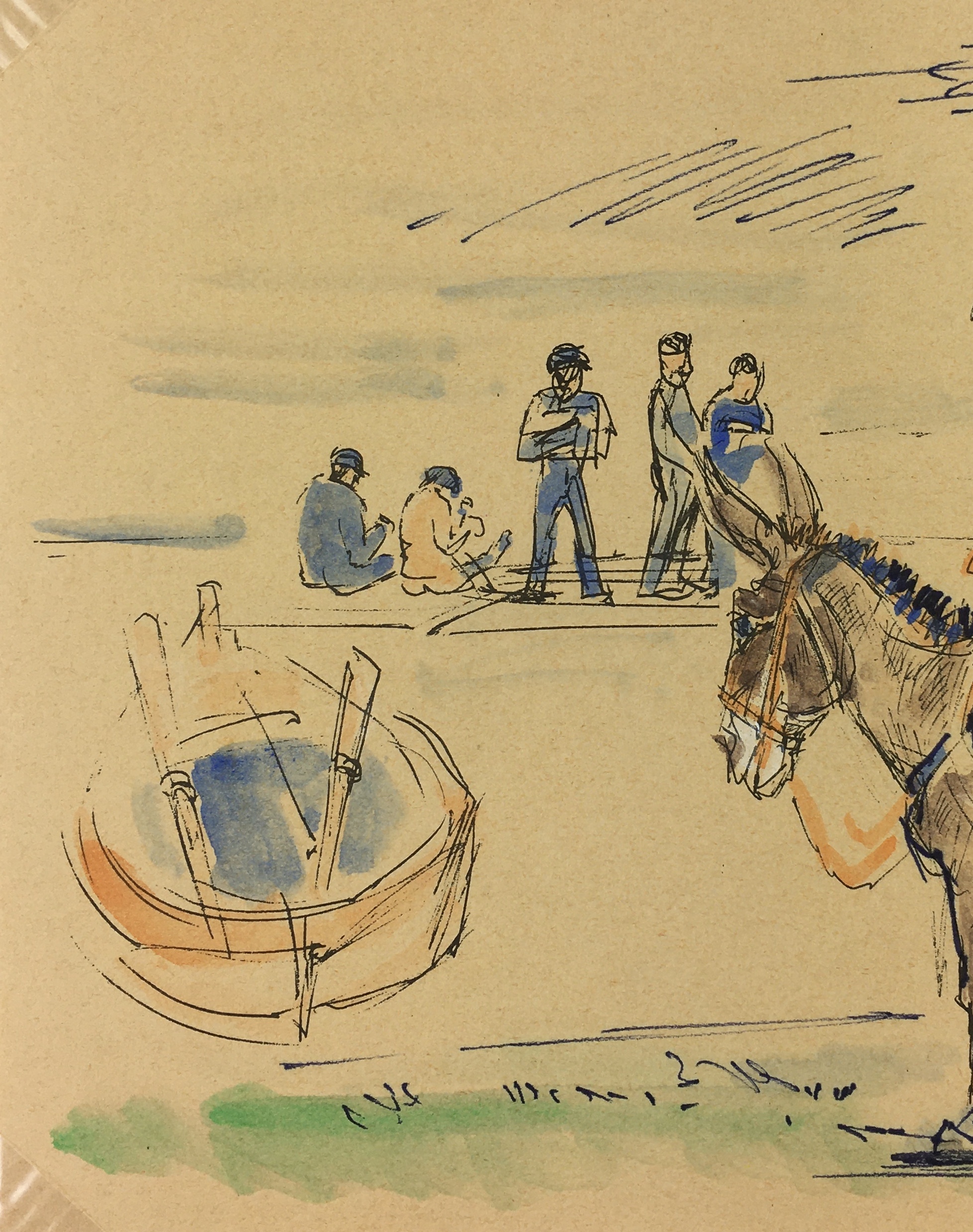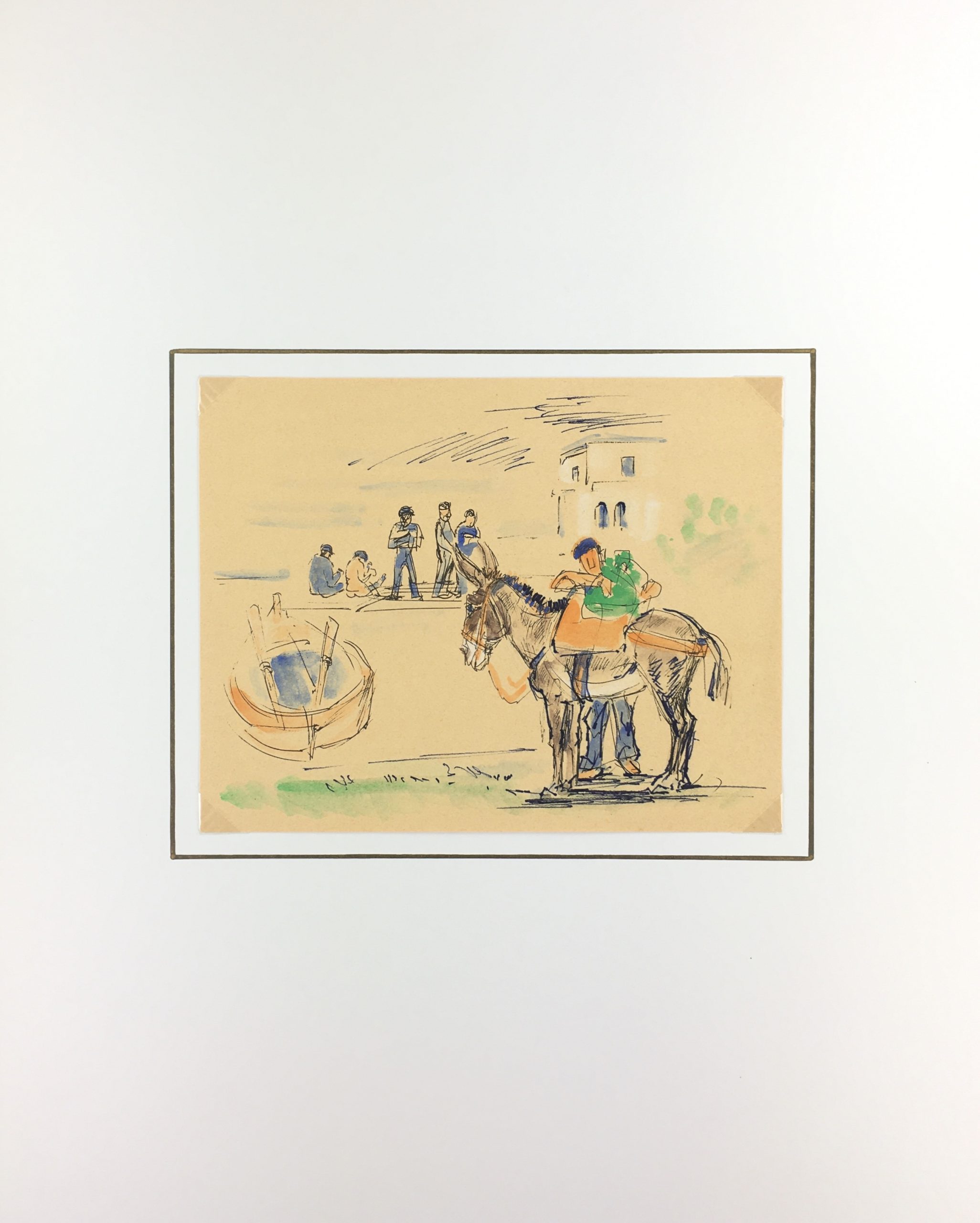 Original Art on paper displayed on a white mat with a gold border. Mat fits a standard-size frame. Archival plastic sleeve and Certificate of Authenticity included. Original Art, 9.5″W x 7.5″H; mat, 16″W x 20″H.