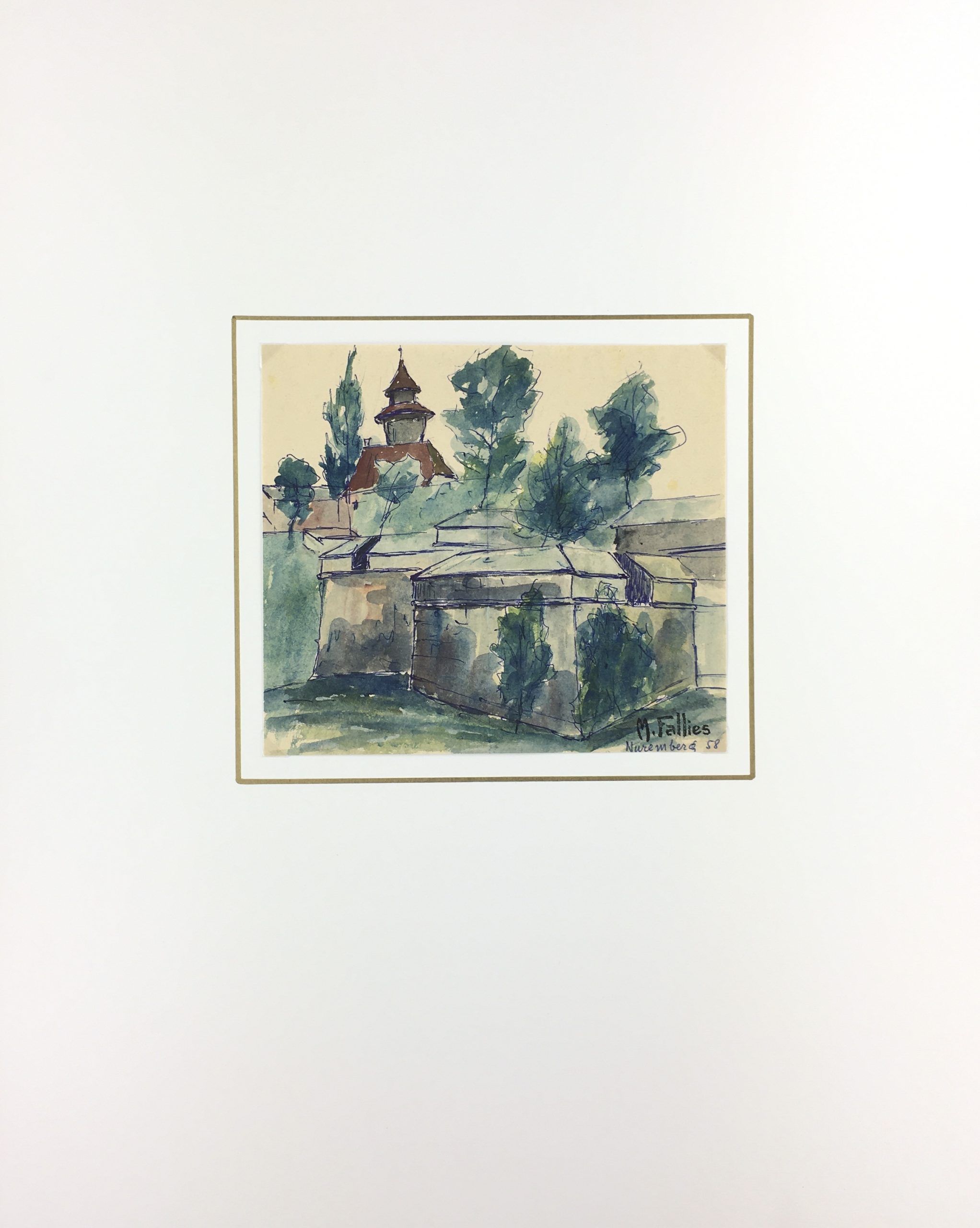 Original Art on paper displayed on a white mat with a gold border. Mat fits a standard-size frame. Archival plastic sleeve and Certificate of Authenticity included. Original Art, 7.5″W x 6.5″H; mat, 16″W x 20″H.