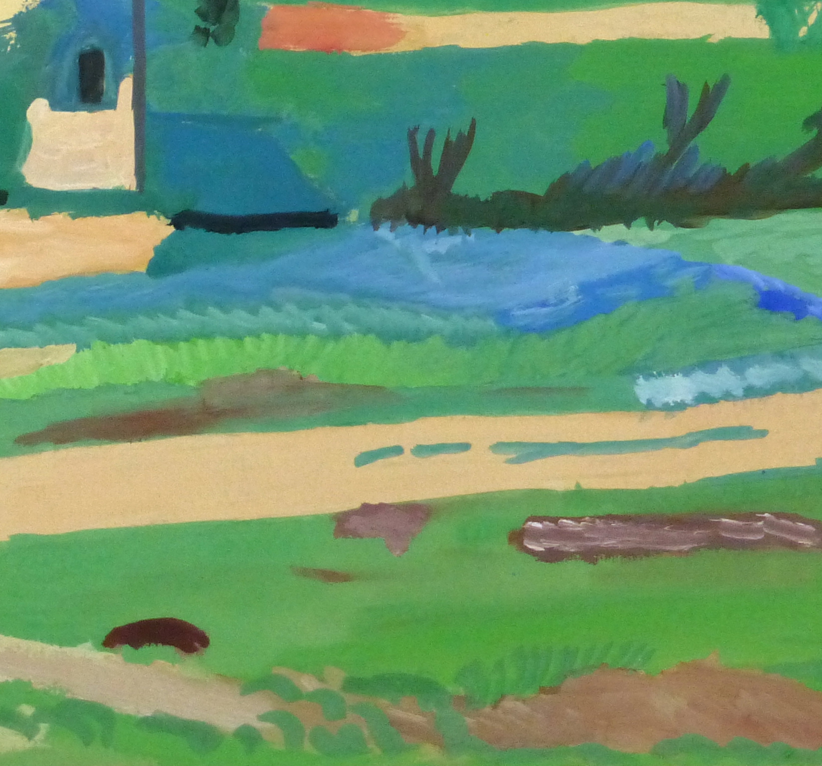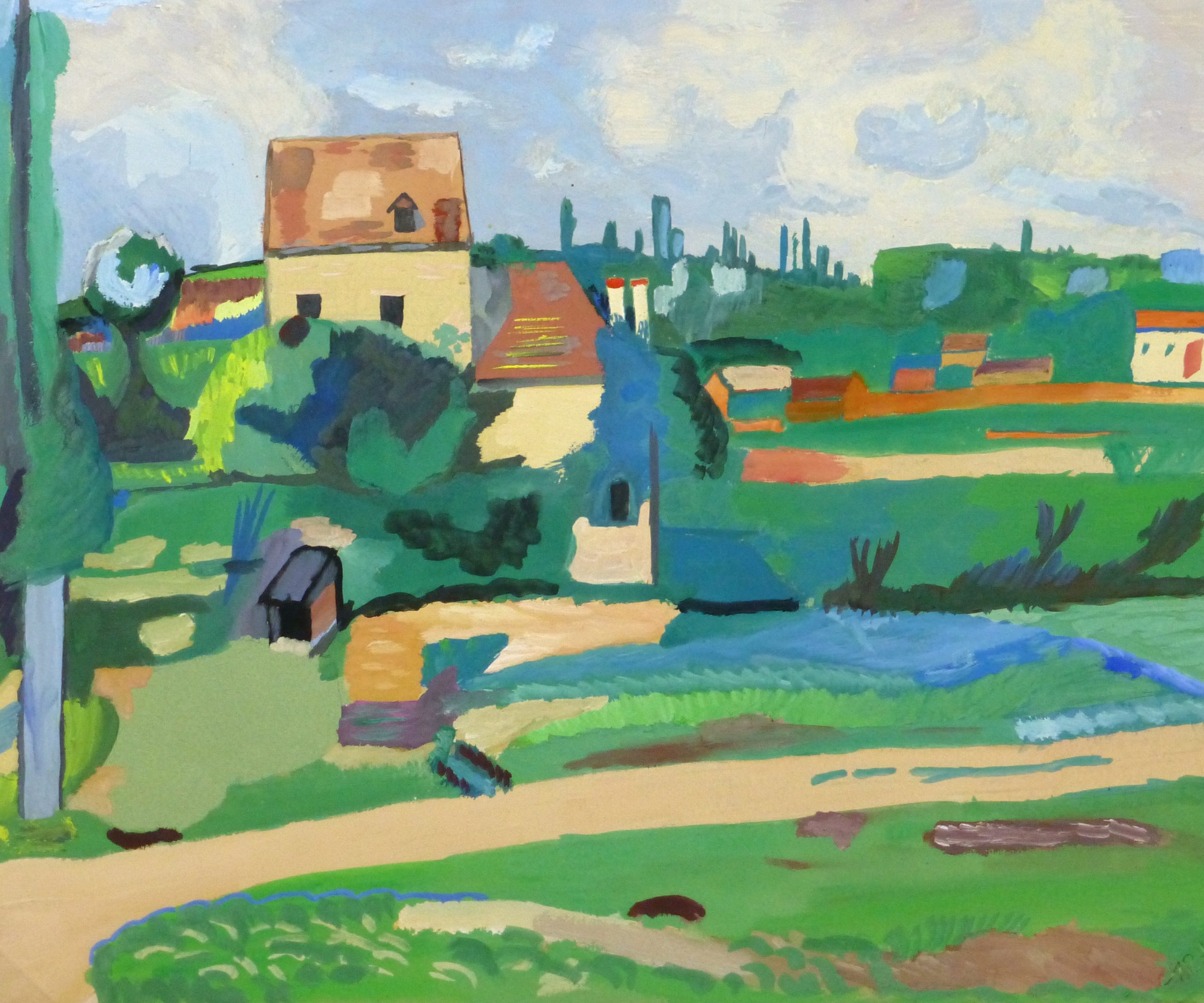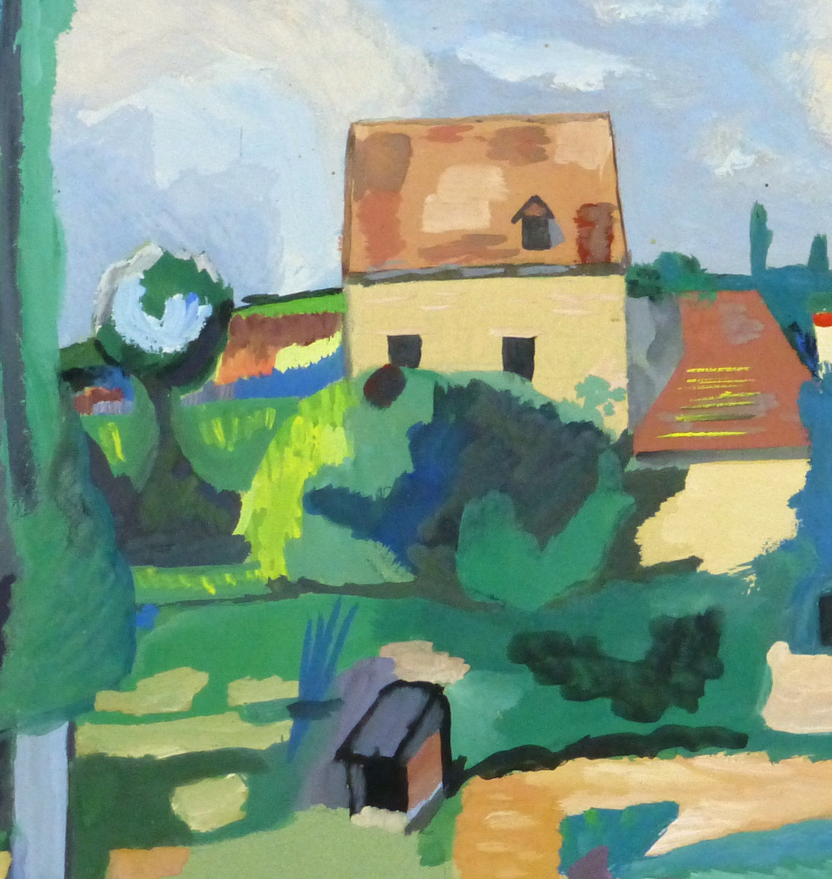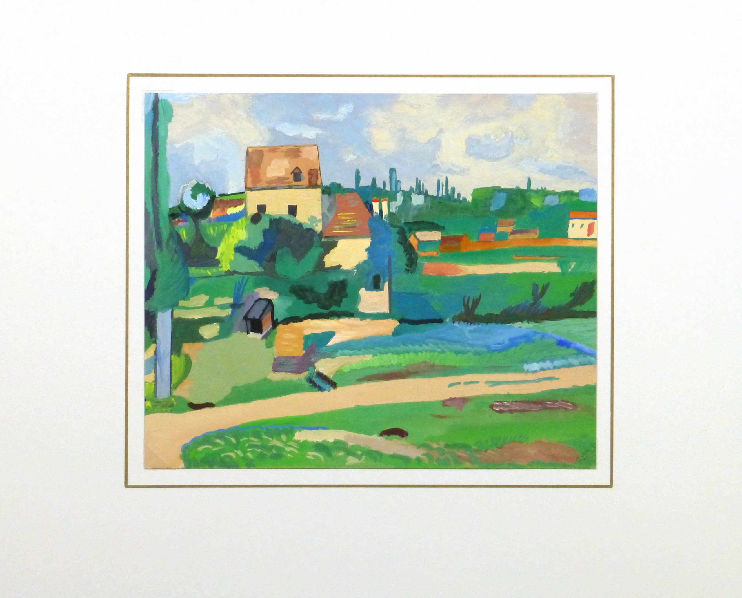 Boldly rendered French gouache landscape of a small village in a bucolic setting, circa 1930.