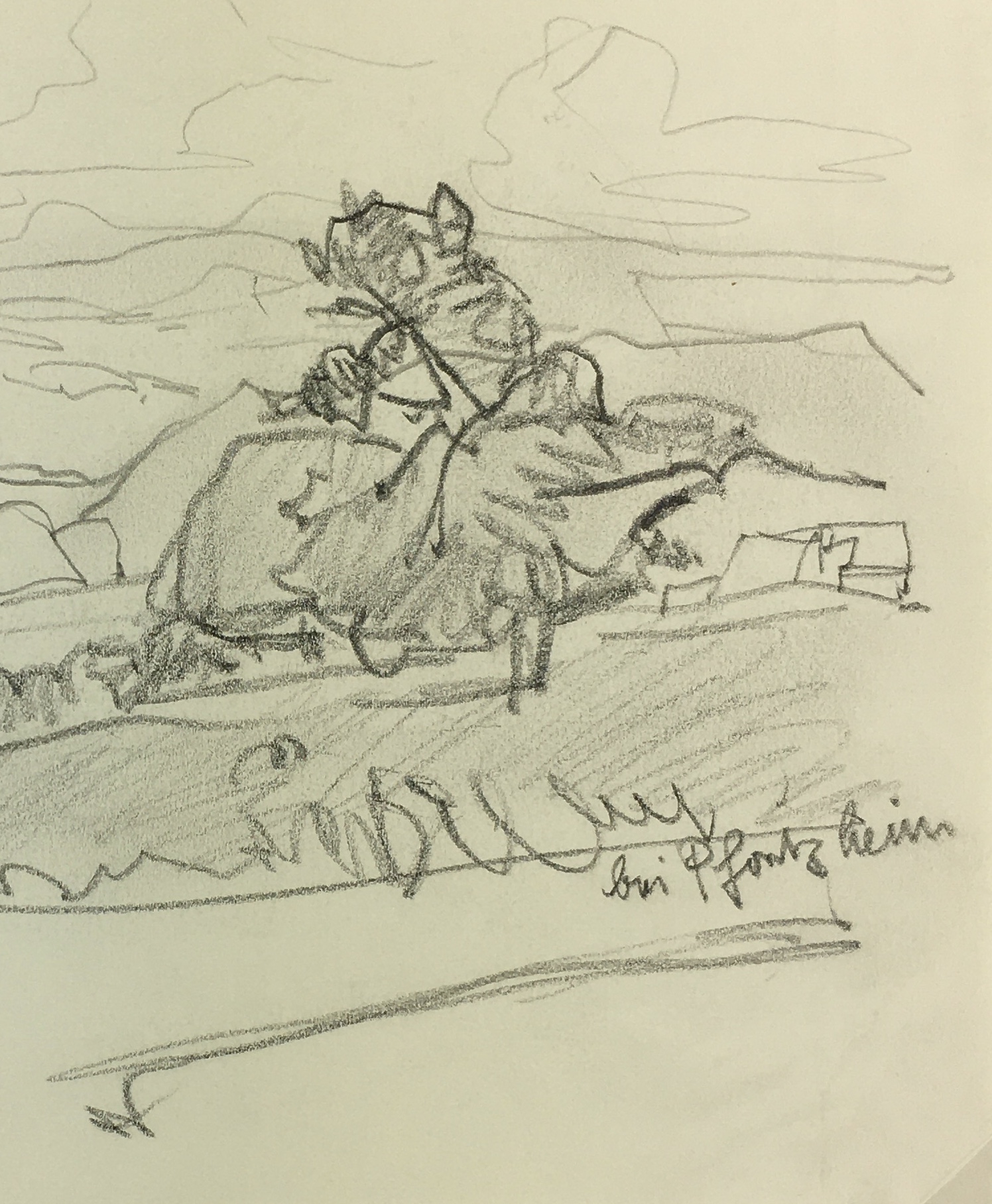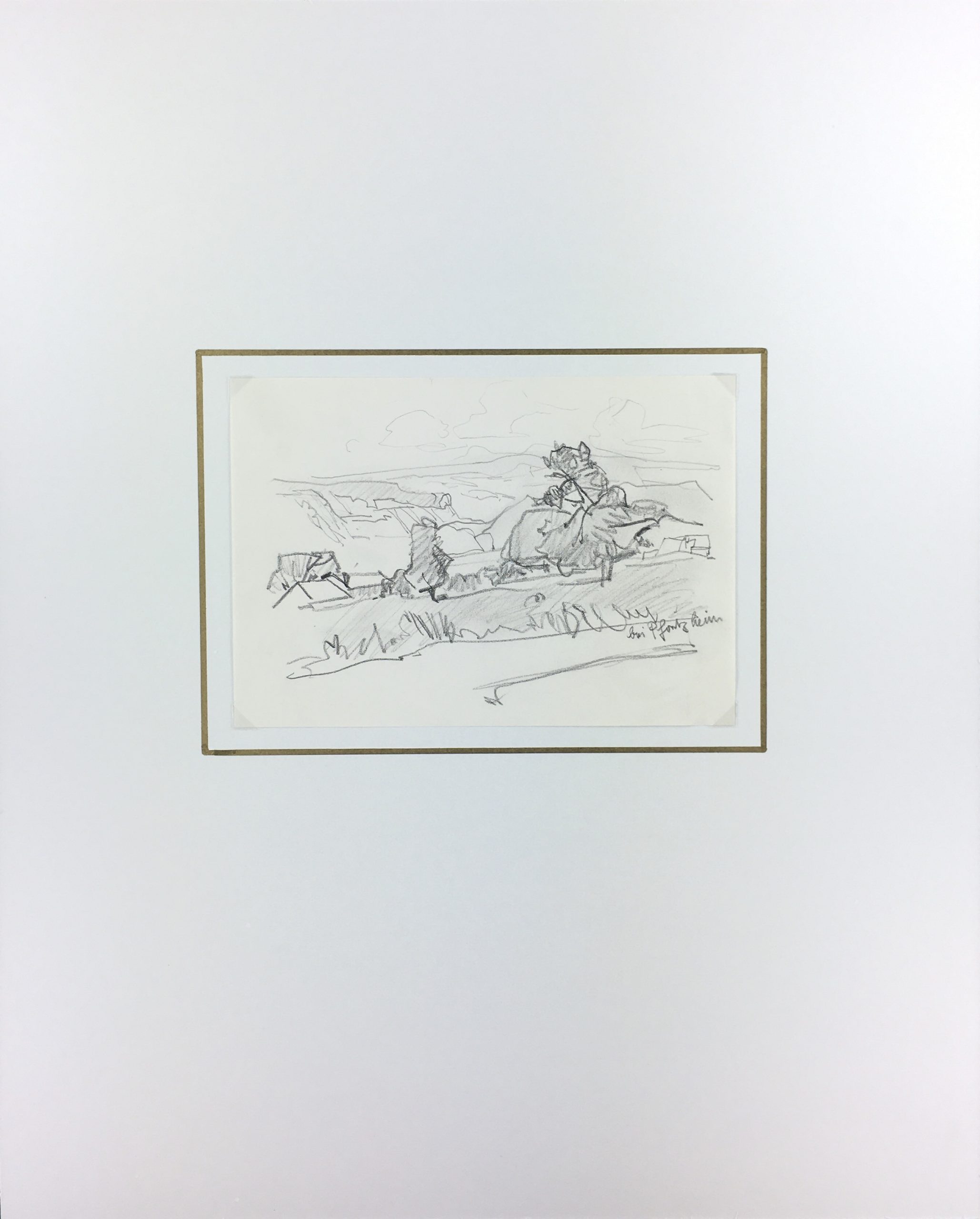 Original Art on paper displayed on a white mat with a gold border. Mat fits a standard-size frame. Archival plastic sleeve and Certificate of Authenticity included. Original Art, 8.25″W x 5.75″H; mat, 16″W x 20″H.