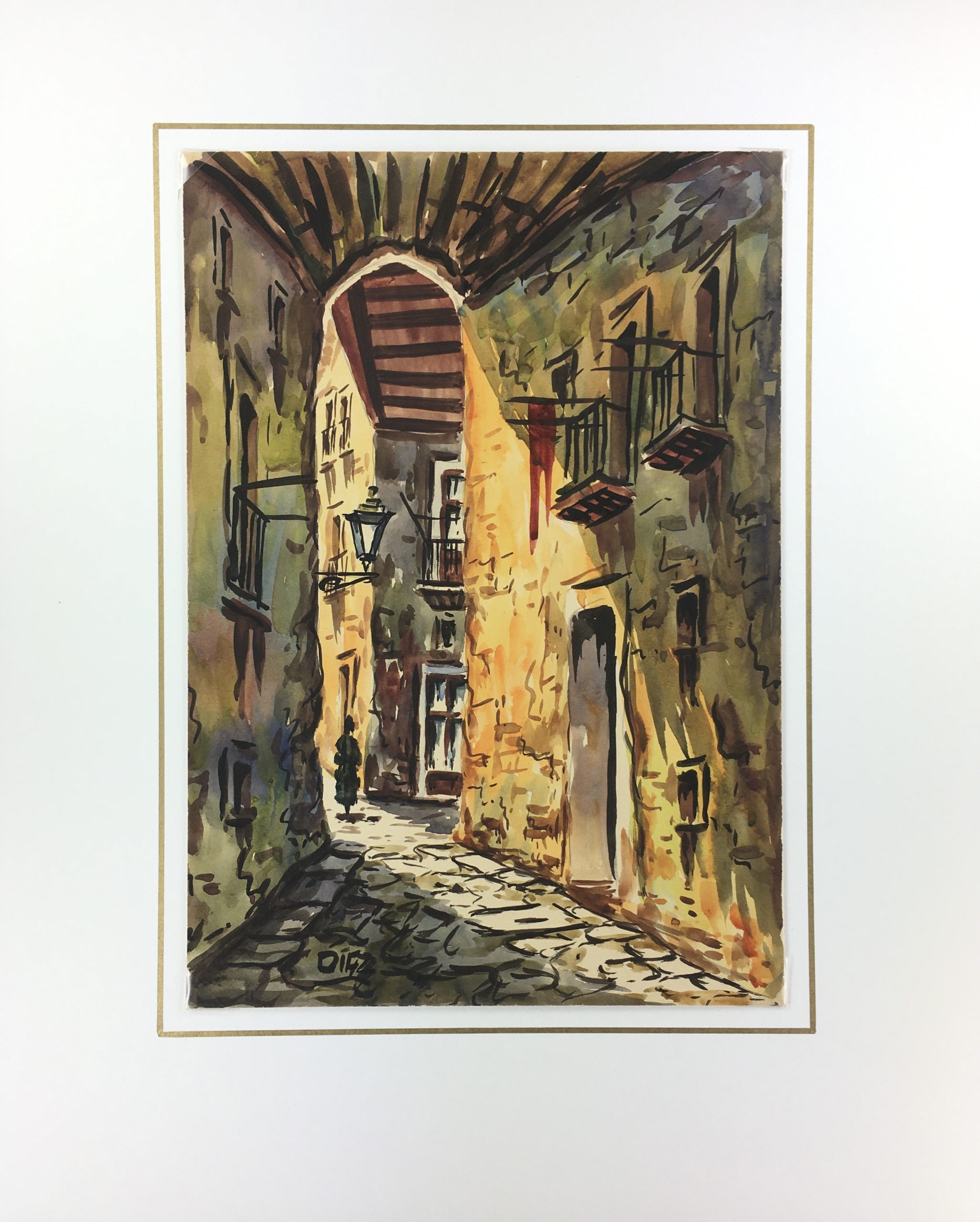 Original Art on paper displayed on a white mat with a gold border. Mat fits a standard-size frame. Archival plastic sleeve and Certificate of Authenticity included. Original Art, 9.5″W x 14″H; mat, 16″W x 20″H.