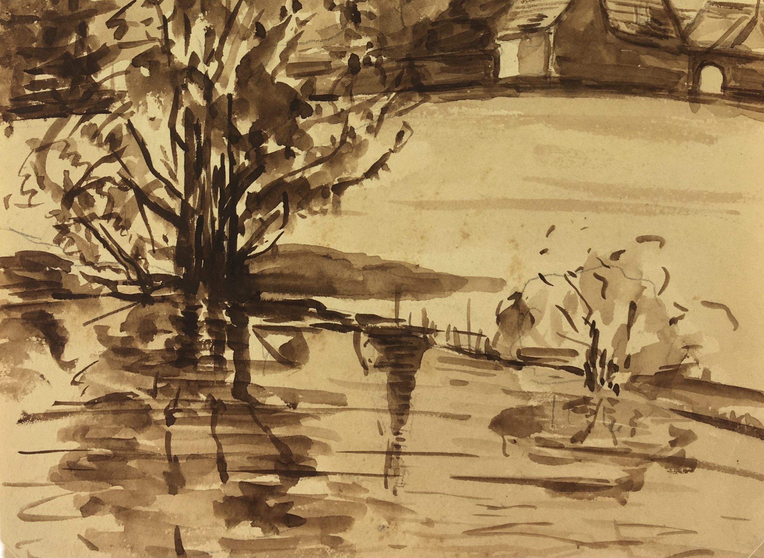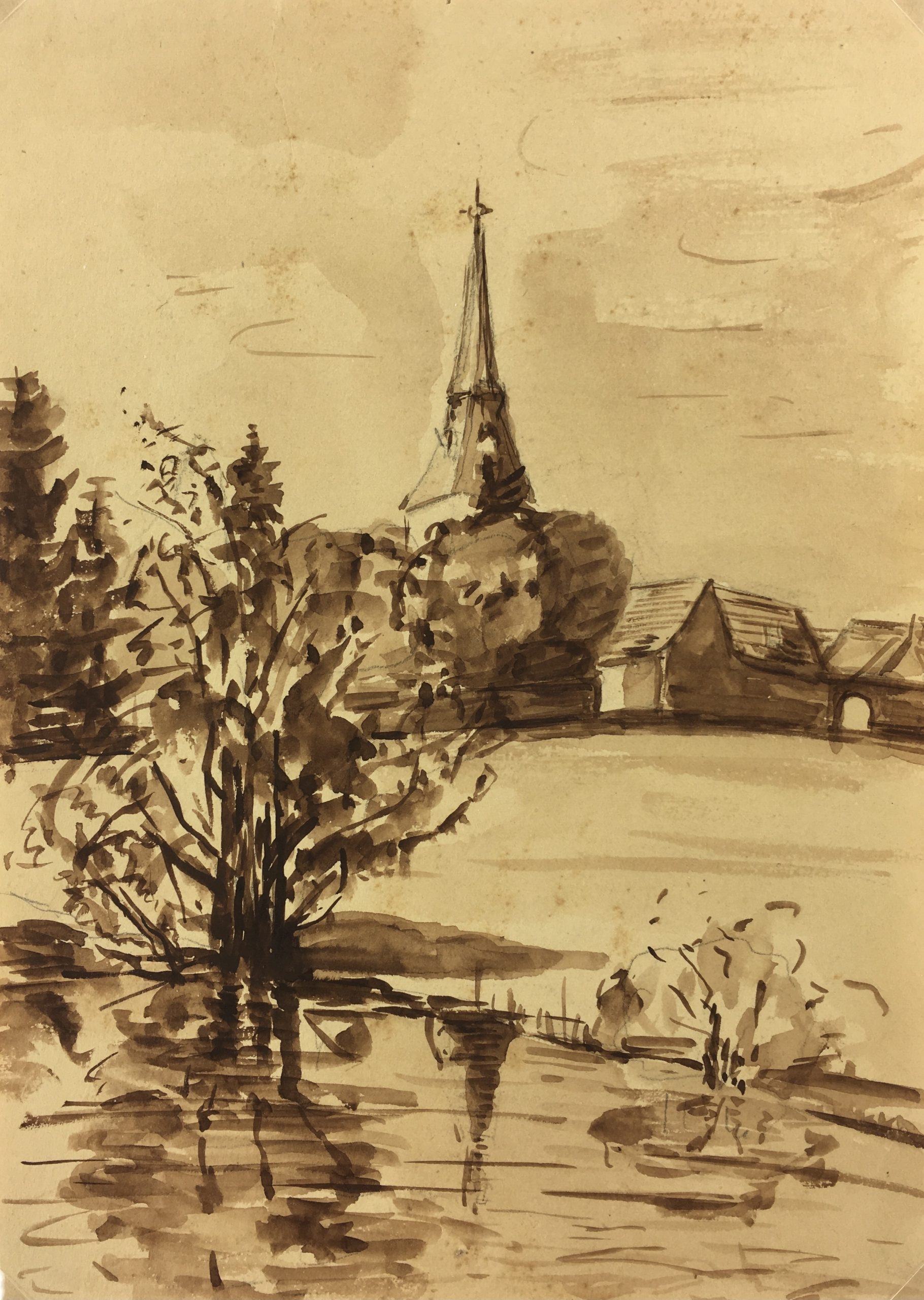 Original Art on paper displayed on a white mat with a gold border. Mat fits a standard-size frame. Archival plastic sleeve and Certificate of Authenticity included. Original Art, 7.5″W x 10″H; mat, 16″W x 20″H.