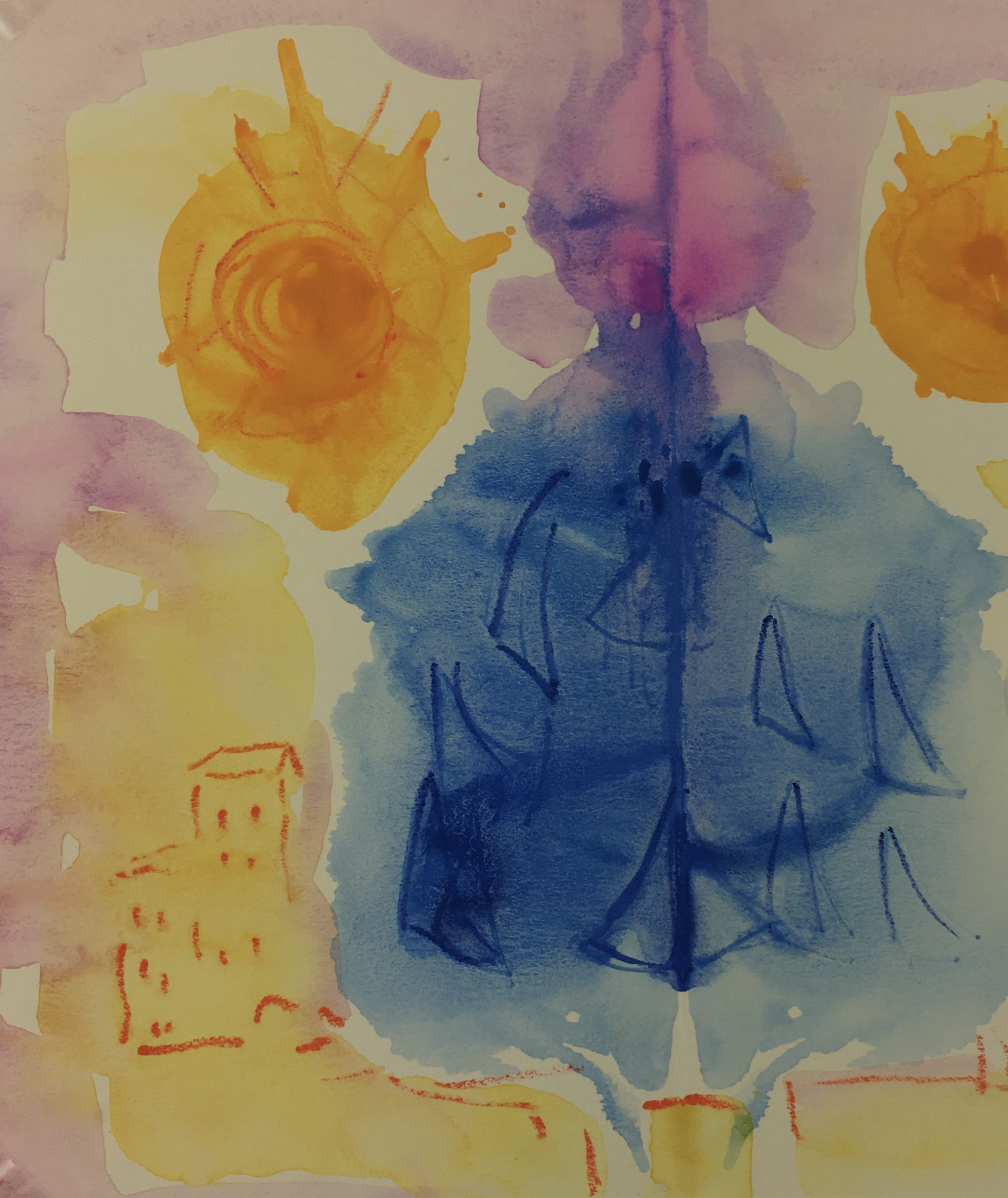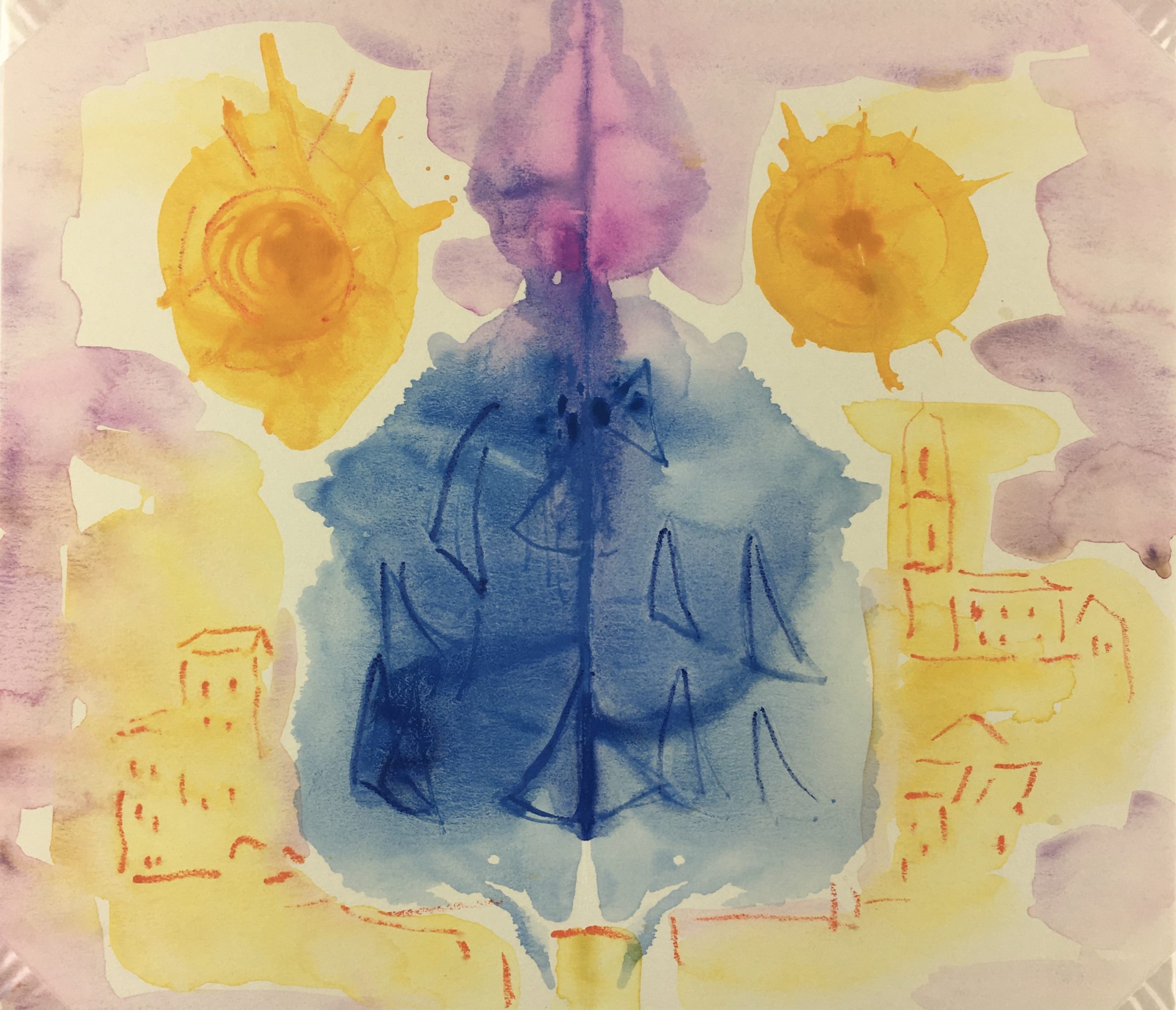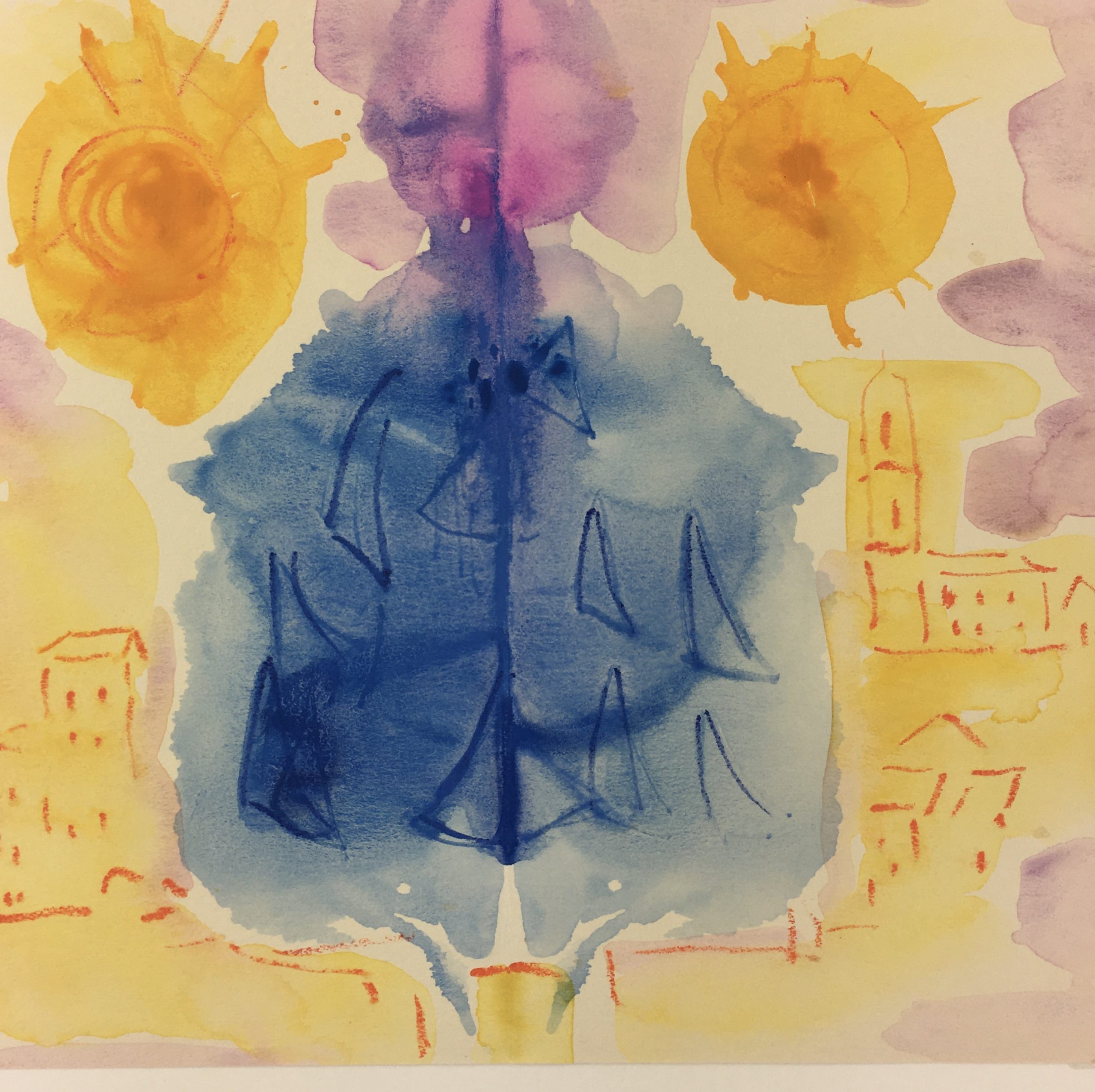 Original Art on paper displayed on a white mat with a gold border. Mat fits a standard-size frame. Archival plastic sleeve and Certificate of Authenticity included. Original Art, 10″W x 8.75″H; mat, 16″W x 20″H.