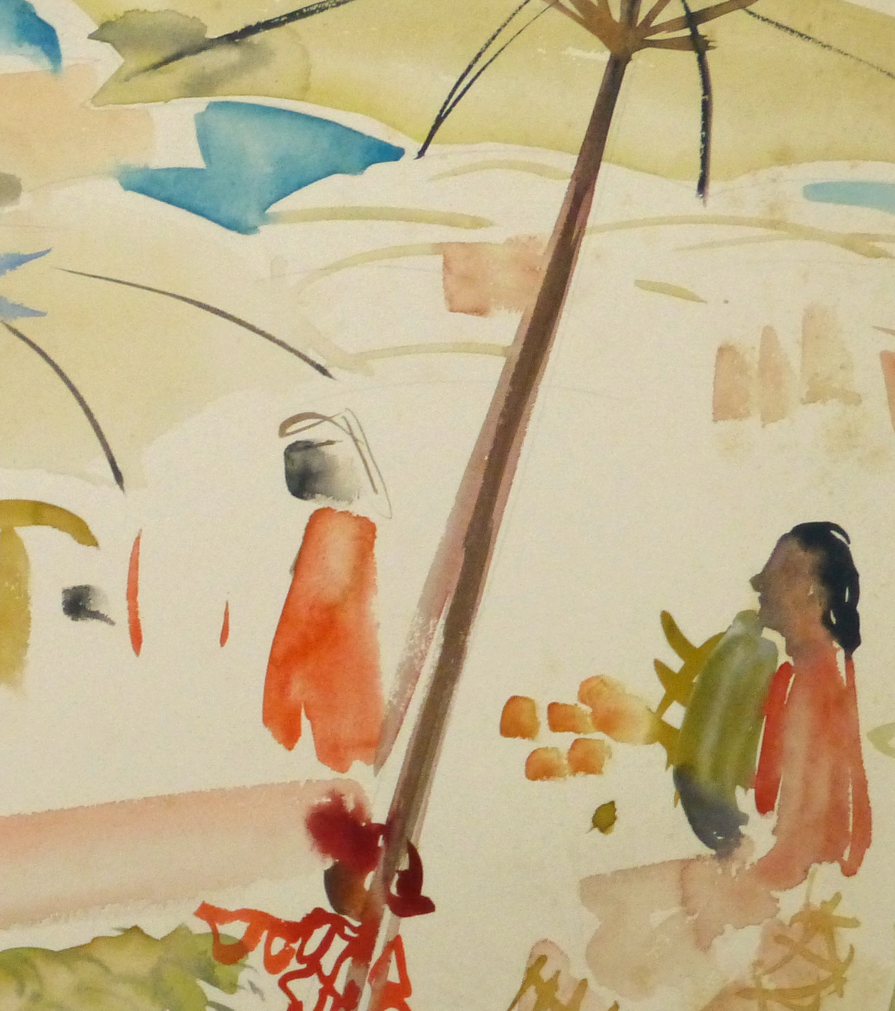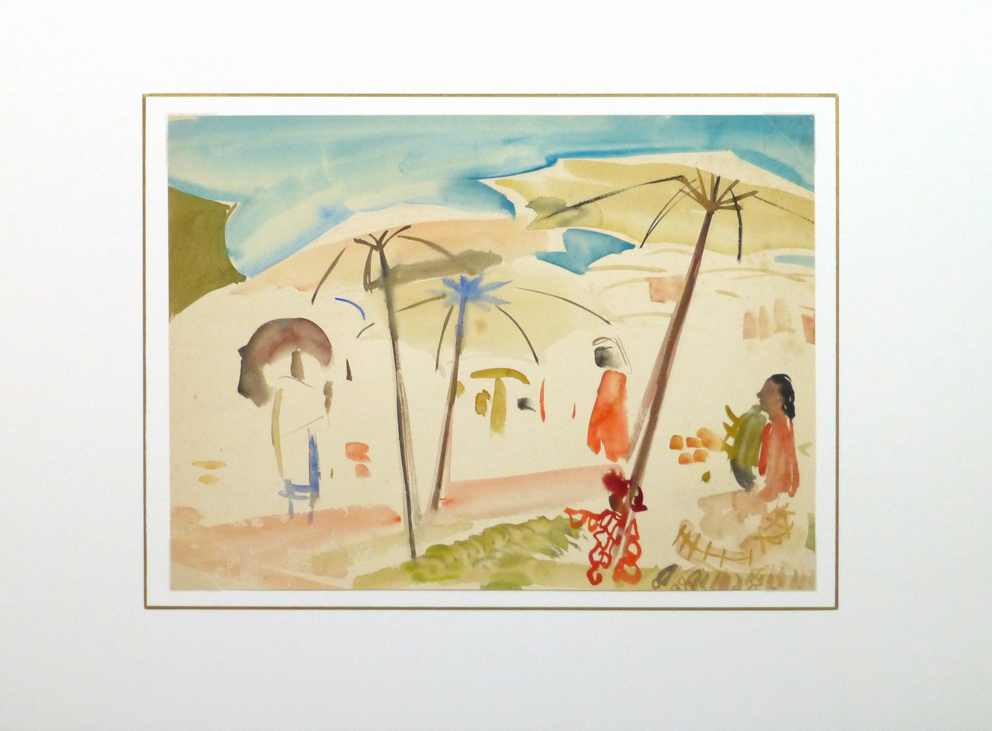 Sunlit watercolor of umbrellas lining a small street market by French artist Stephane Magnard, circa 1950. Unsigned.
