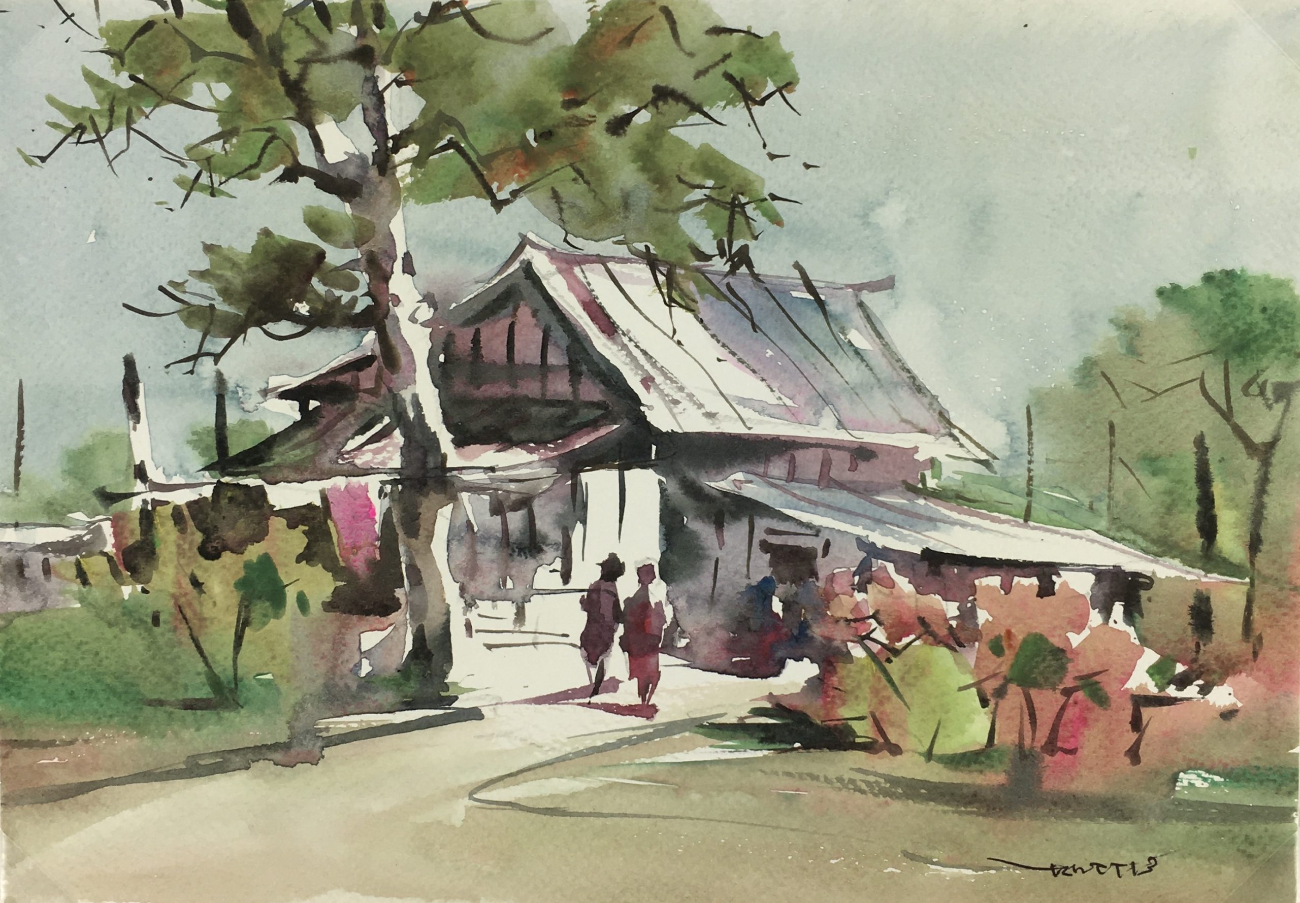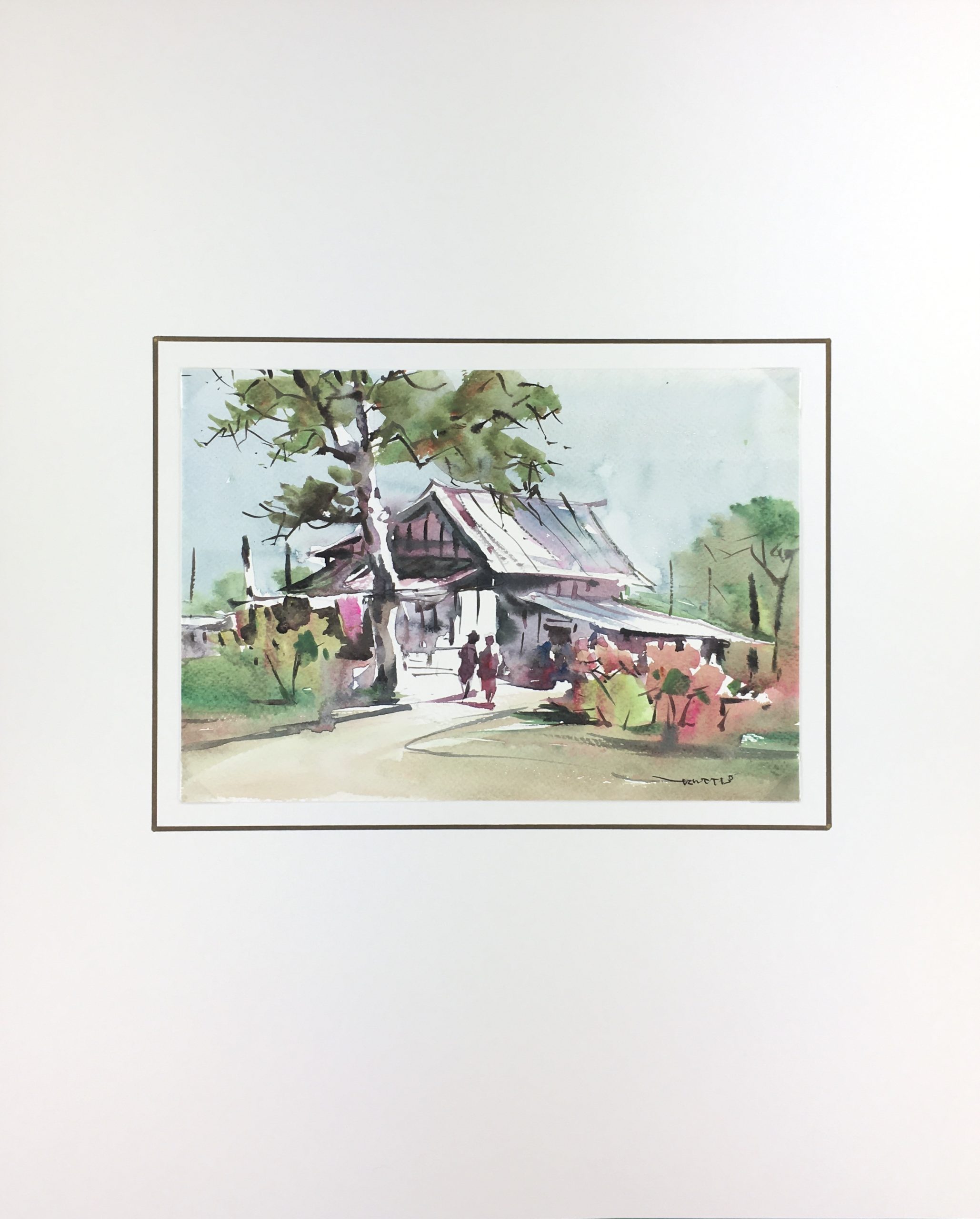 Original Art on paper displayed on a white mat with a gold border. Mat fits a standard-size frame. Archival plastic sleeve and Certificate of Authenticity included. Original Art, 10.25″W x 7″H; mat, 20″W x 16″H.