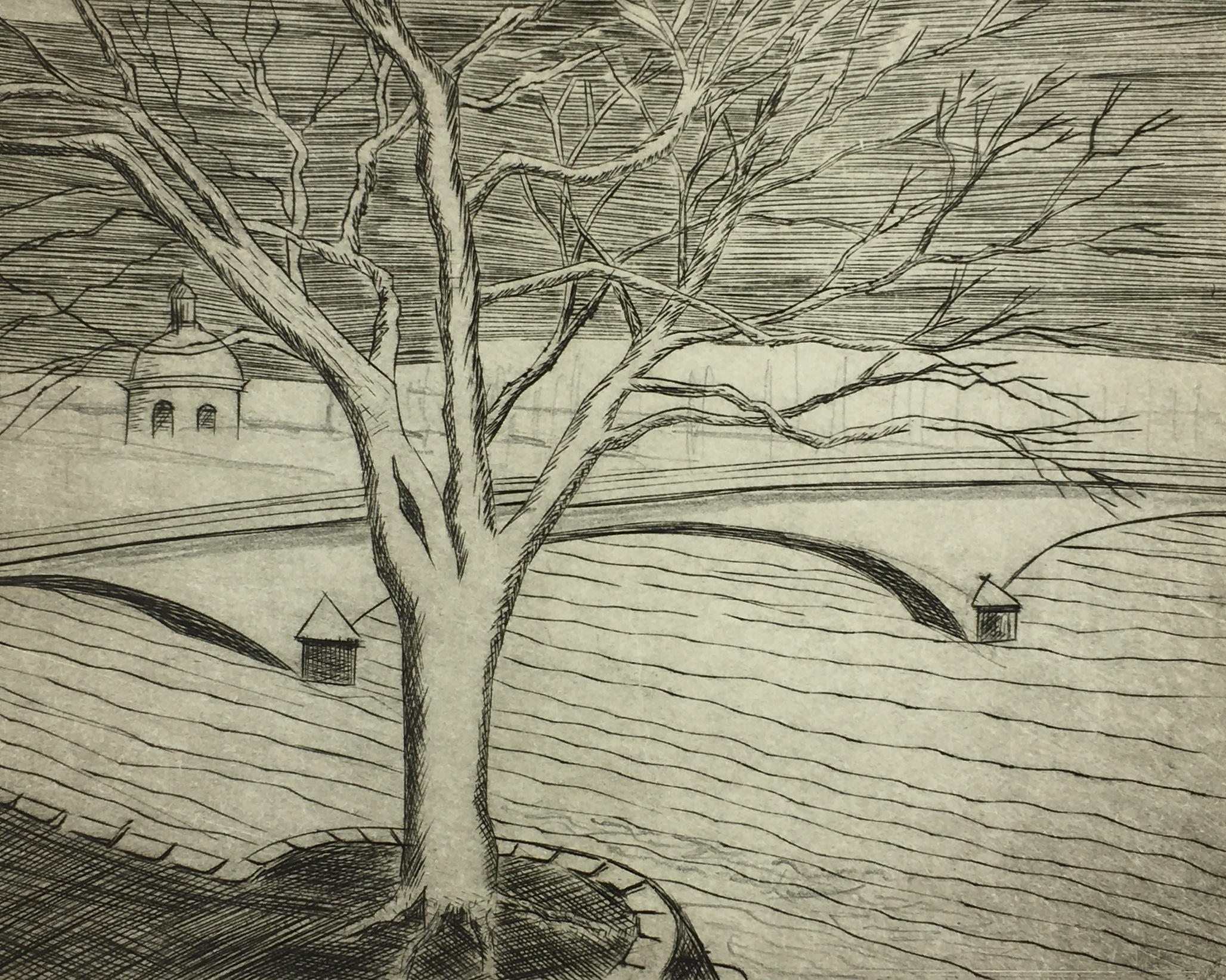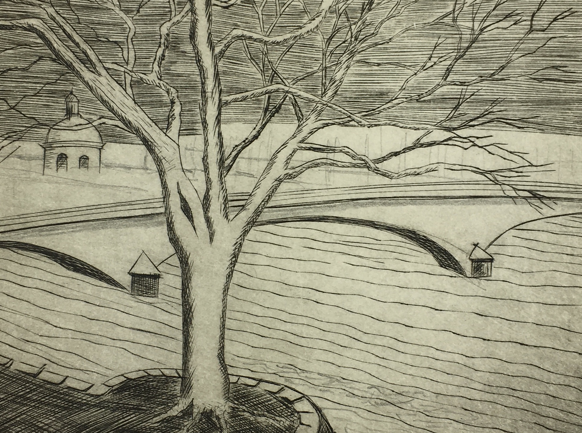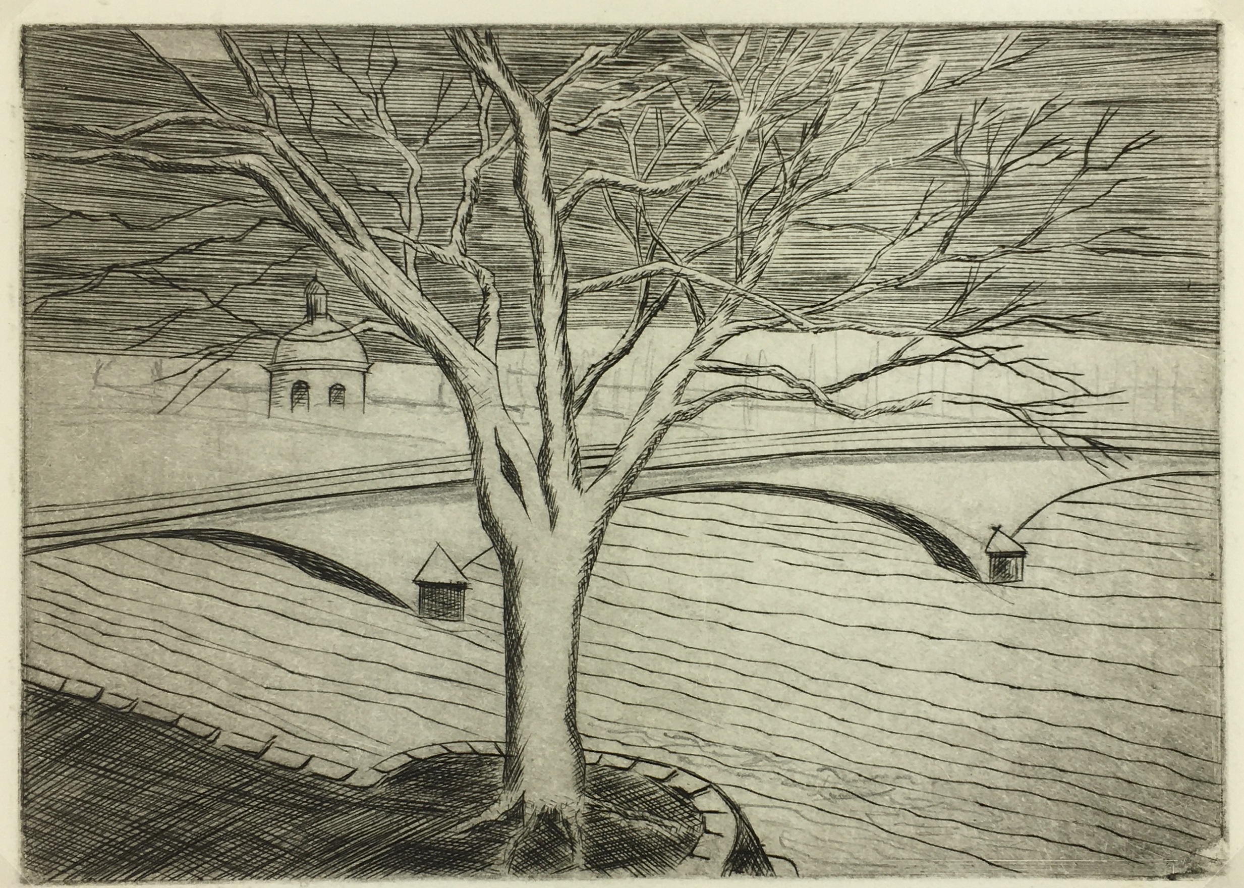 Original Art on paper displayed on a white mat with a gold border. Mat fits a standard-size frame. Archival plastic sleeve and Certificate of Authenticity included. Original Art, 7.5″W x 5.25″H; mat, 16″W x 20″H.