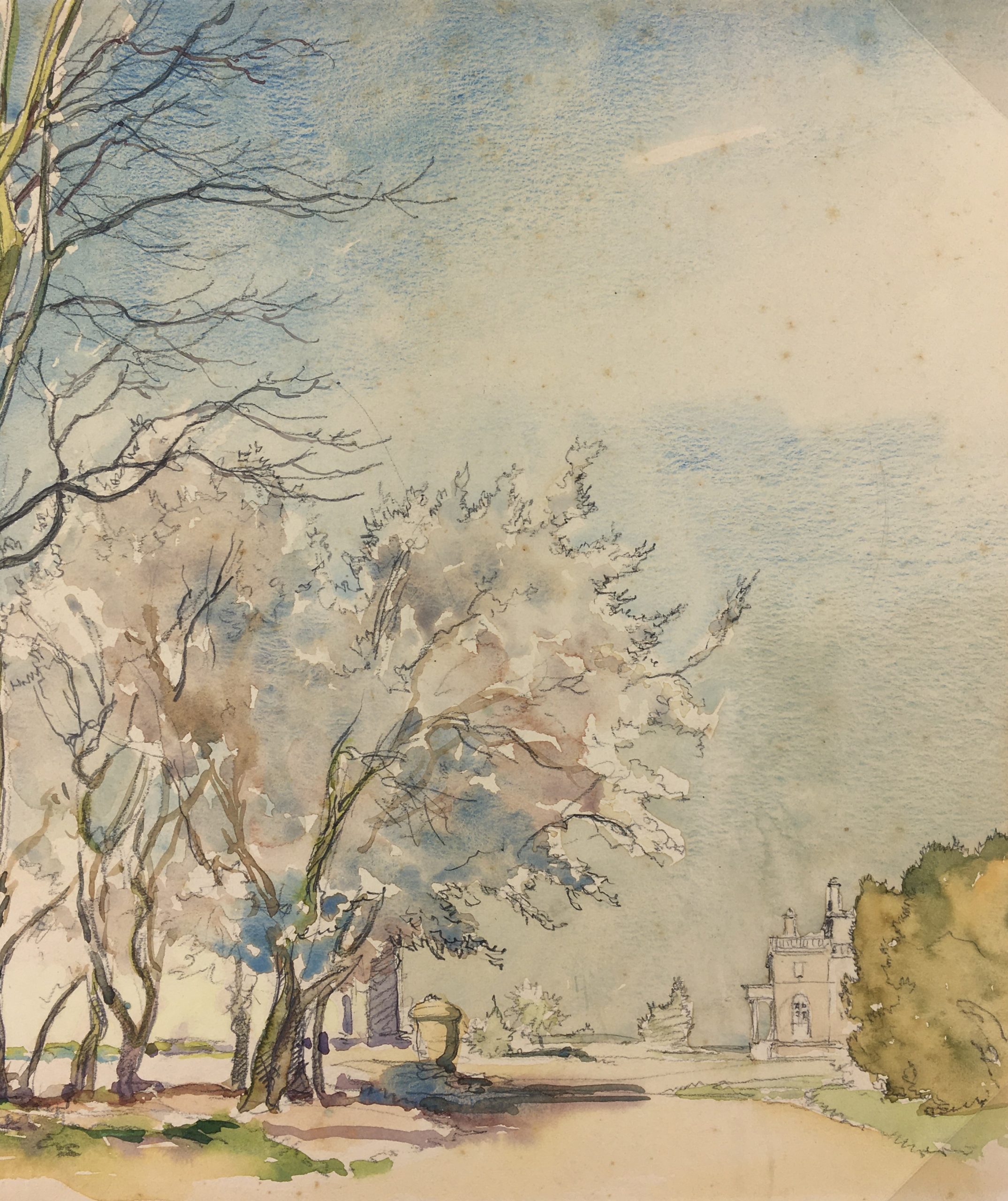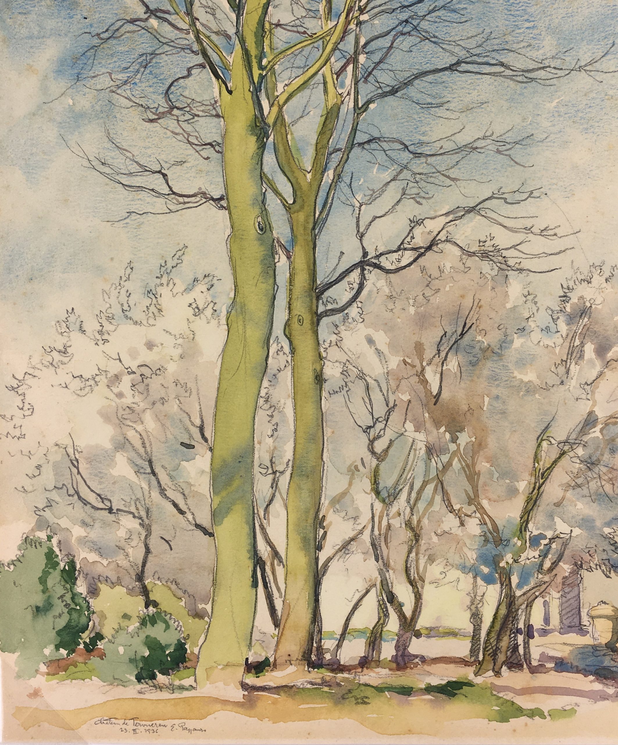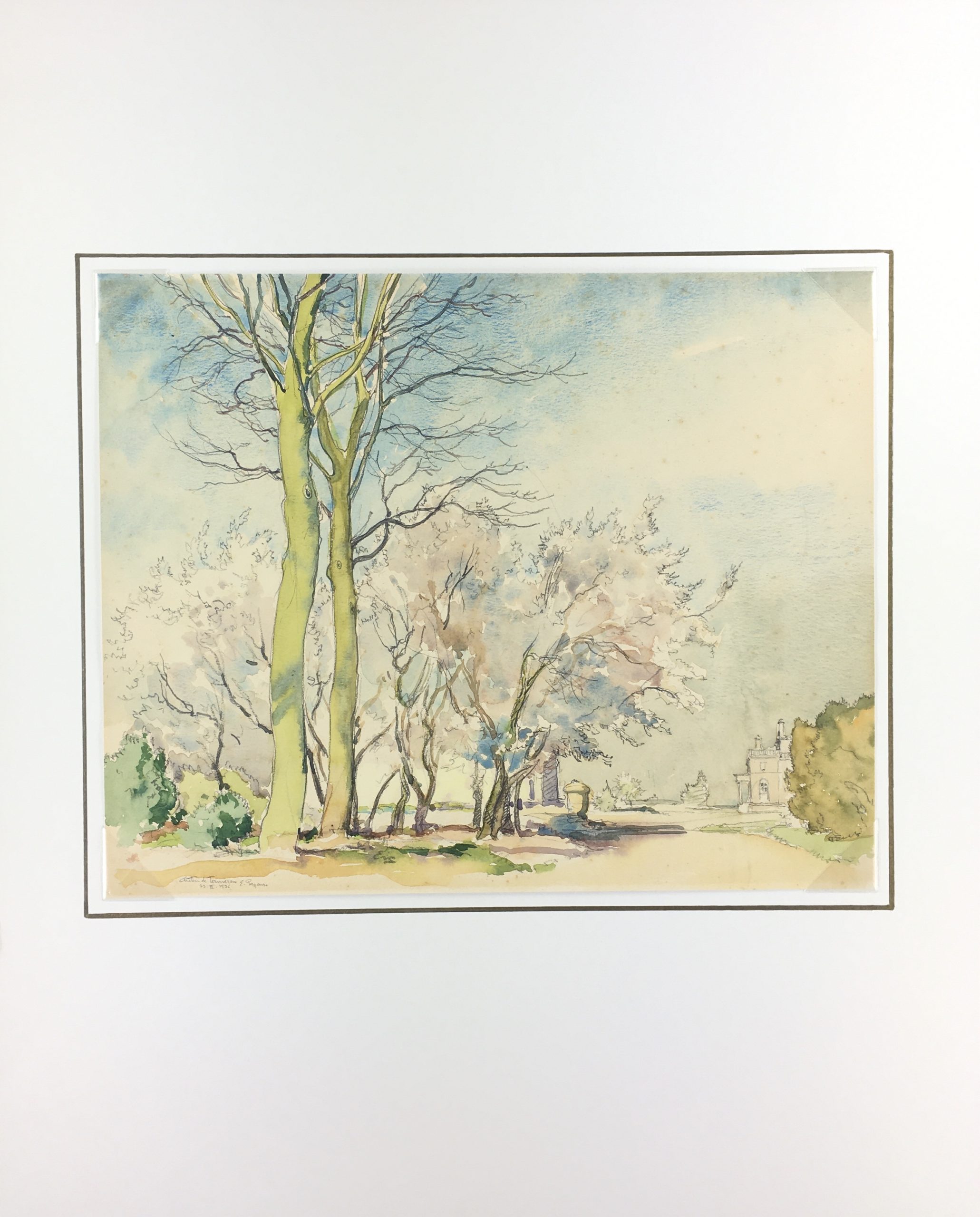 Original Art on paper displayed on a white mat with a gold border. Mat fits a standard-size frame. Archival plastic sleeve and Certificate of Authenticity included. Original Art, 12.5″W x 10″H; mat, 16″W x 20″H.