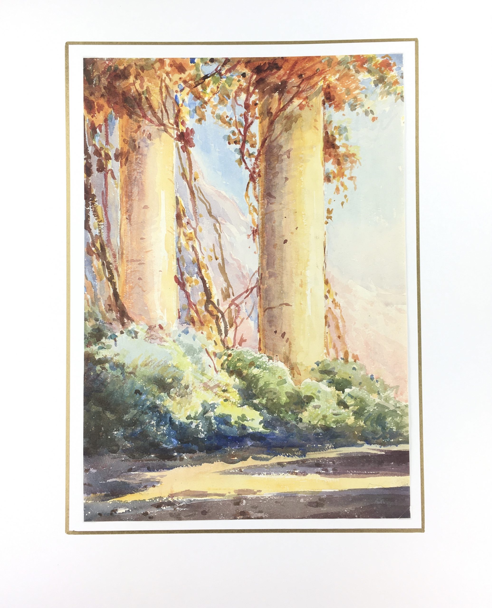 Original Art on paper displayed on a white mat with a gold border. Mat fits a standard-size frame. Archival plastic sleeve and Certificate of Authenticity included. Original Art, 10.25″W x 14.75″H; mat, 16″W x 20″H.