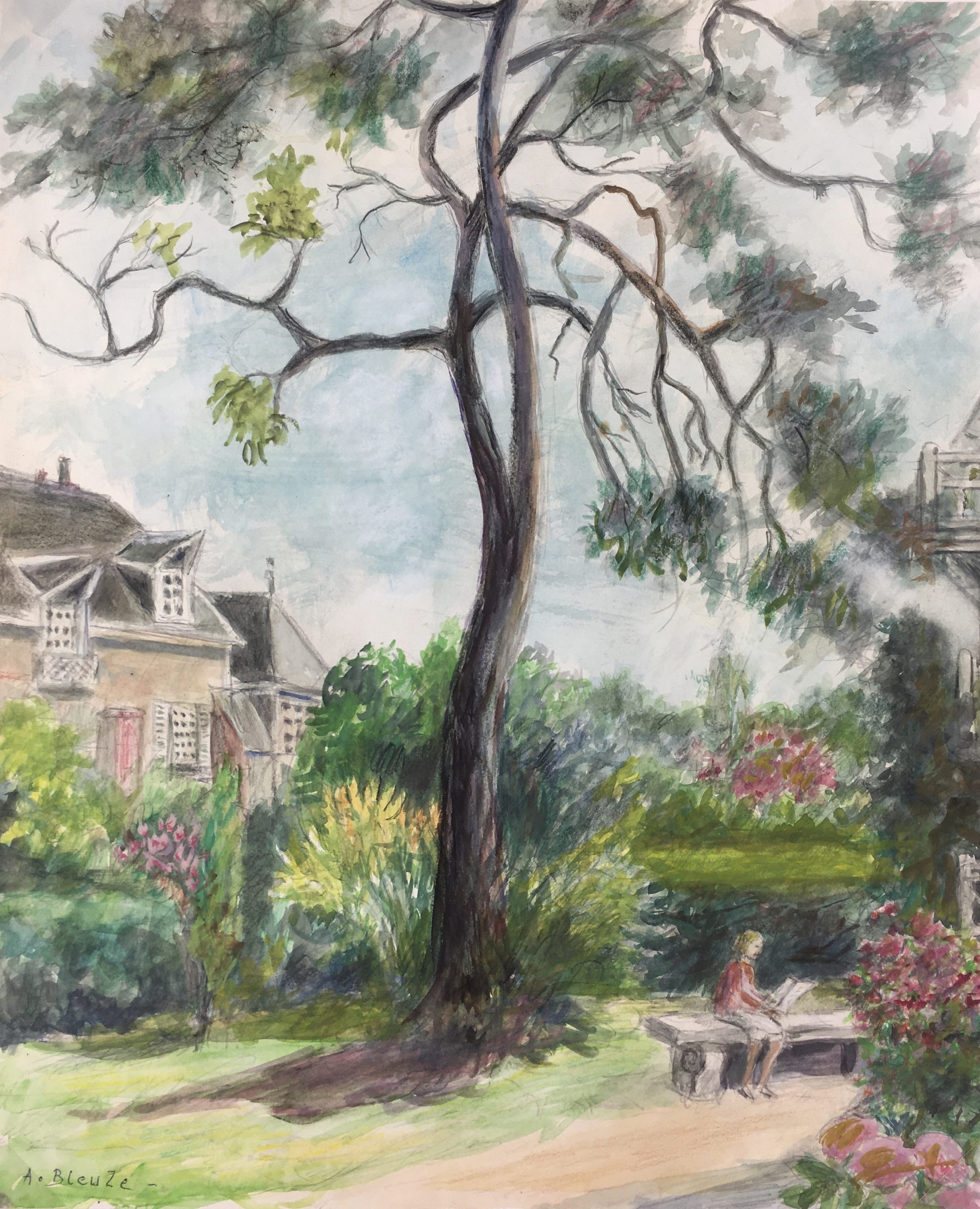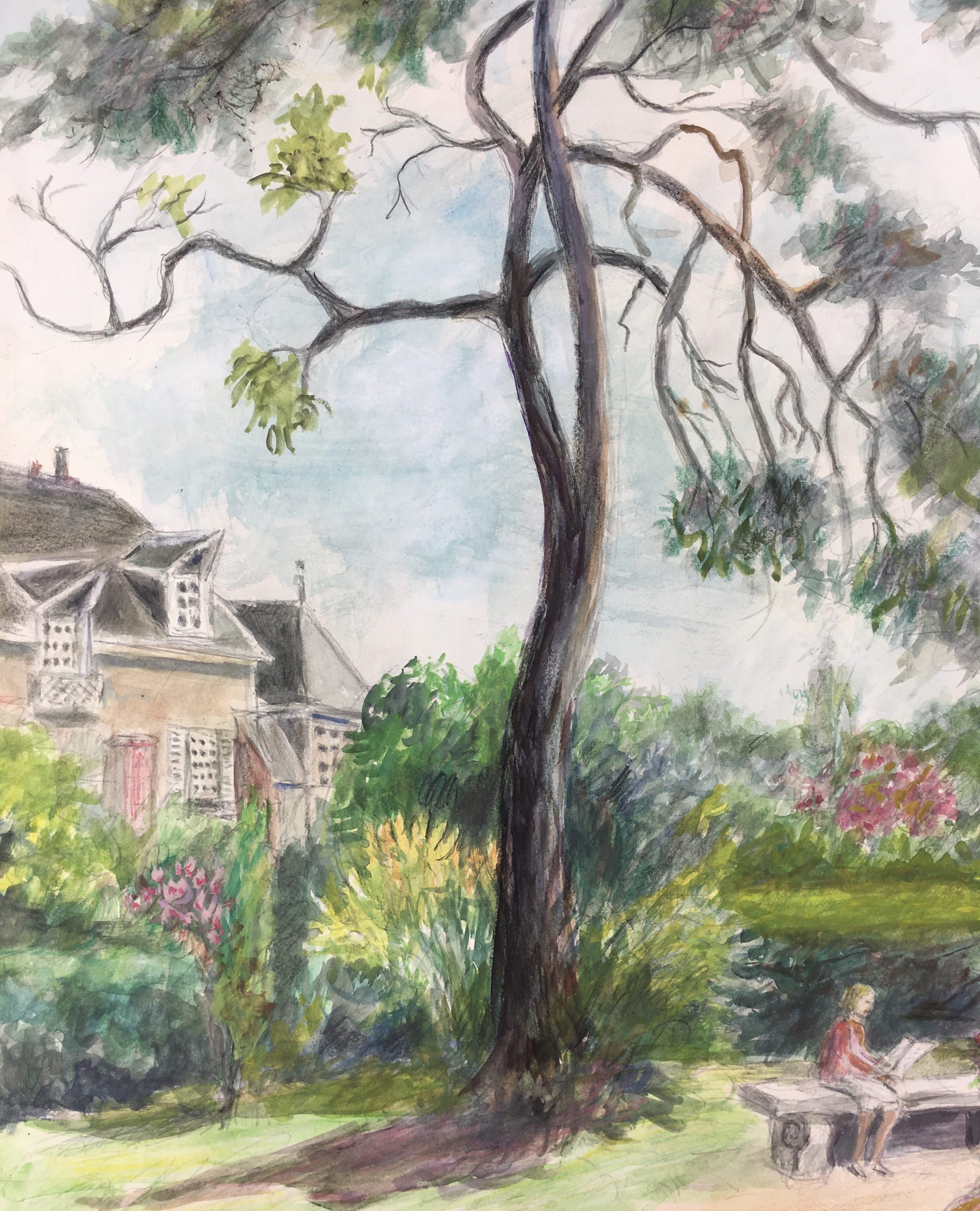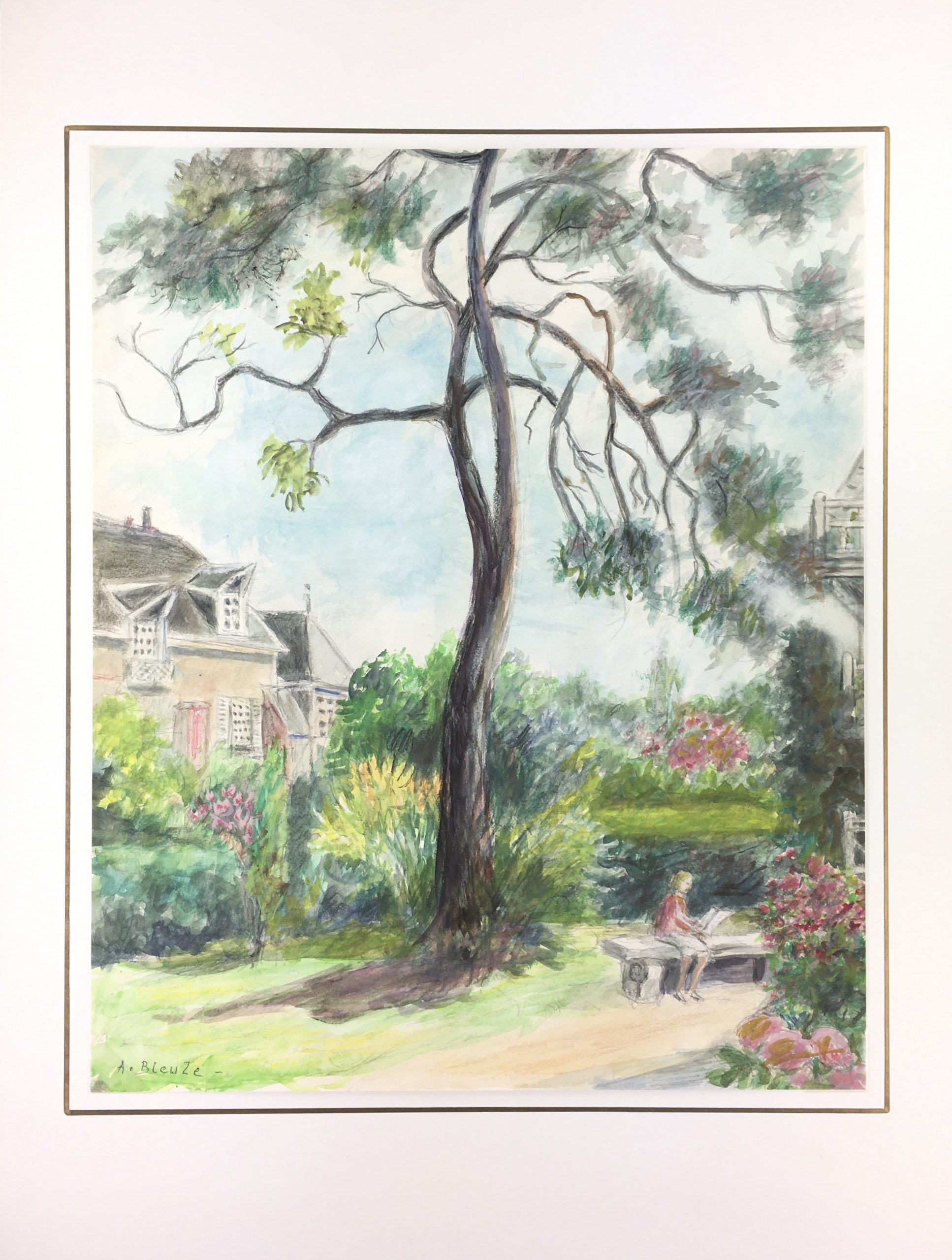 Original Art on paper displayed on a white mat with a gold border. Mat fits a standard-size frame. Archival plastic sleeve and Certificate of Authenticity included. Original Art, 14.5″W x 17.5″H; mat, 18″W x 24″H.