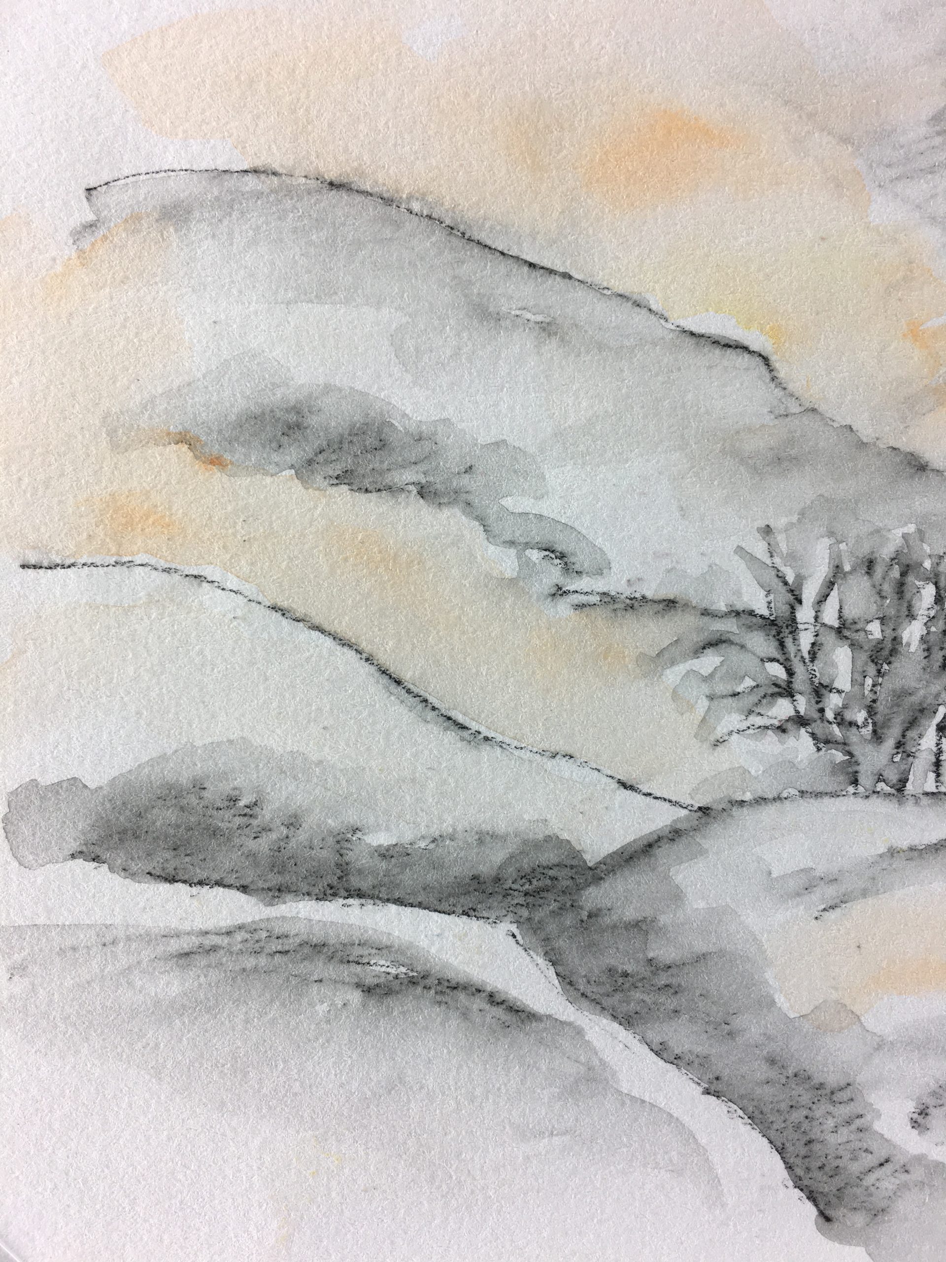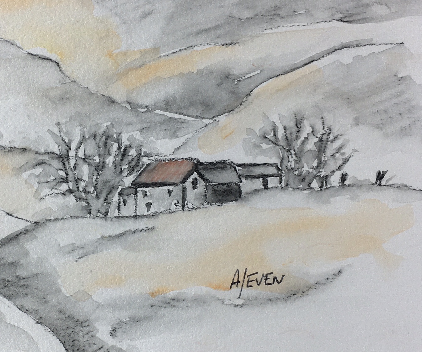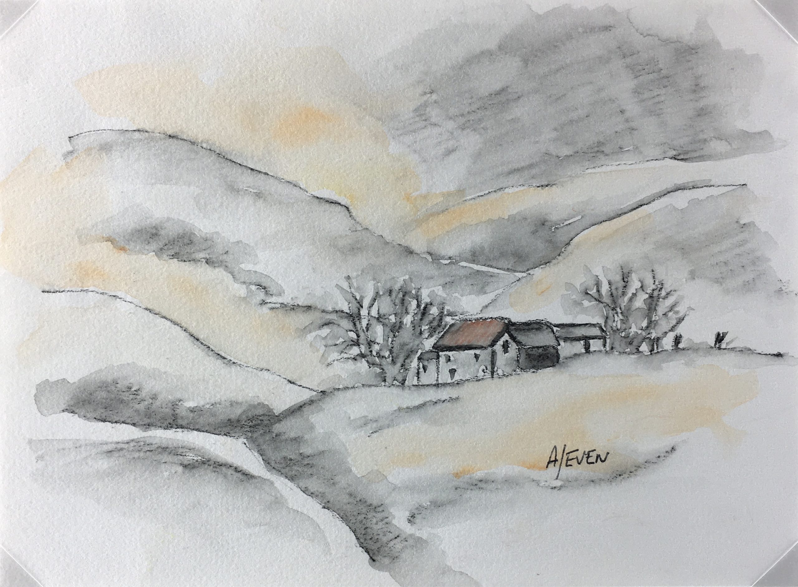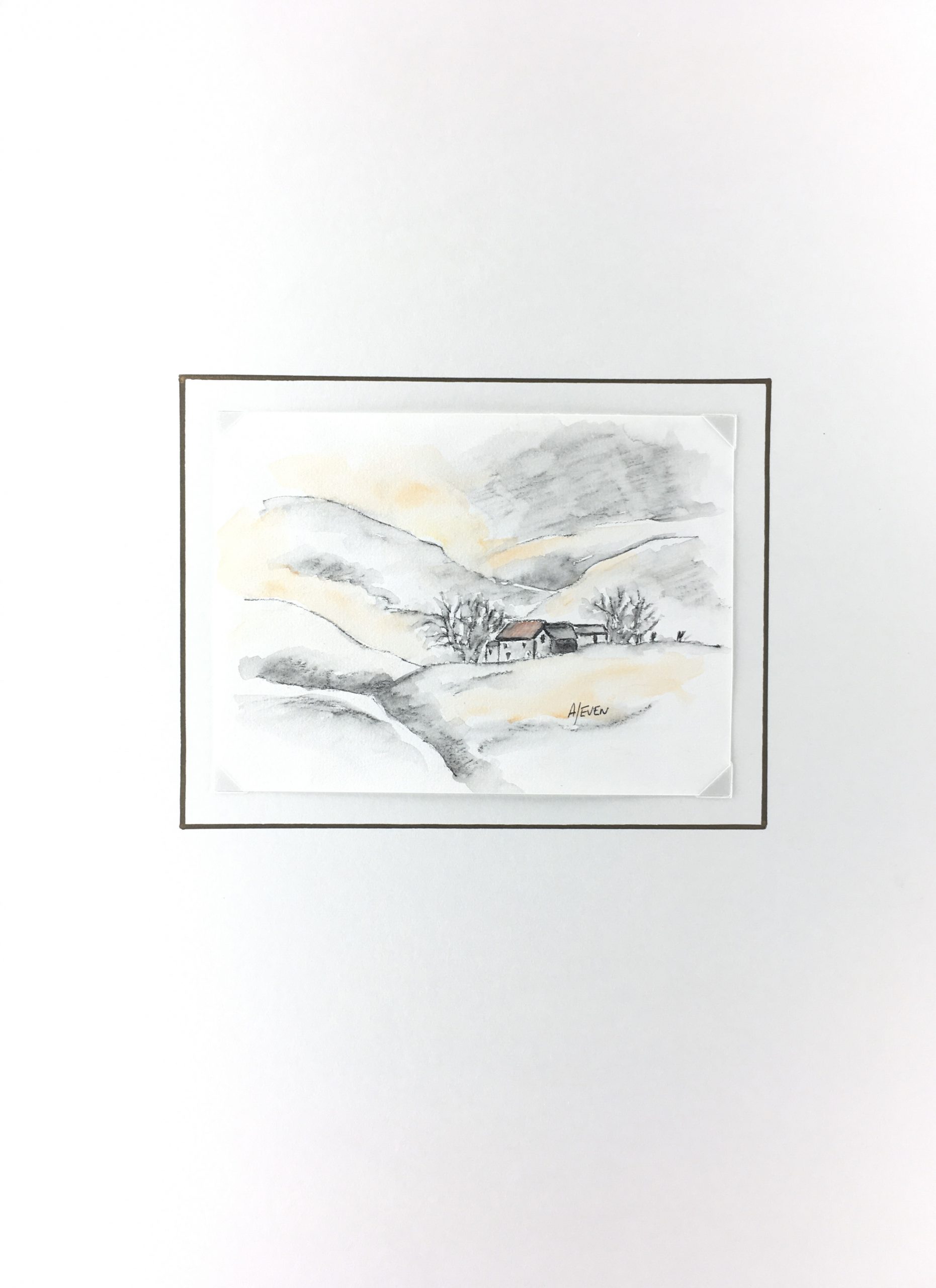 Original Art on paper displayed on a white mat with a gold border. Mat fits a standard-size frame. Archival plastic sleeve and Certificate of Authenticity included. Original Art, 6.5″W x 4.75″H; mat, 12″W x 16″H.