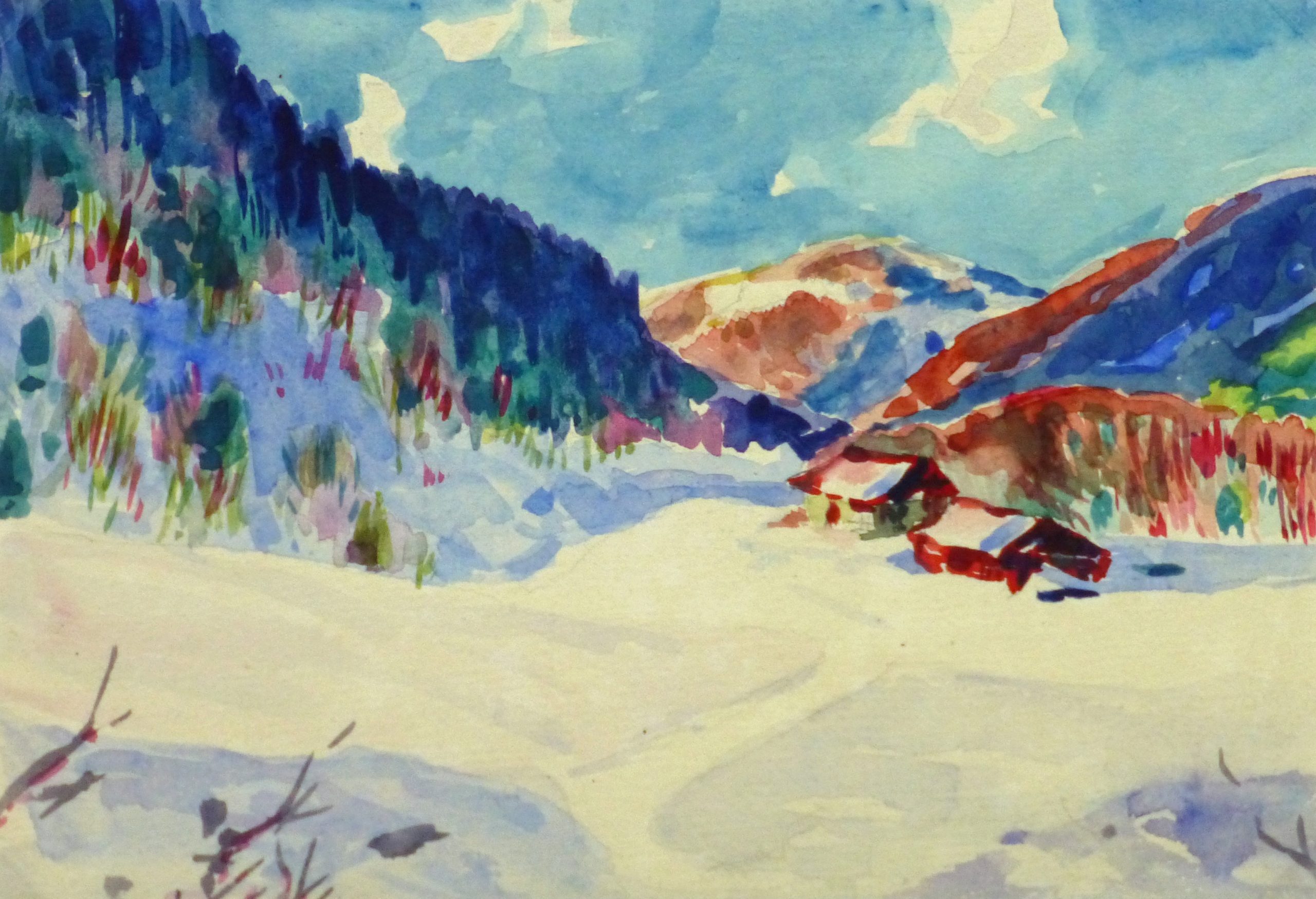 Vivid use of color in this watercolor landscape of a snowy scene of small cabins edged by mountains by C. Herbetz, circa 1930. Unsigned.