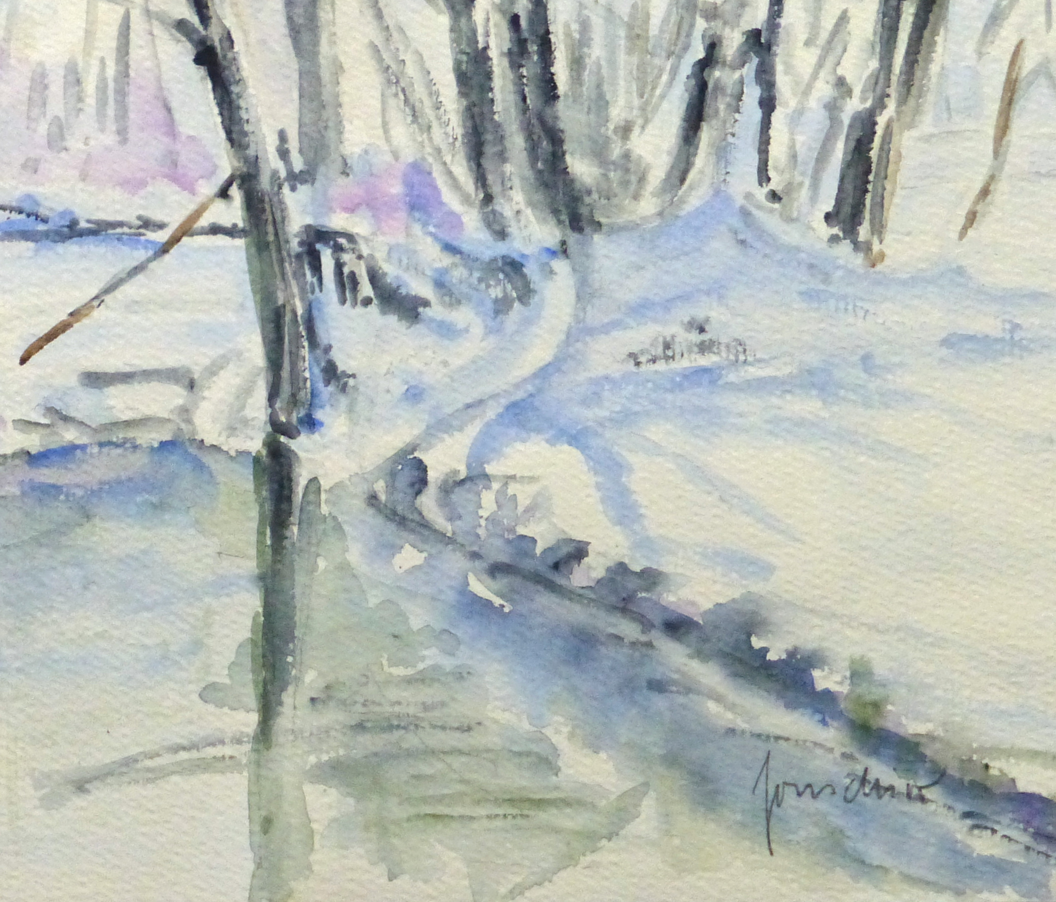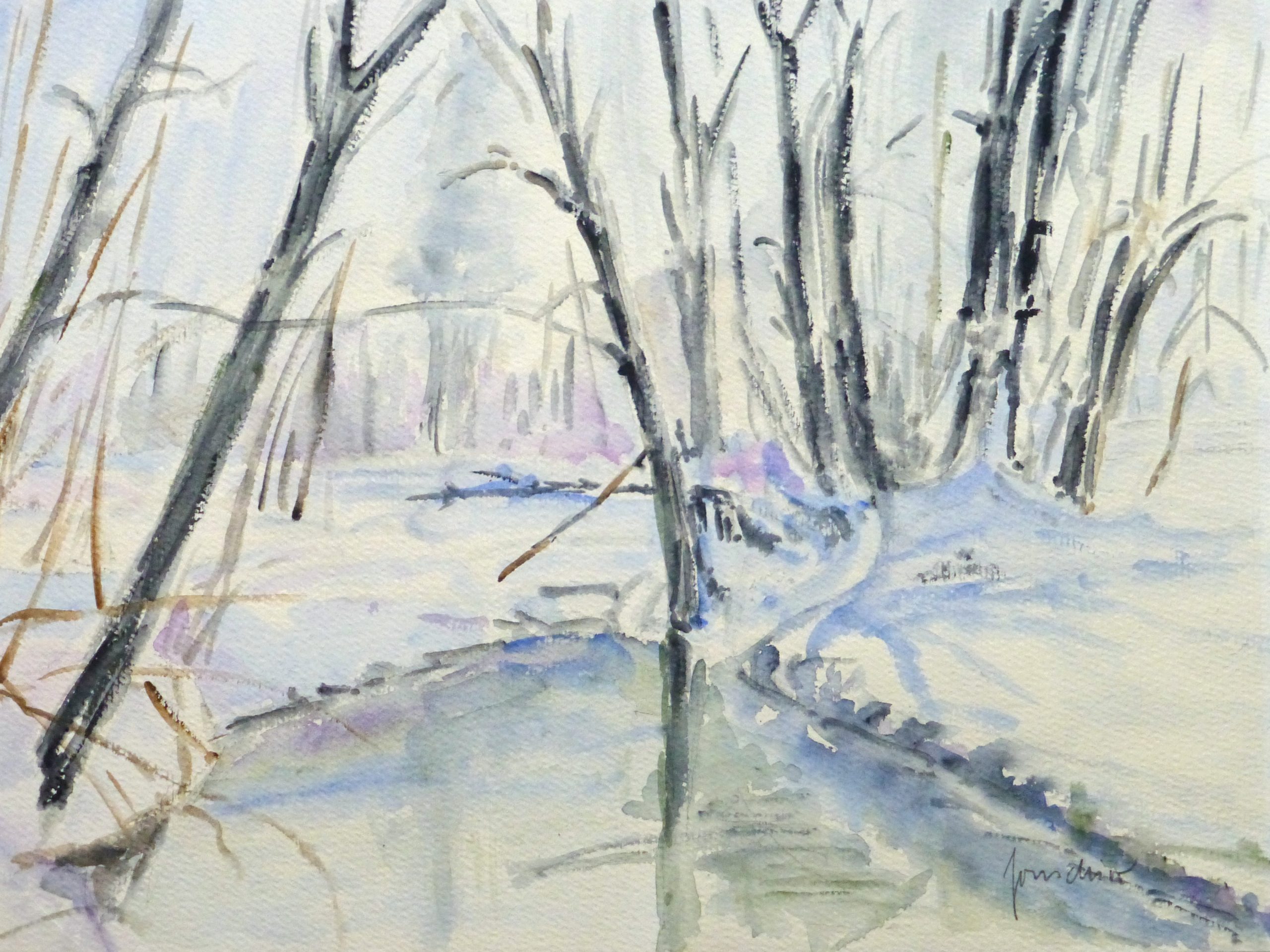 Soothing watercolor landscape of a small icy pond surrounded by bare trees and fresh snowfall, 1990s. Signed lower right.