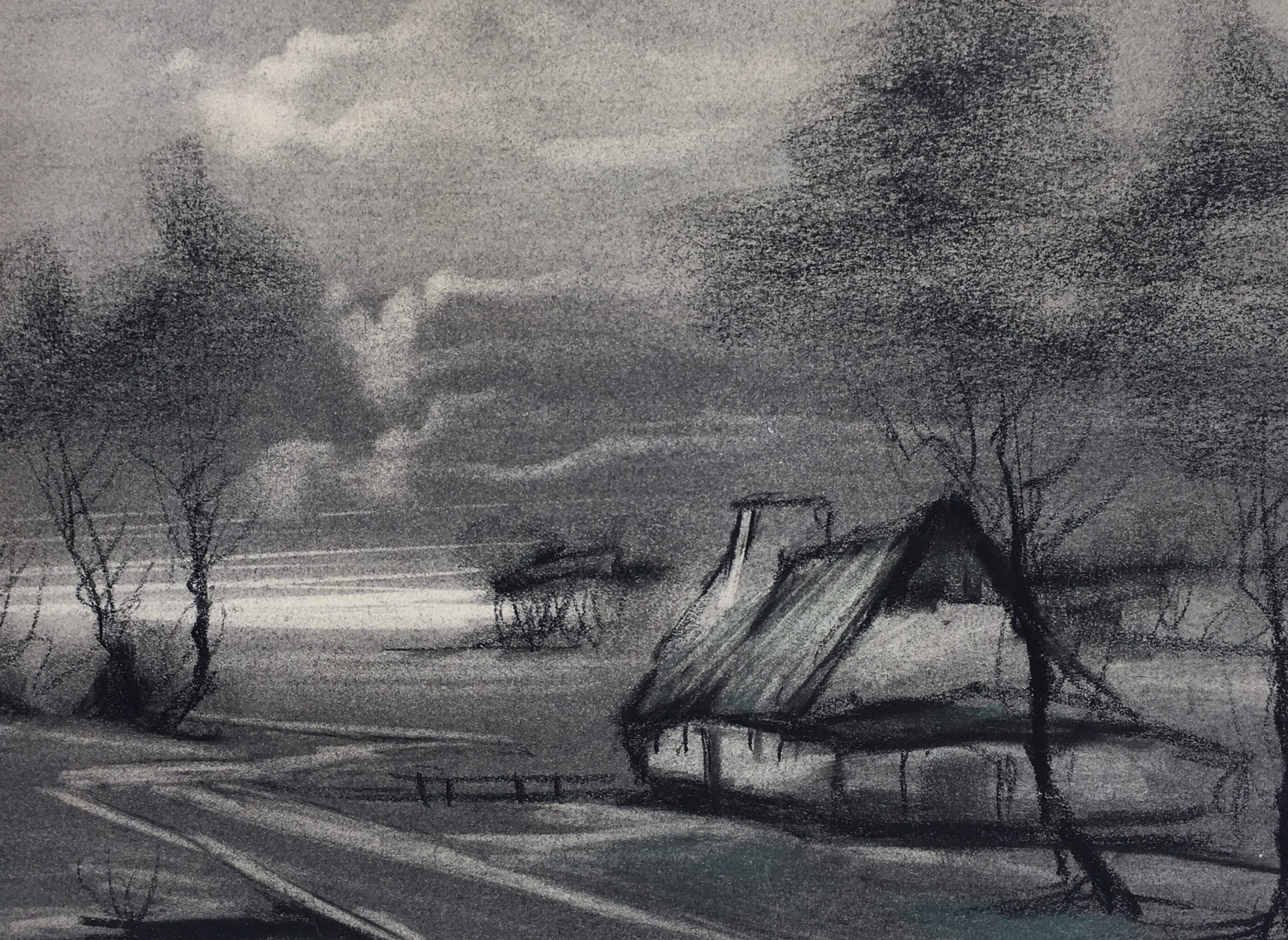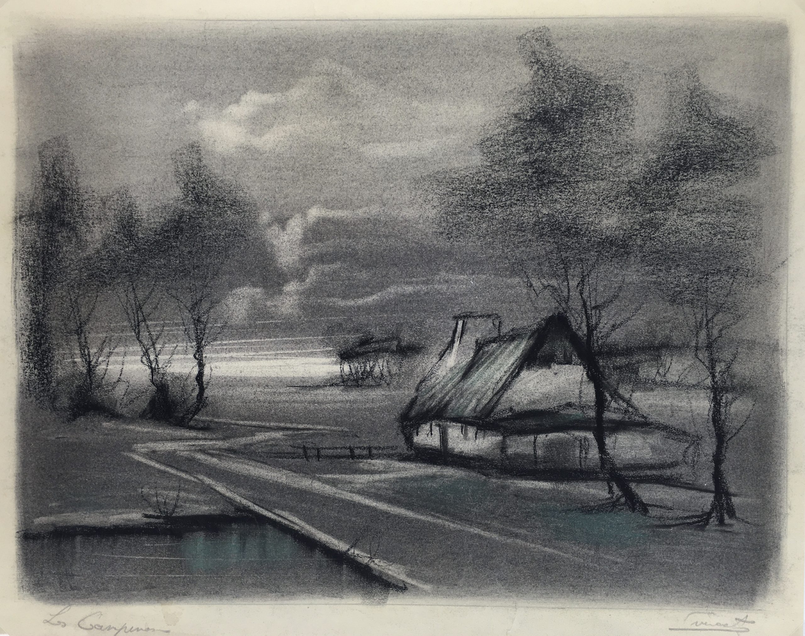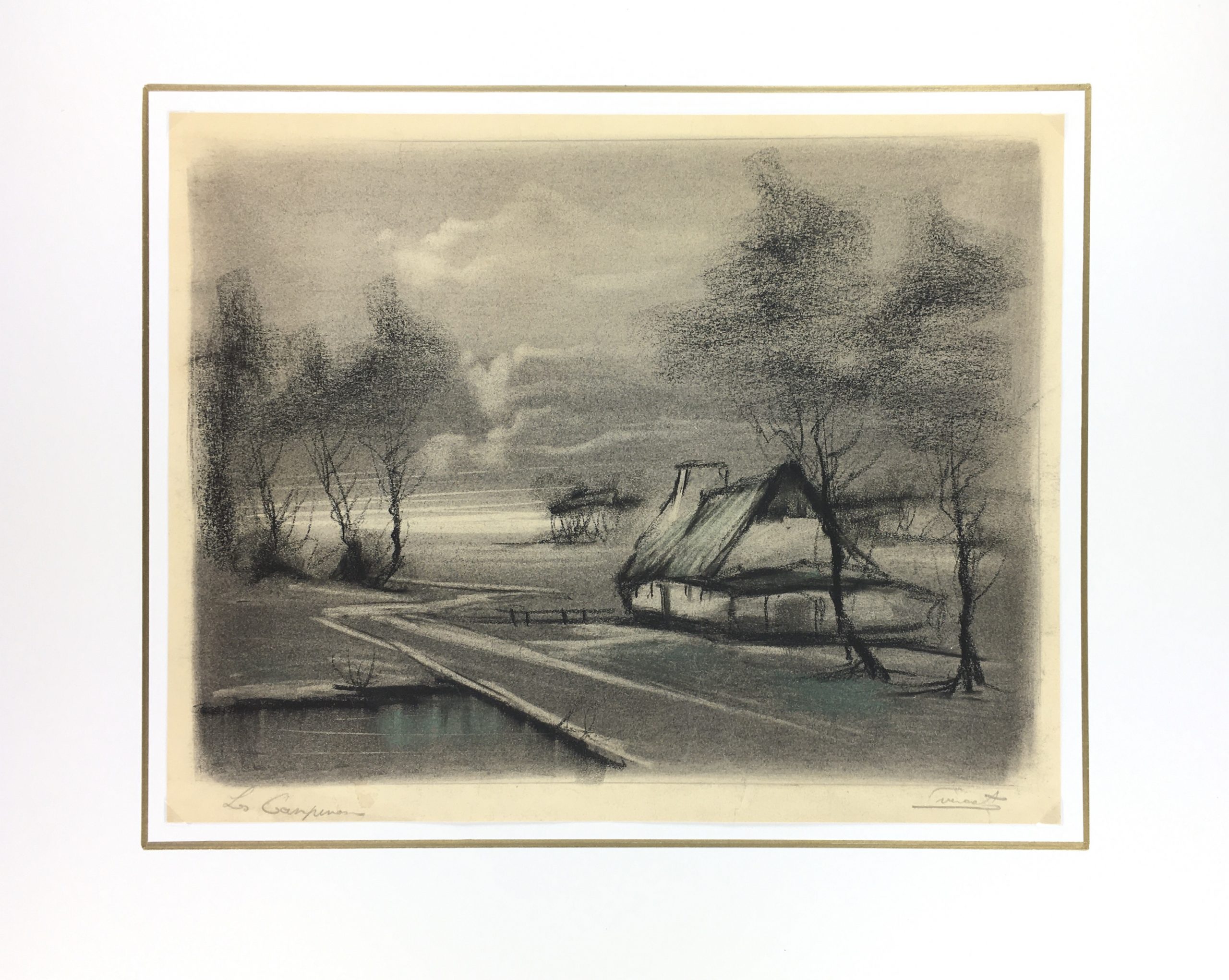 Original Art on paper displayed on a white mat with a gold border. Mat fits a standard-size frame. Archival plastic sleeve and Certificate of Authenticity included. Original Art, 14″W x 11.5″H; mat, 20″W x 16″H.