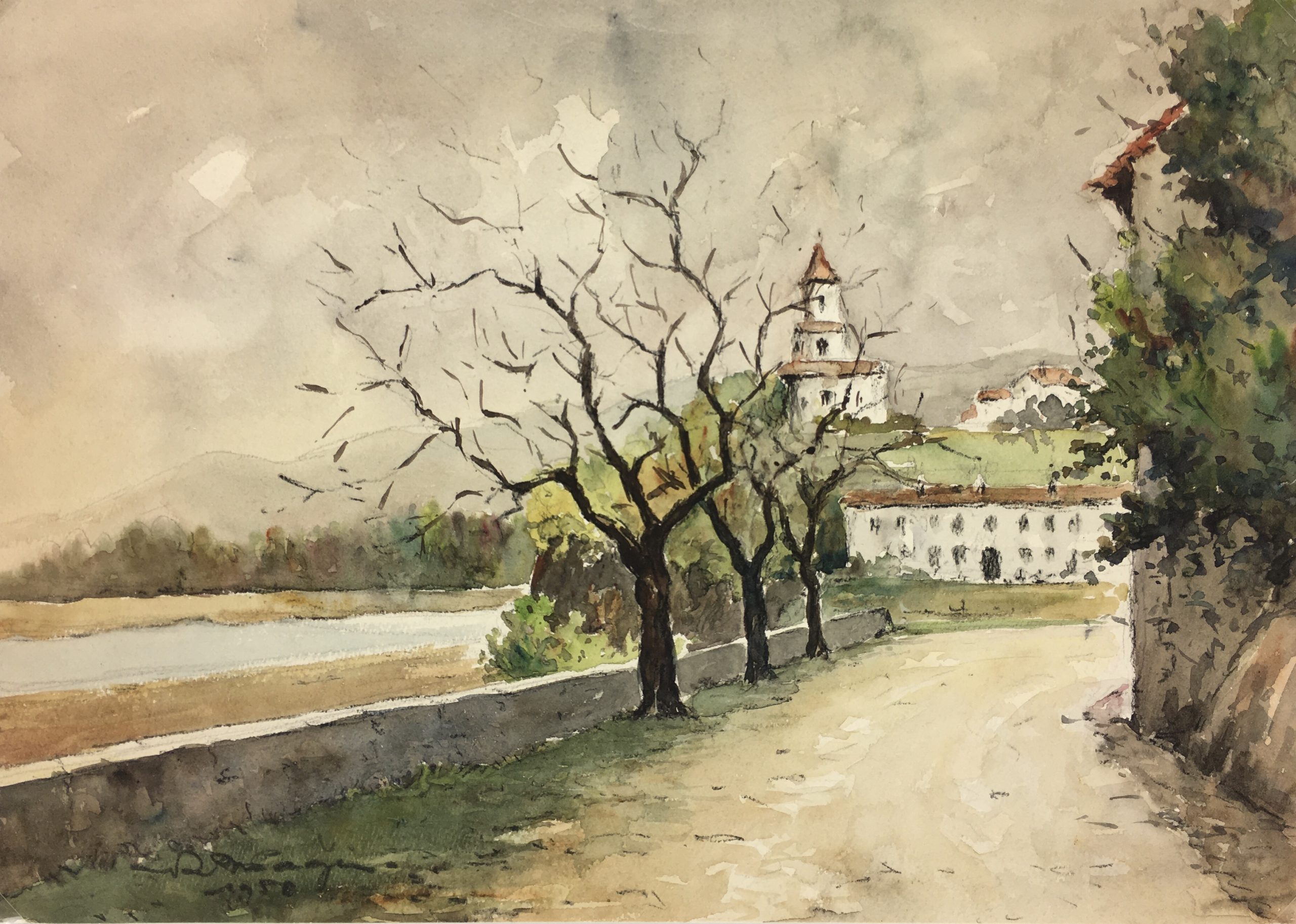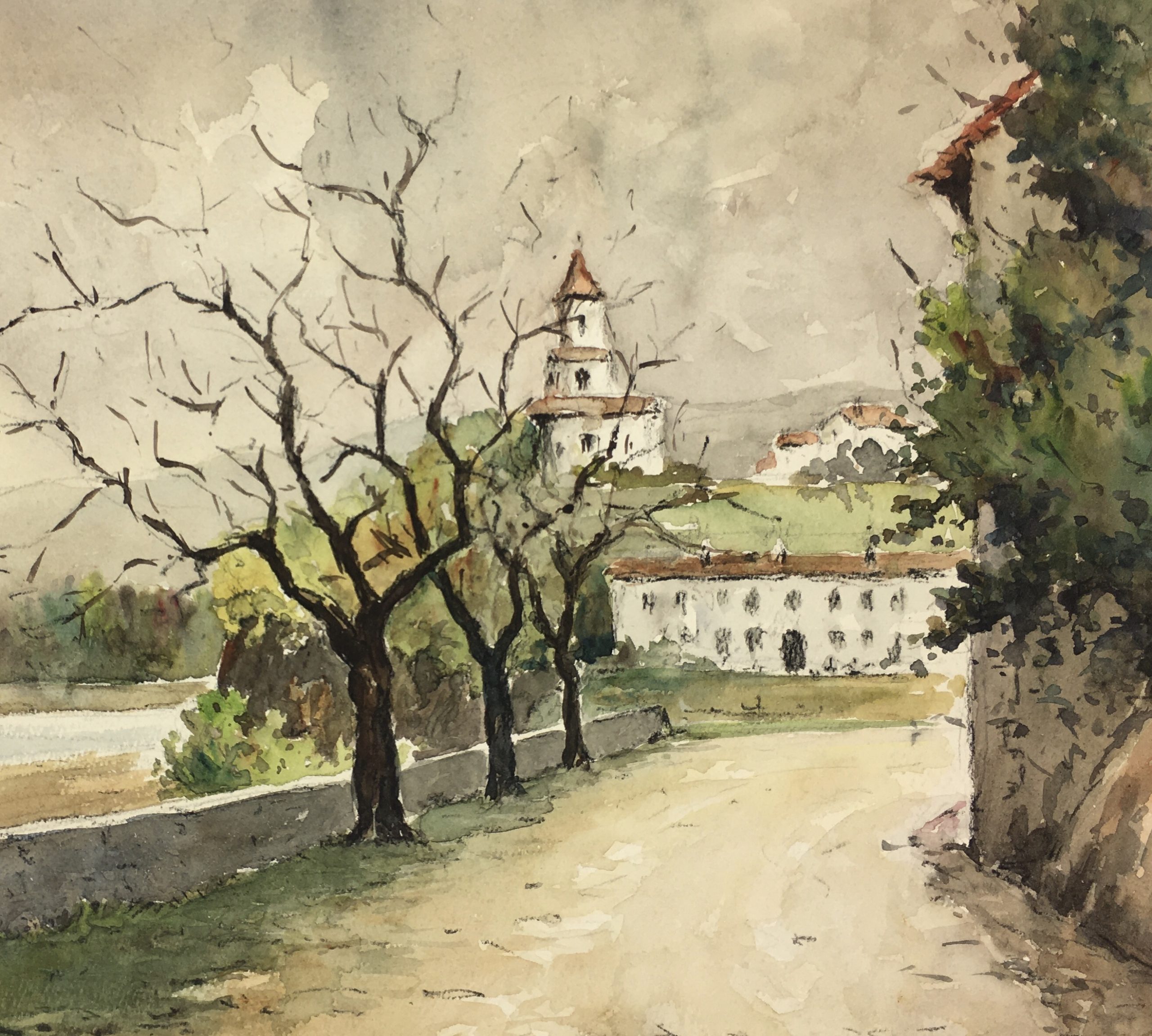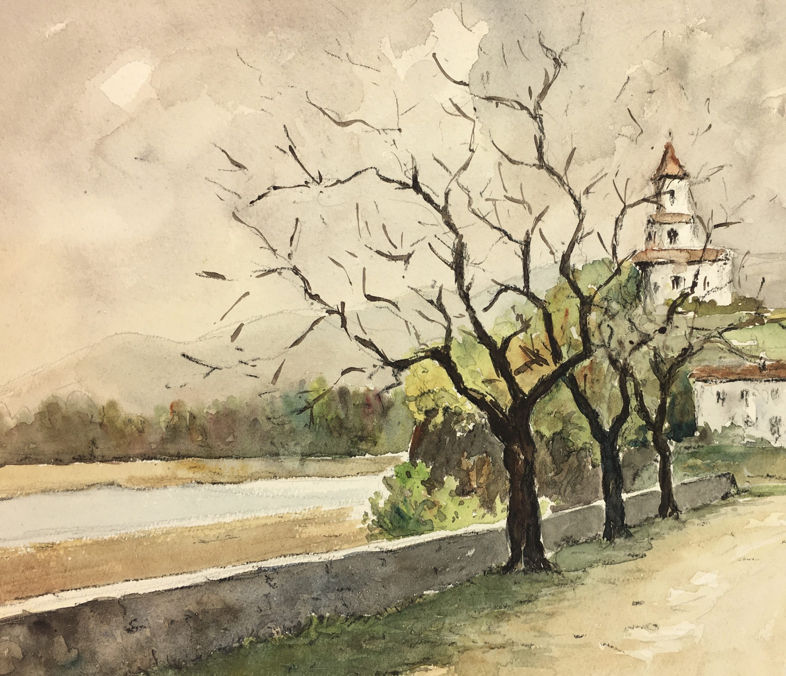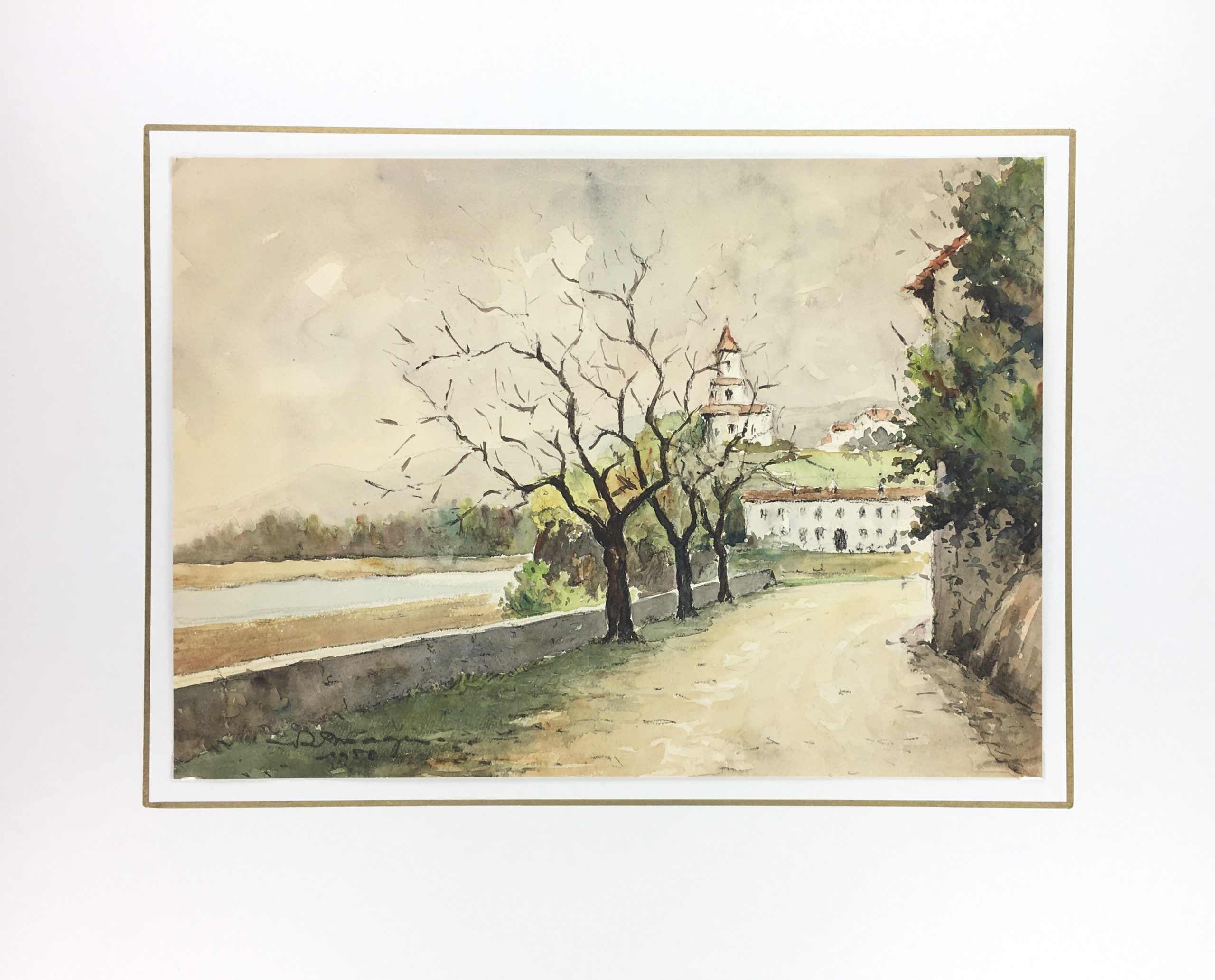 Original Art on paper displayed on a white mat with a gold border. Mat fits a standard-size frame. Archival plastic sleeve and Certificate of Authenticity included. Original Art, 14″W x 10″H; mat, 20″W x 16″H.