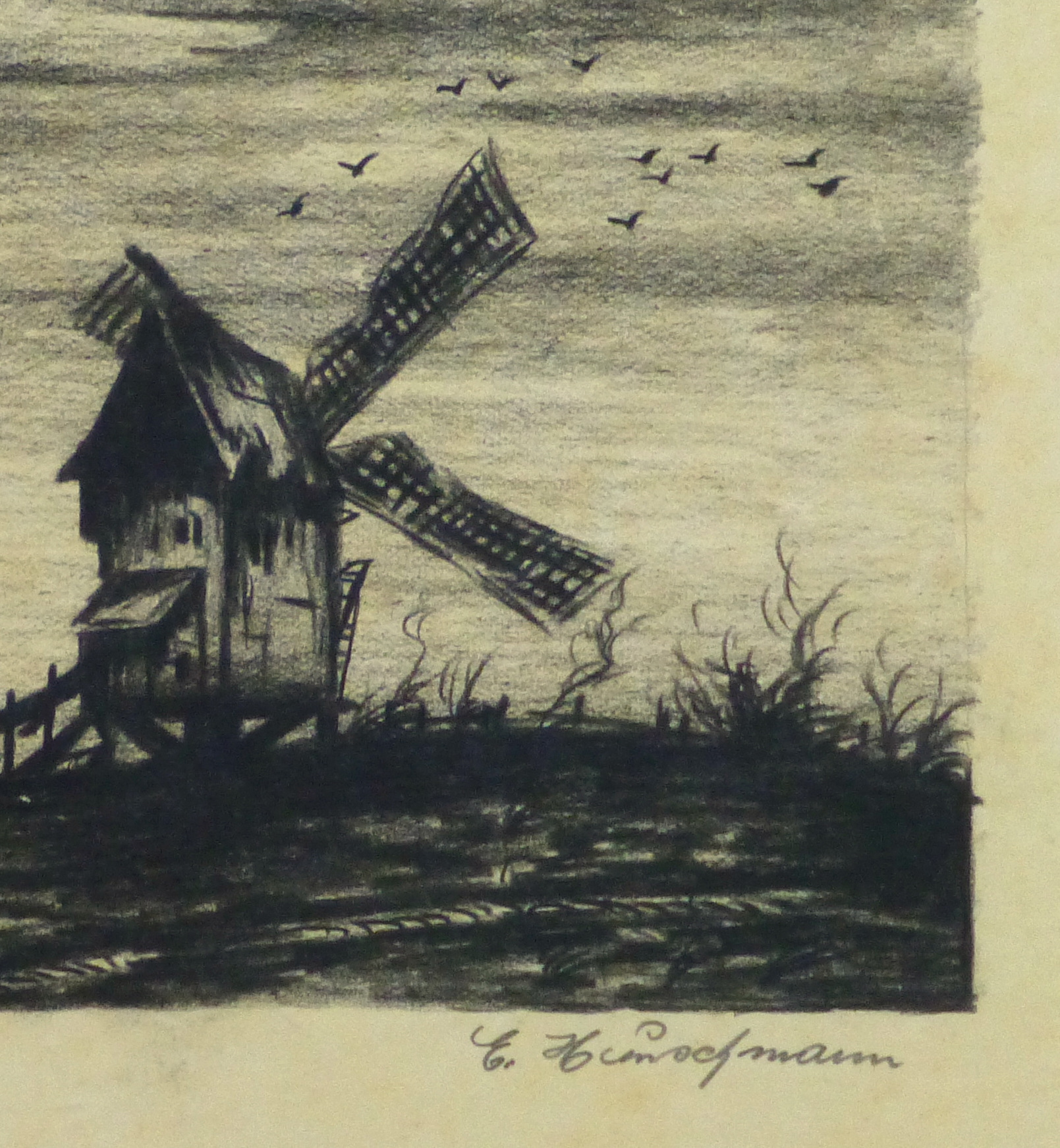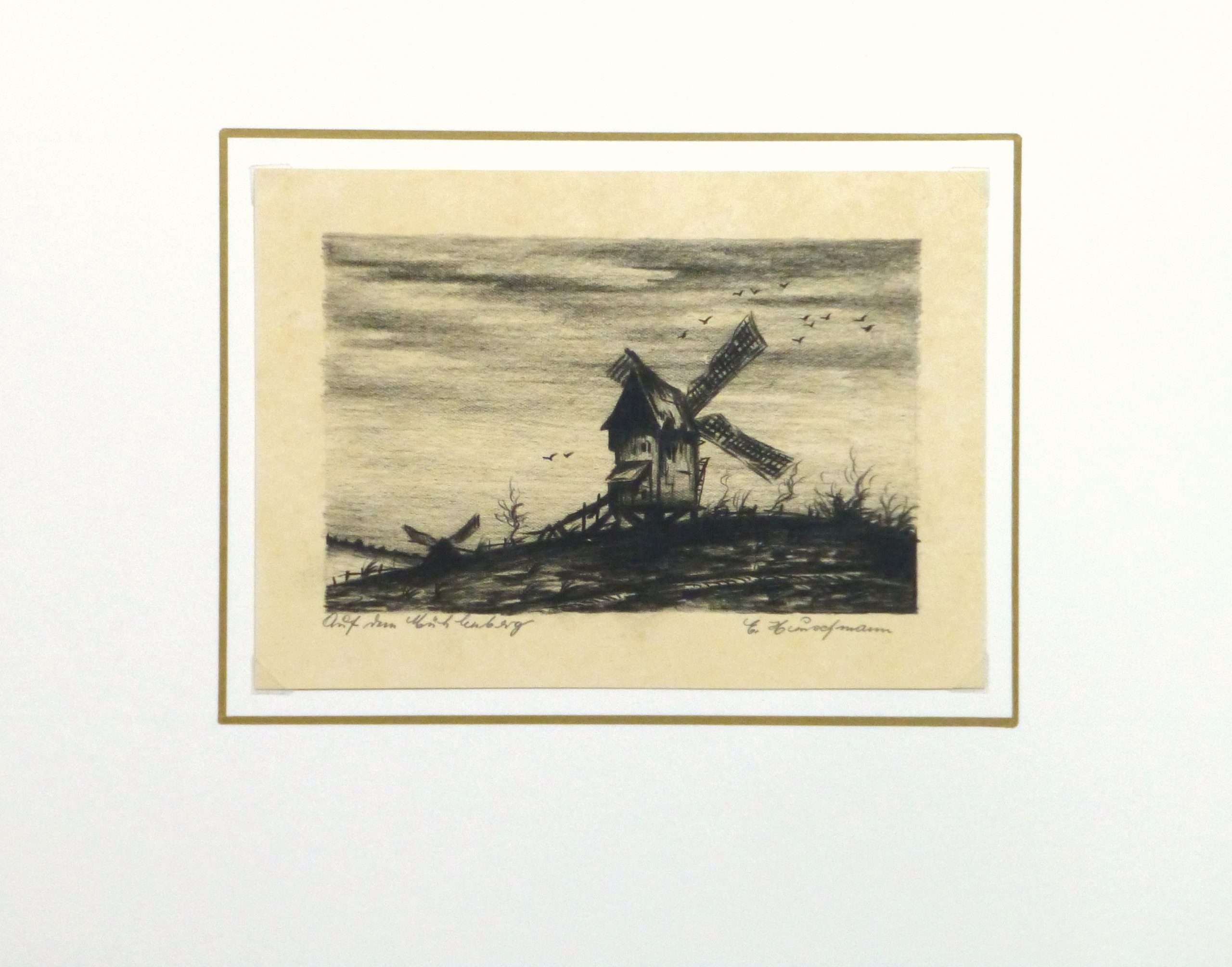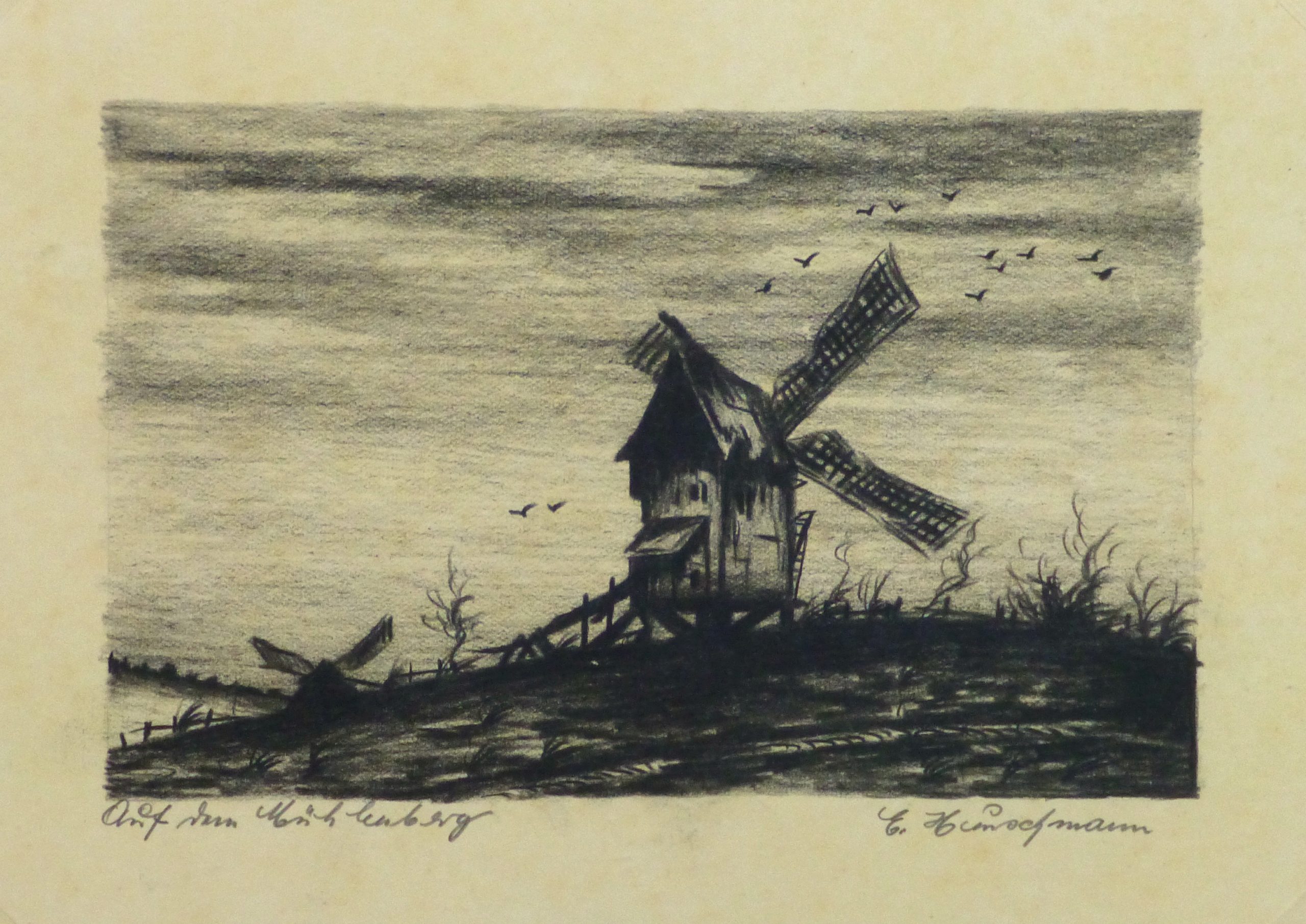 Black and white lithograph of a quaint windmill house perched atop a small hill by E. Hinschmann, circa 1930. Titled and signed in pencil lower margin.