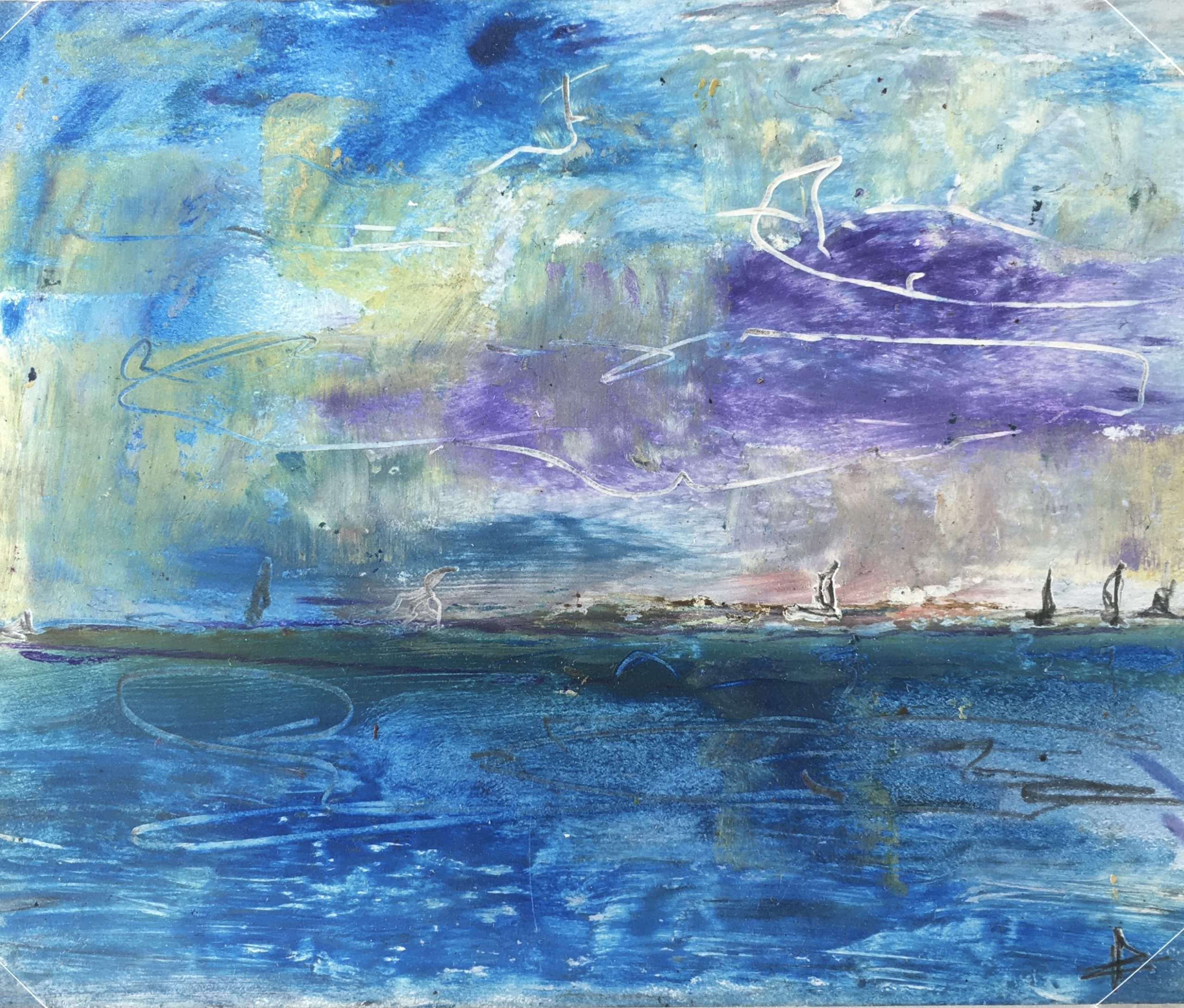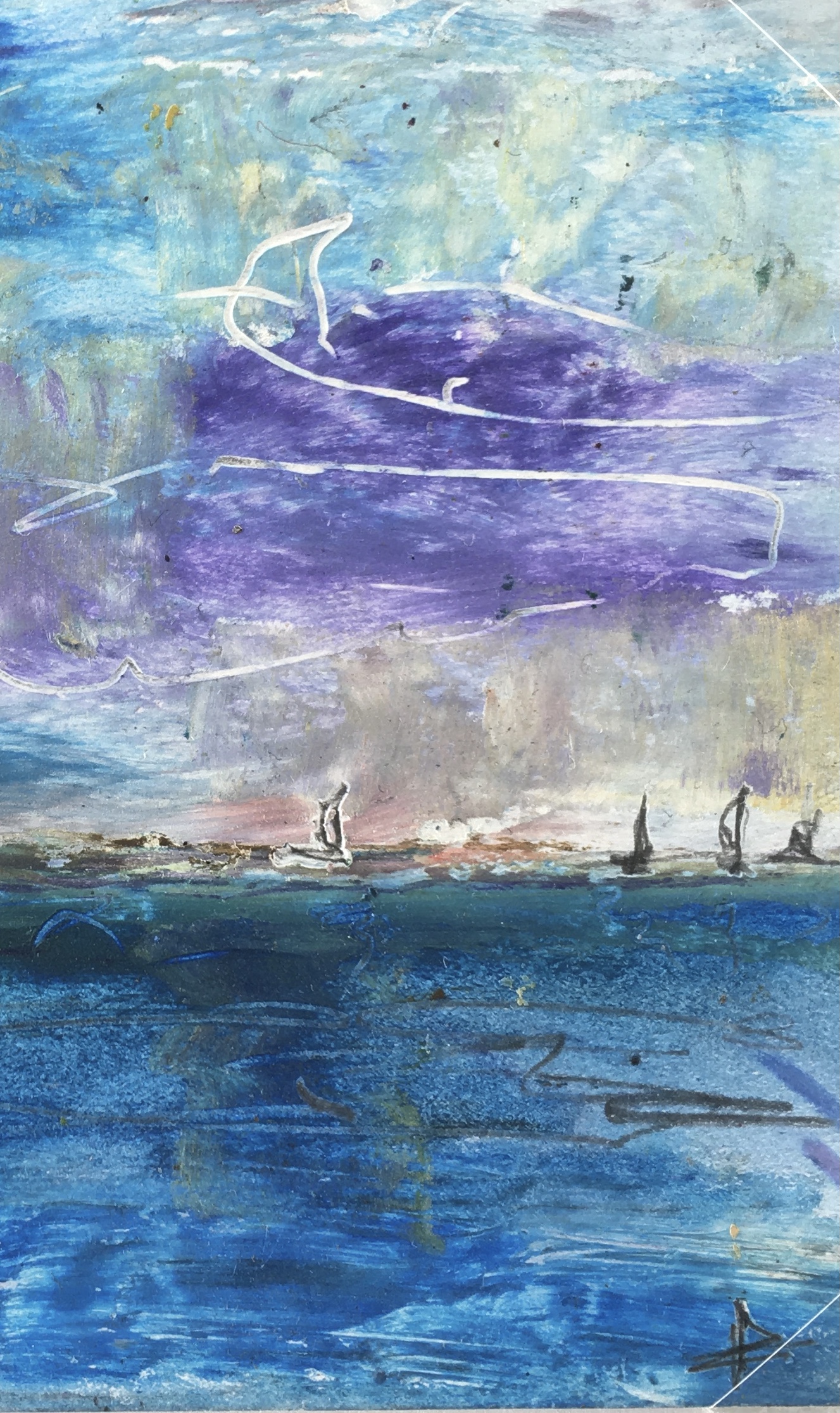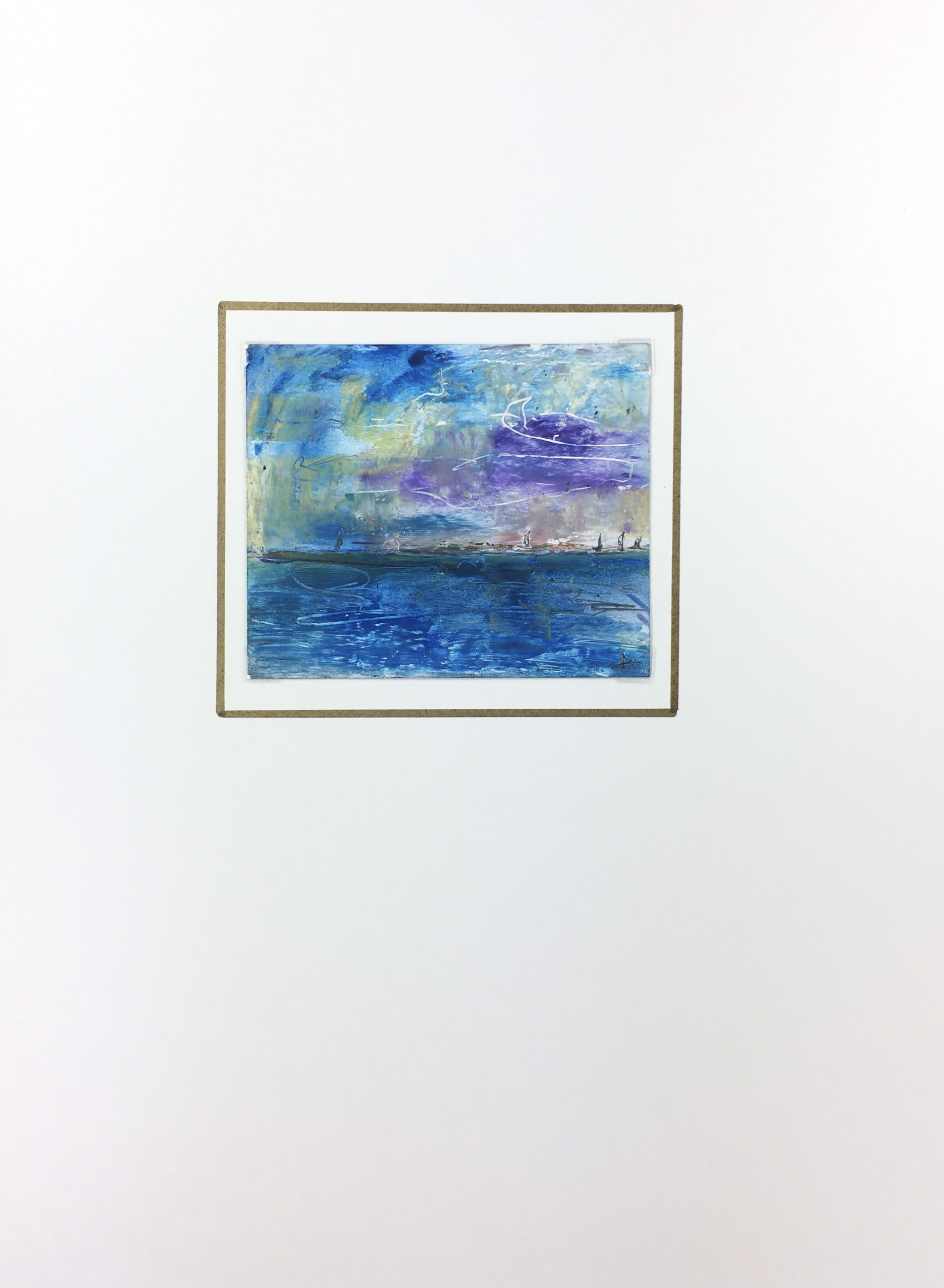 Original Art on paper displayed on a white mat with a gold border. Mat fits a standard-size frame. Archival plastic sleeve and Certificate of Authenticity included. Original Art, 5″W x 4″H; mat, 12″W x 16″H.