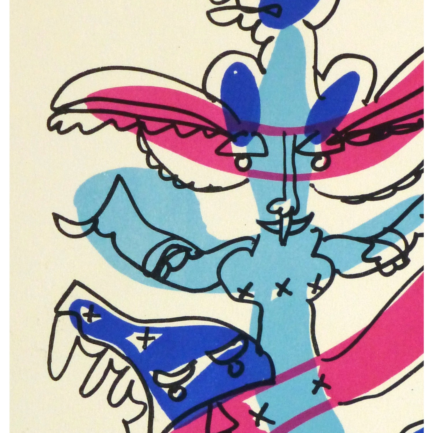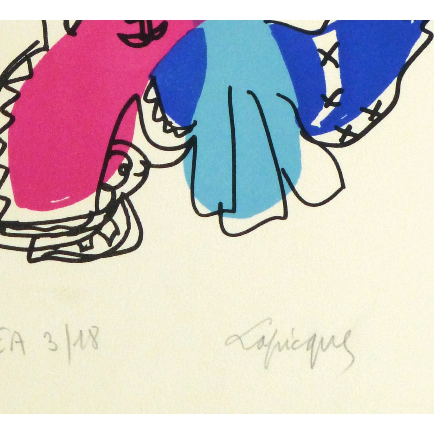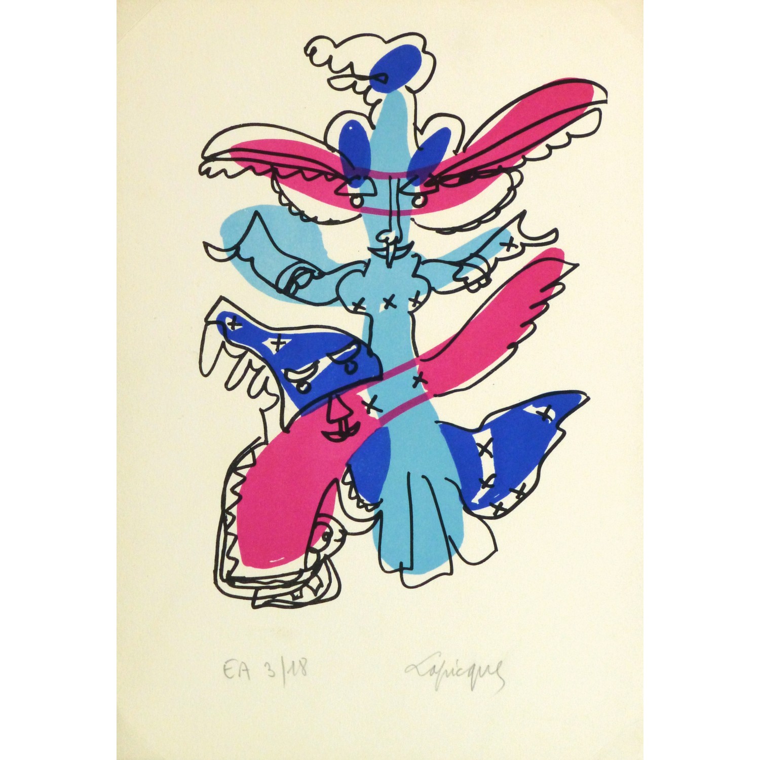 Impactful lithograph of abstract religious figures in bold hues of pink and blues by French artist Charles Lapicque, 1974. Signed in pencil lower right and numbered 3 of 18 lower left. Number #505 in Catalogue Raisoné.