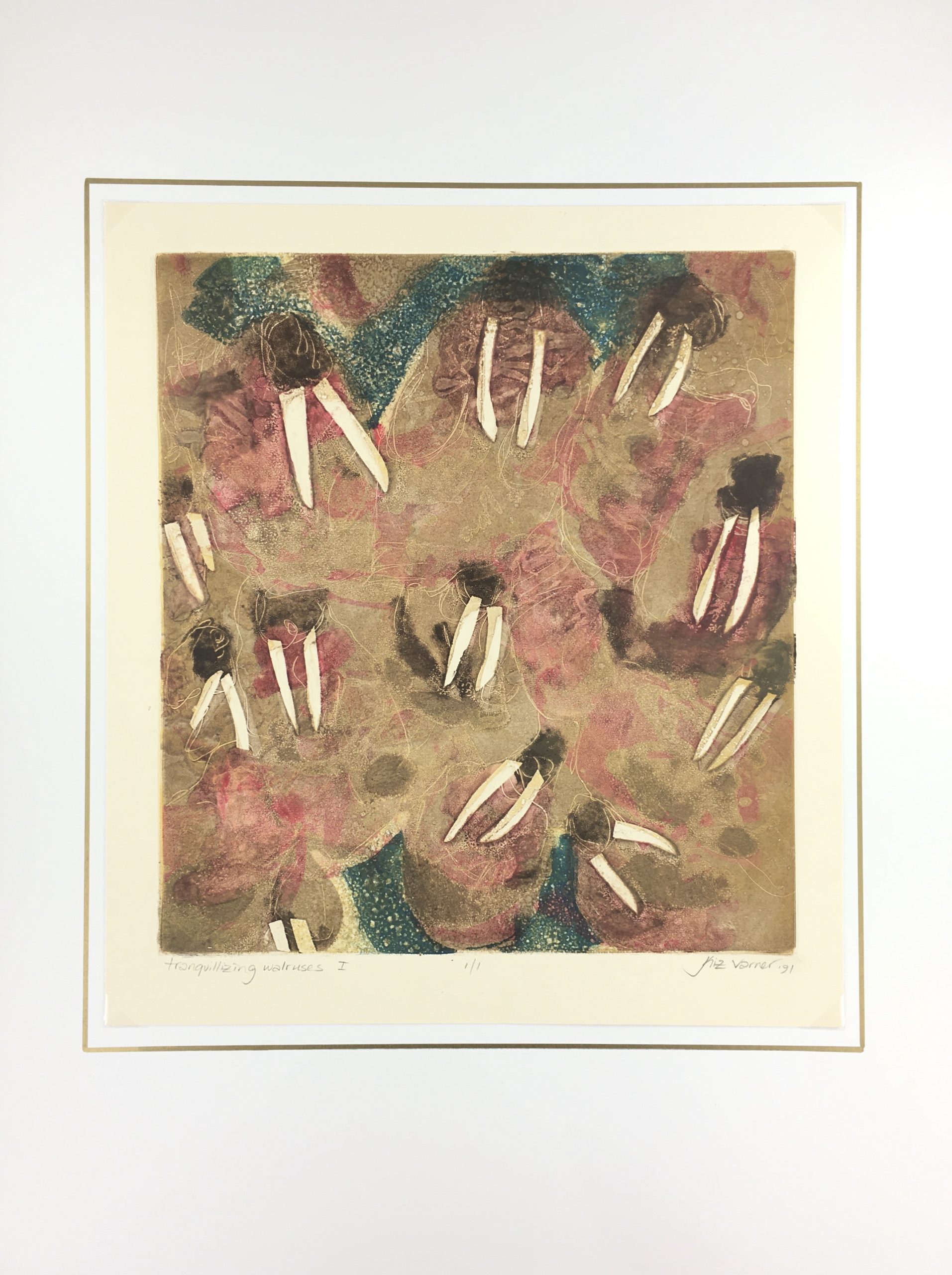 Original Art on paper displayed on a white mat with a gold border. Mat fits a standard-size frame. Archival plastic sleeve and Certificate of Authenticity included. Original Art, 13.75″W x 15.25″H; mat, 18″W x 24″H.