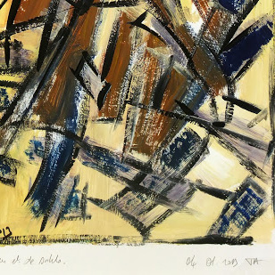 Acrylic abstract painting inspired by nature by French artist Jacques Alary, 2013. Titled “Jeu d’Eau et de Sable” lower left or Game of Water and Sand. Initialed and dated lower left.