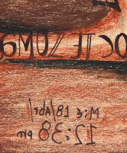 Abstract charcoal and pastel drawing combing rusty hues of orange with inverted words and numbers by Mexican artist Misael Moctezuma, 2012.