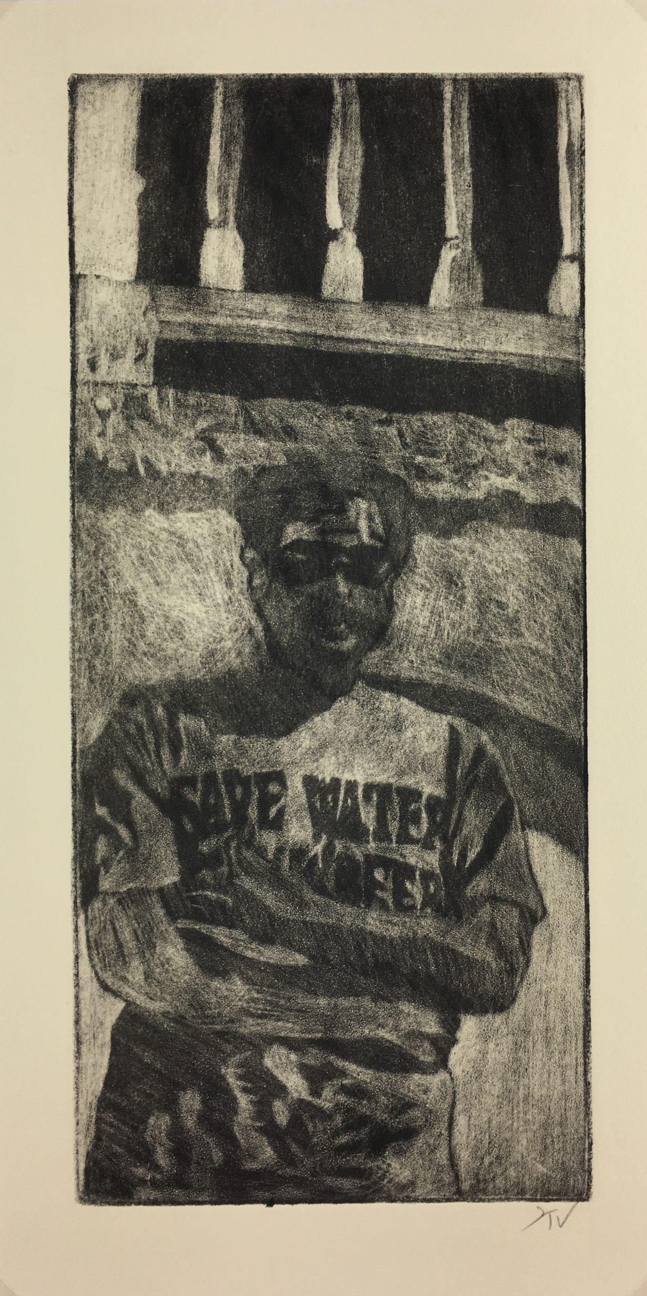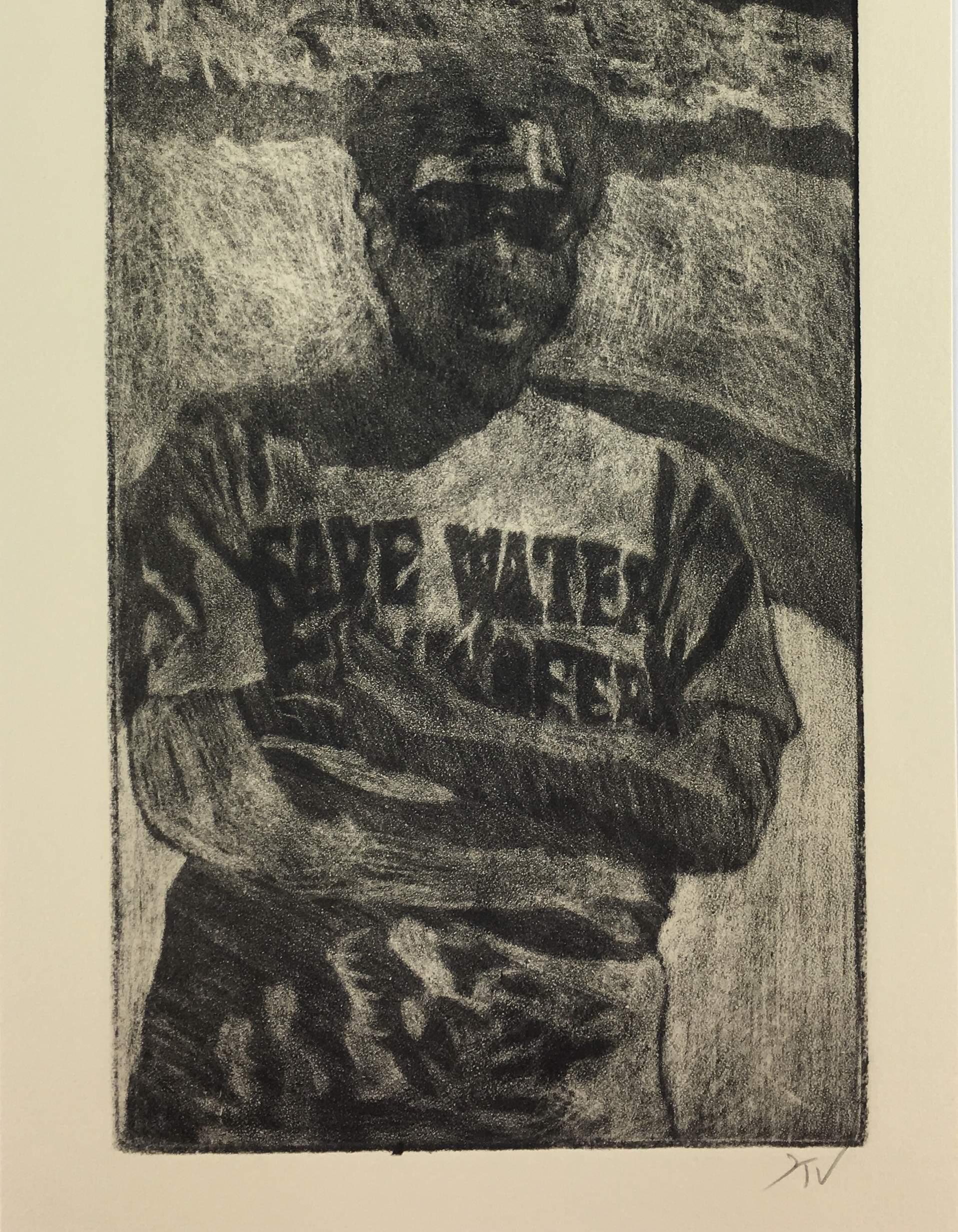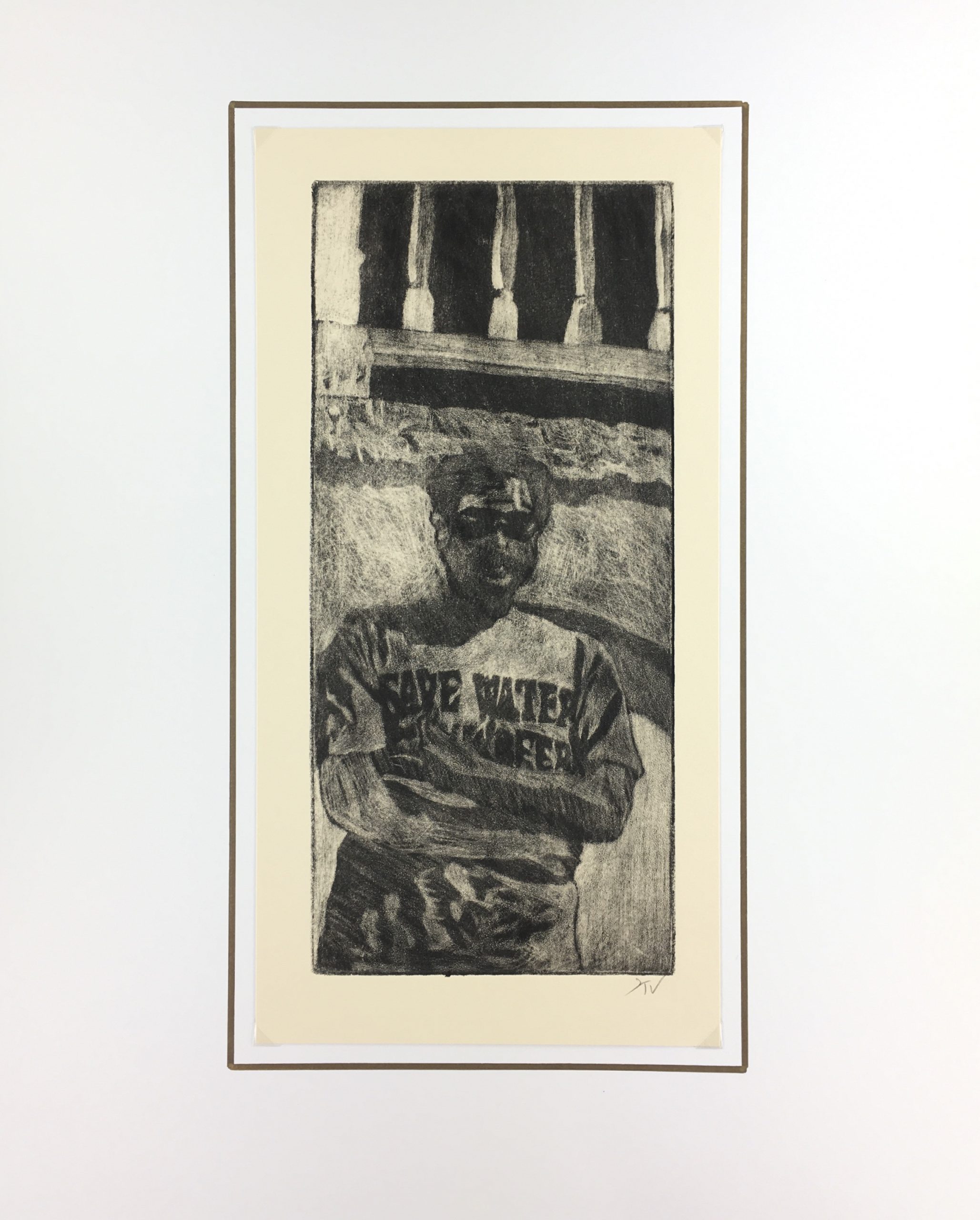 Original Art on paper displayed on a white mat with a gold border. Mat fits a standard-size frame. Archival plastic sleeve and Certificate of Authenticity included. Original Art, 7.5″W x 14.75″H; mat, 16″W x 20″H.