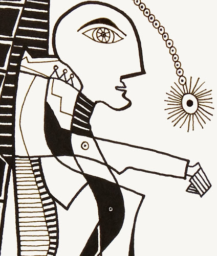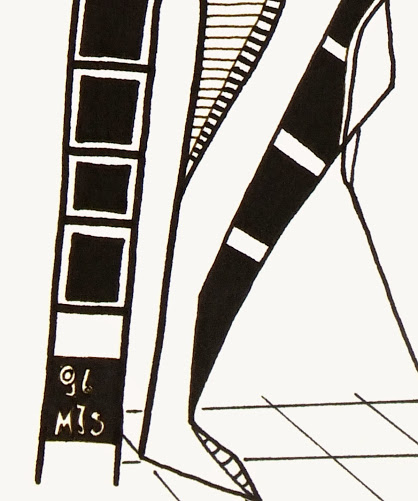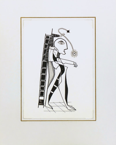 Precise and boldly lined pen and ink drawing of an abstract figure by German artist MJS, 1996. Signed and dated lower left.