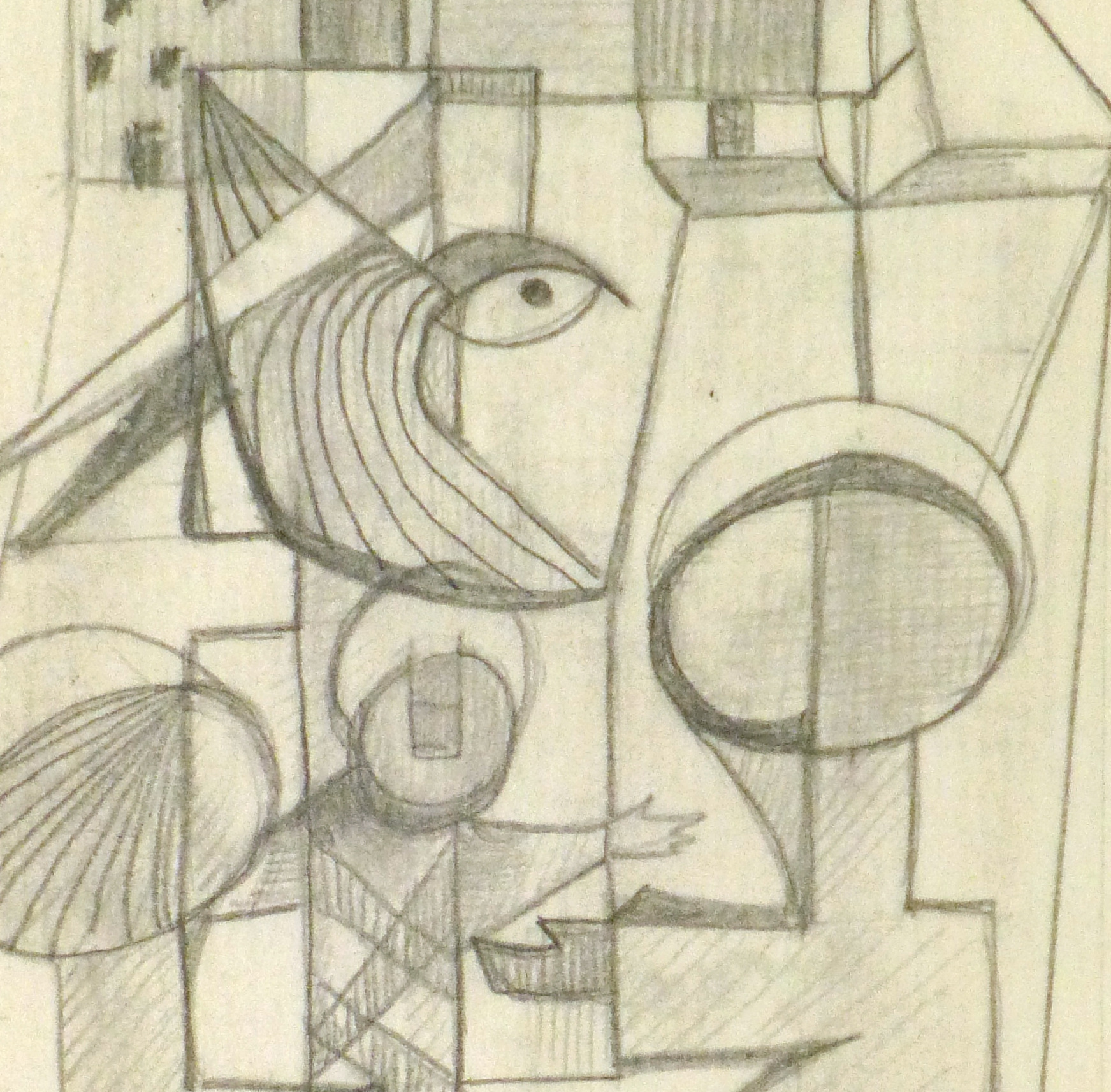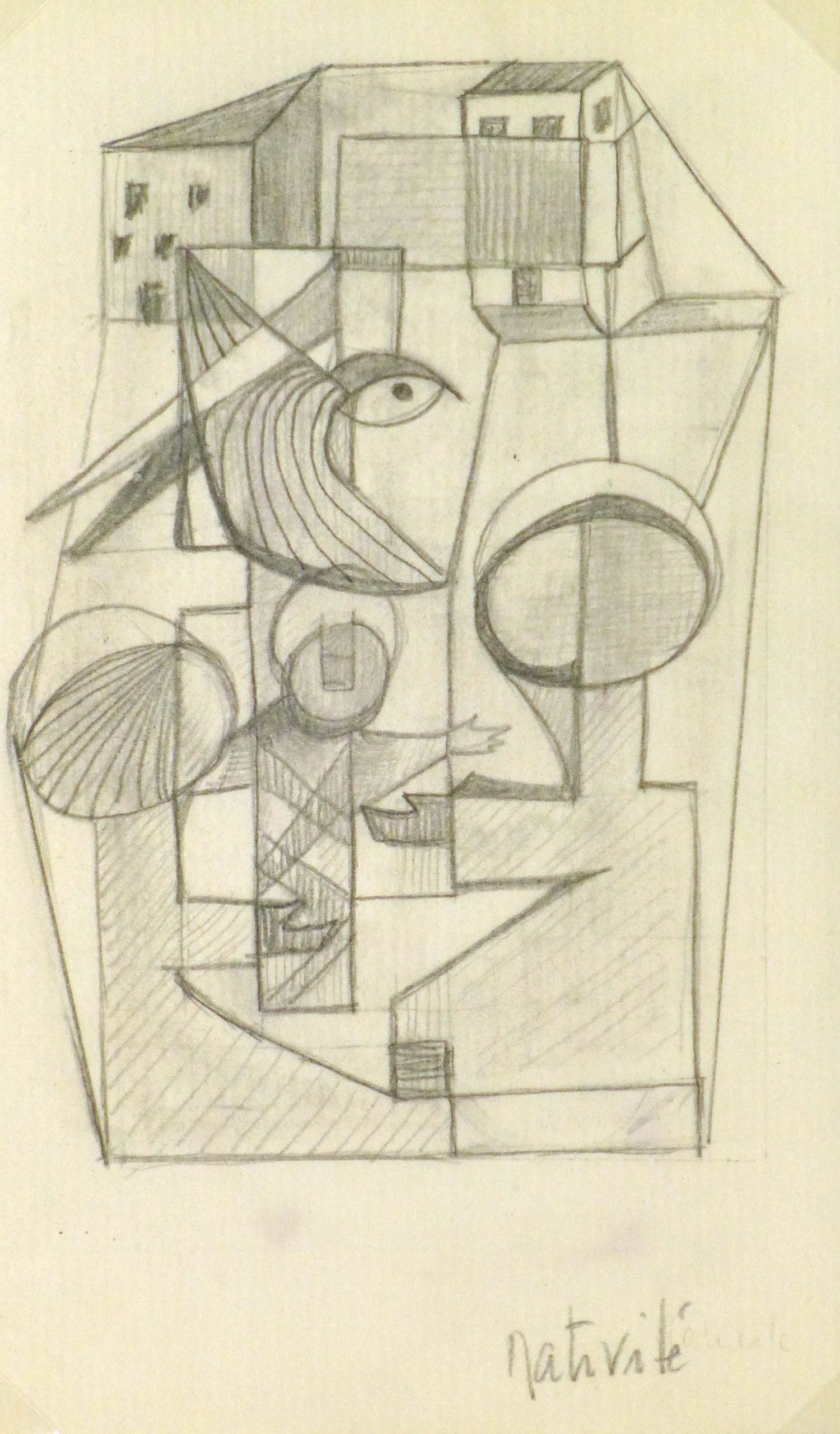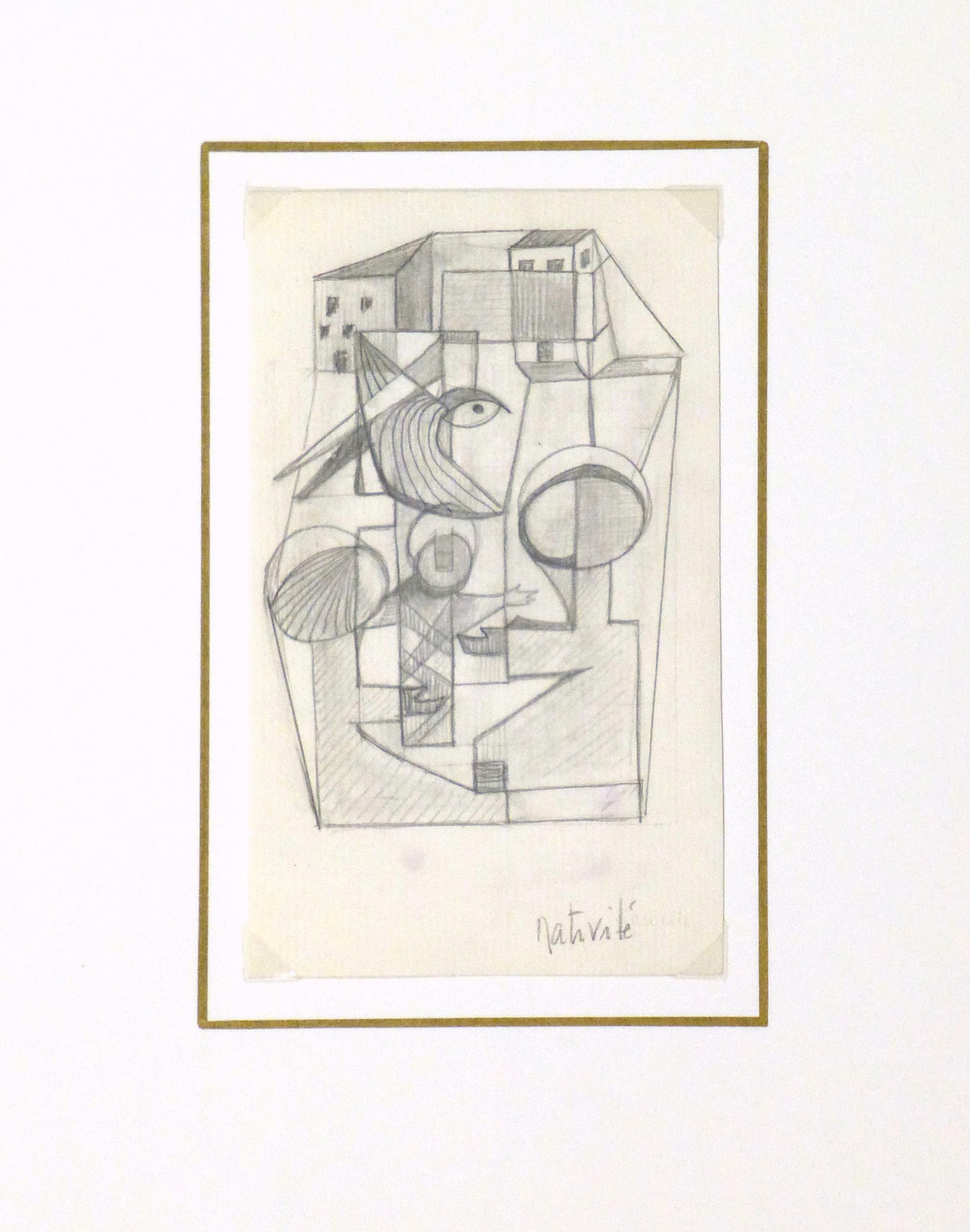 Vintage abstract pencil drawing with birds, buildings and human figures, circa 1930. Titled “Nativité” lower right.