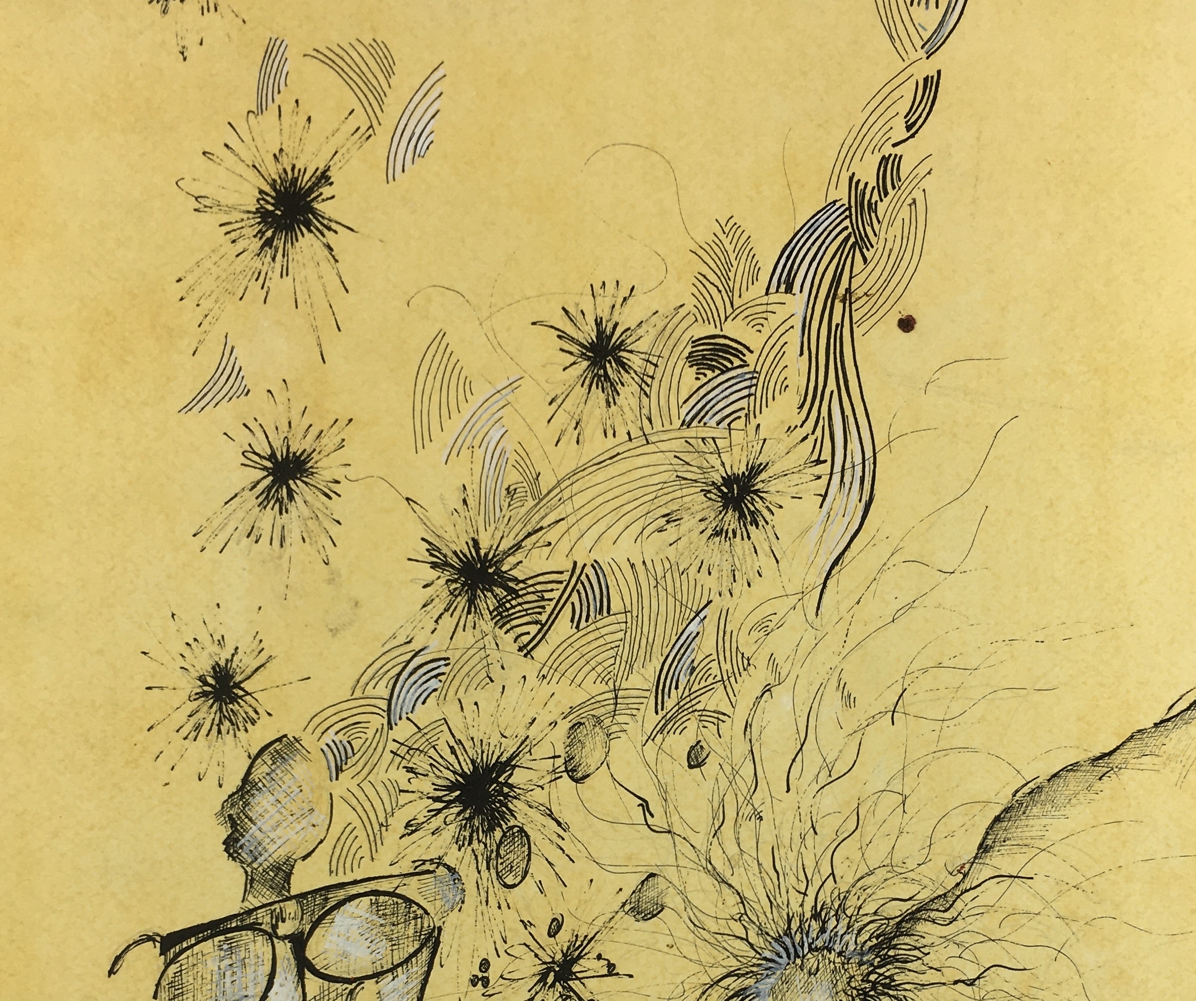 Original Art on paper displayed on a white mat with a gold border. Mat fits a standard-size frame. Archival plastic sleeve and Certificate of Authenticity included. Original Art, 12.25″W x 14.75″H; mat, 18″W x 24″H.