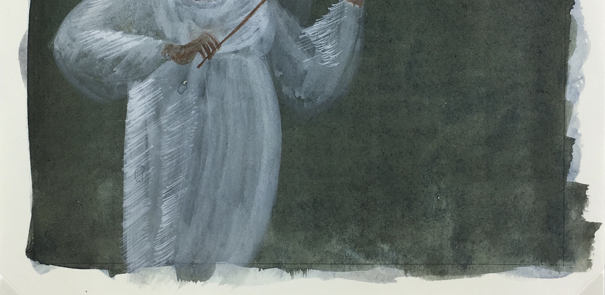 Original Art on paper displayed on a white mat with a gold border. Mat fits a standard-size frame. Archival plastic sleeve and Certificate of Authenticity included. Original Art, 7″W x 5.5″H; mat, 16″W x 20″H.