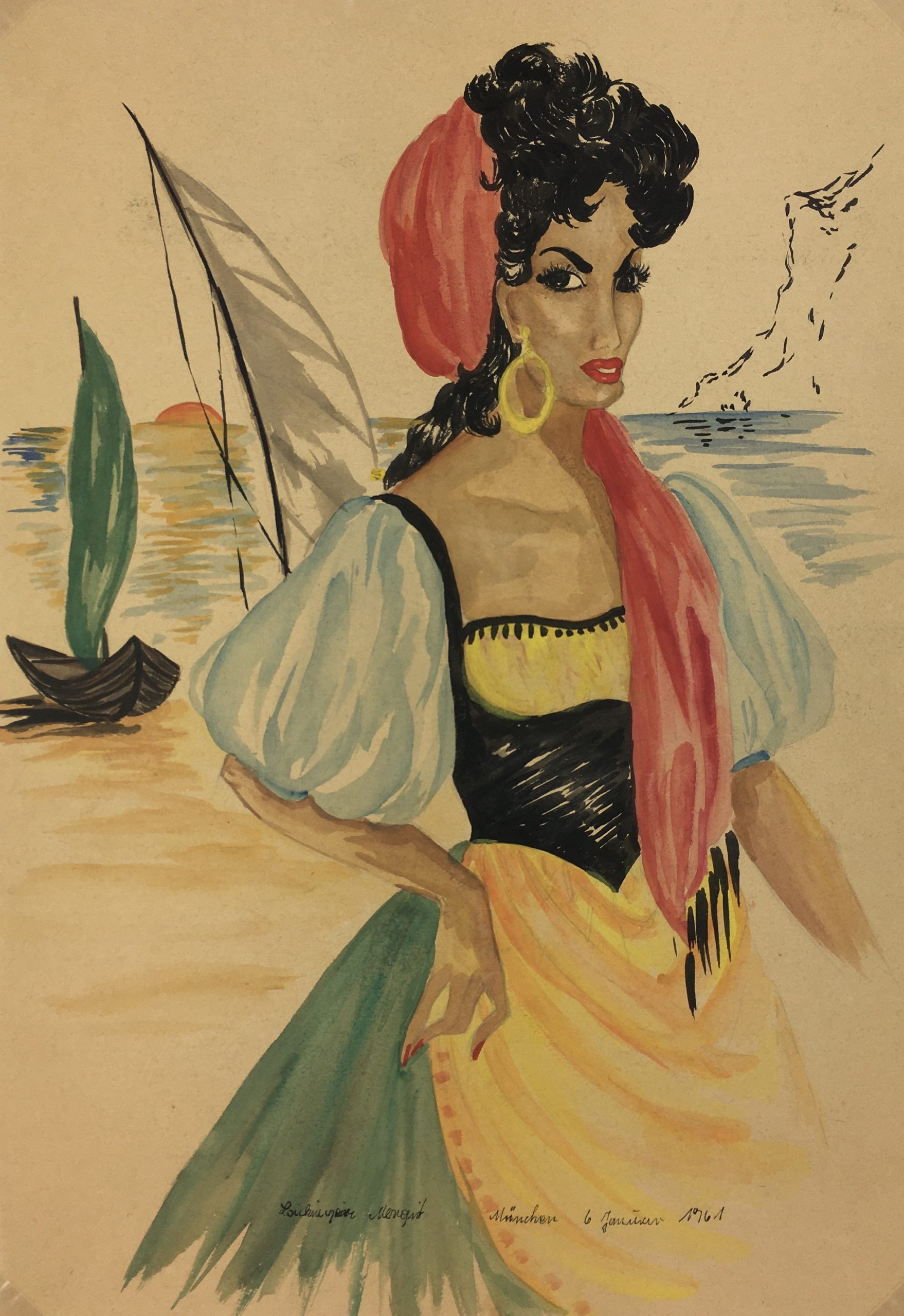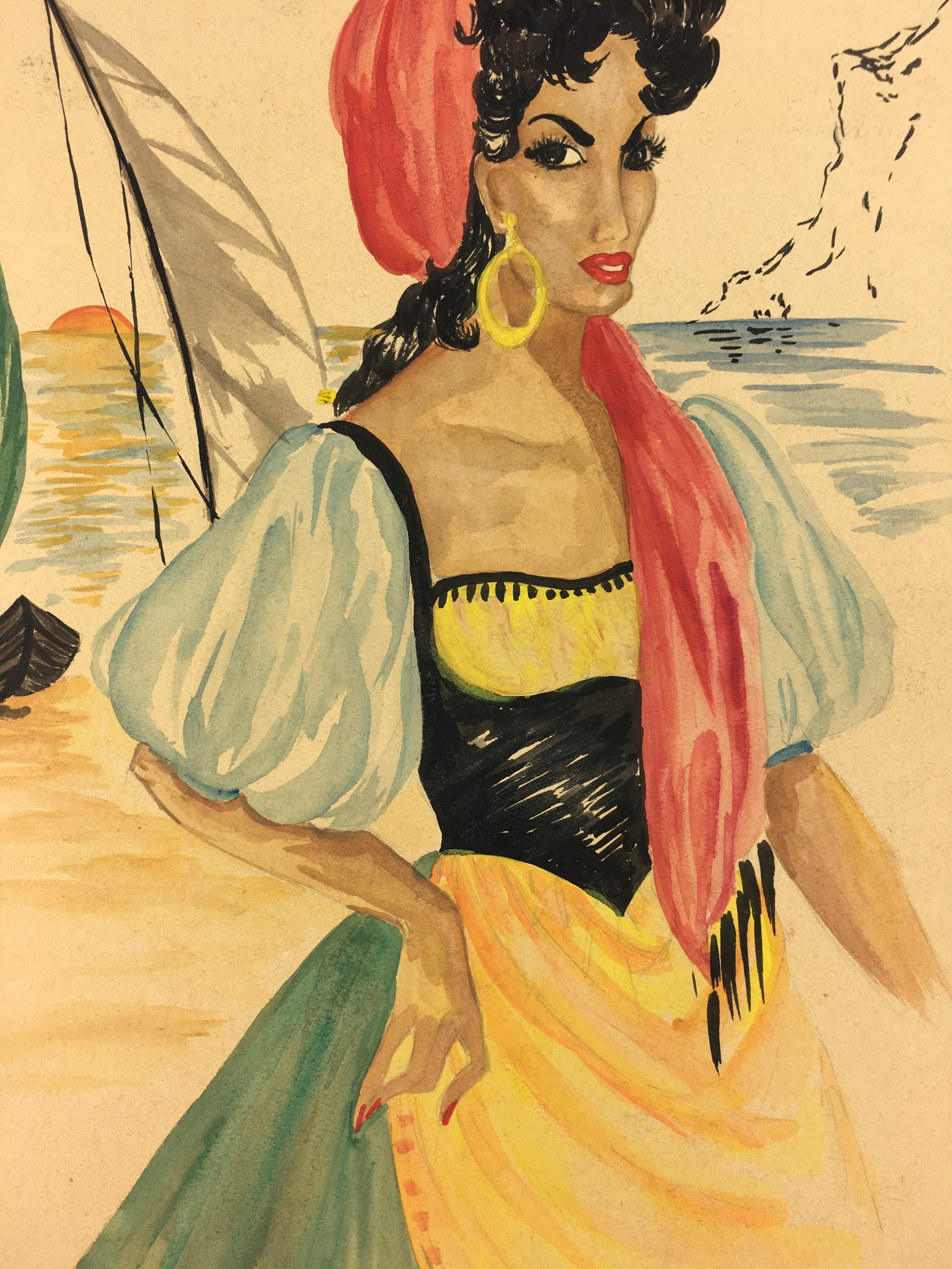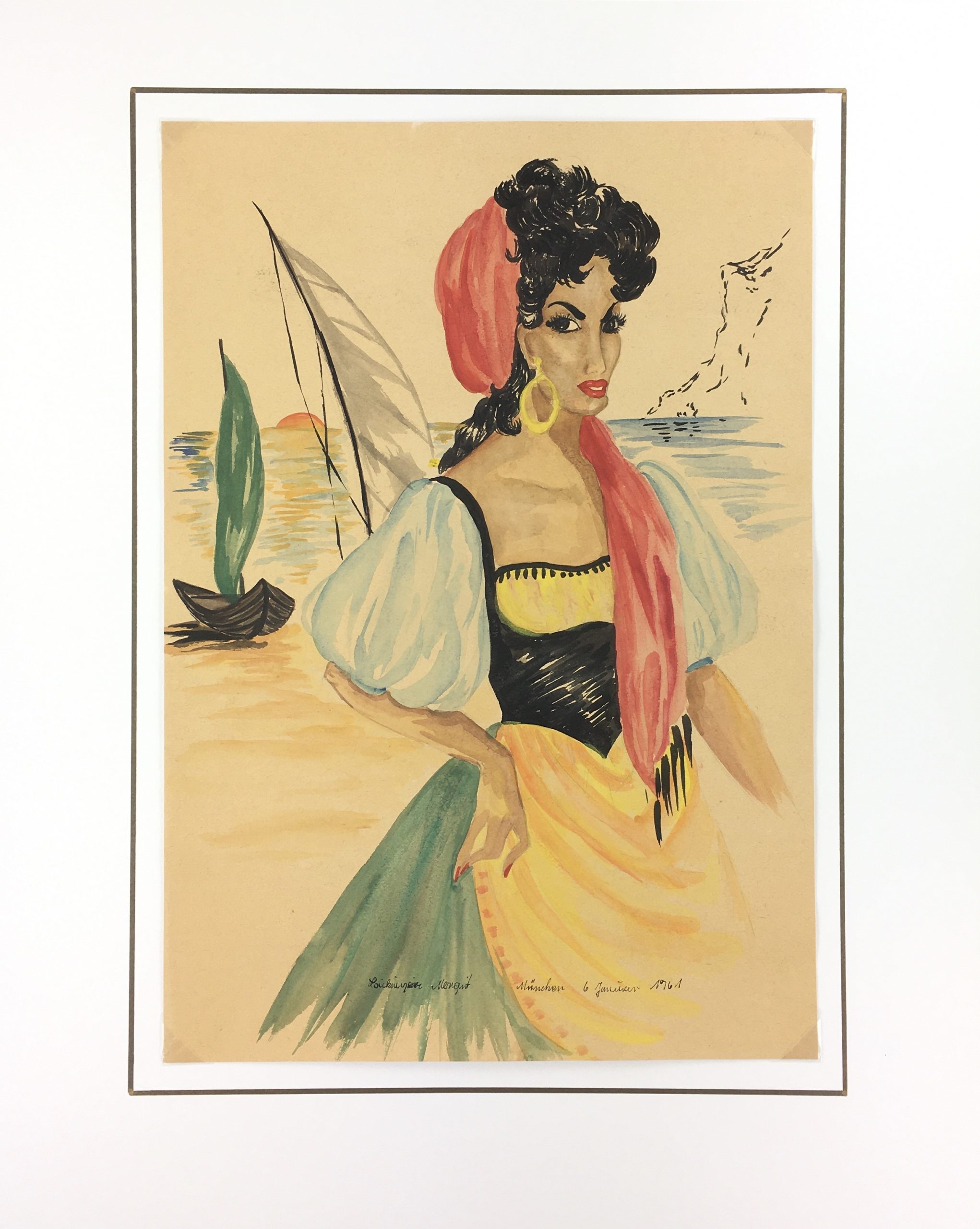 Original Art on paper displayed on a white mat with a gold border. Mat fits a standard-size frame. Archival plastic sleeve and Certificate of Authenticity included. Original Art, 10.5″W x 15″H; mat, 16″W x 20″H.