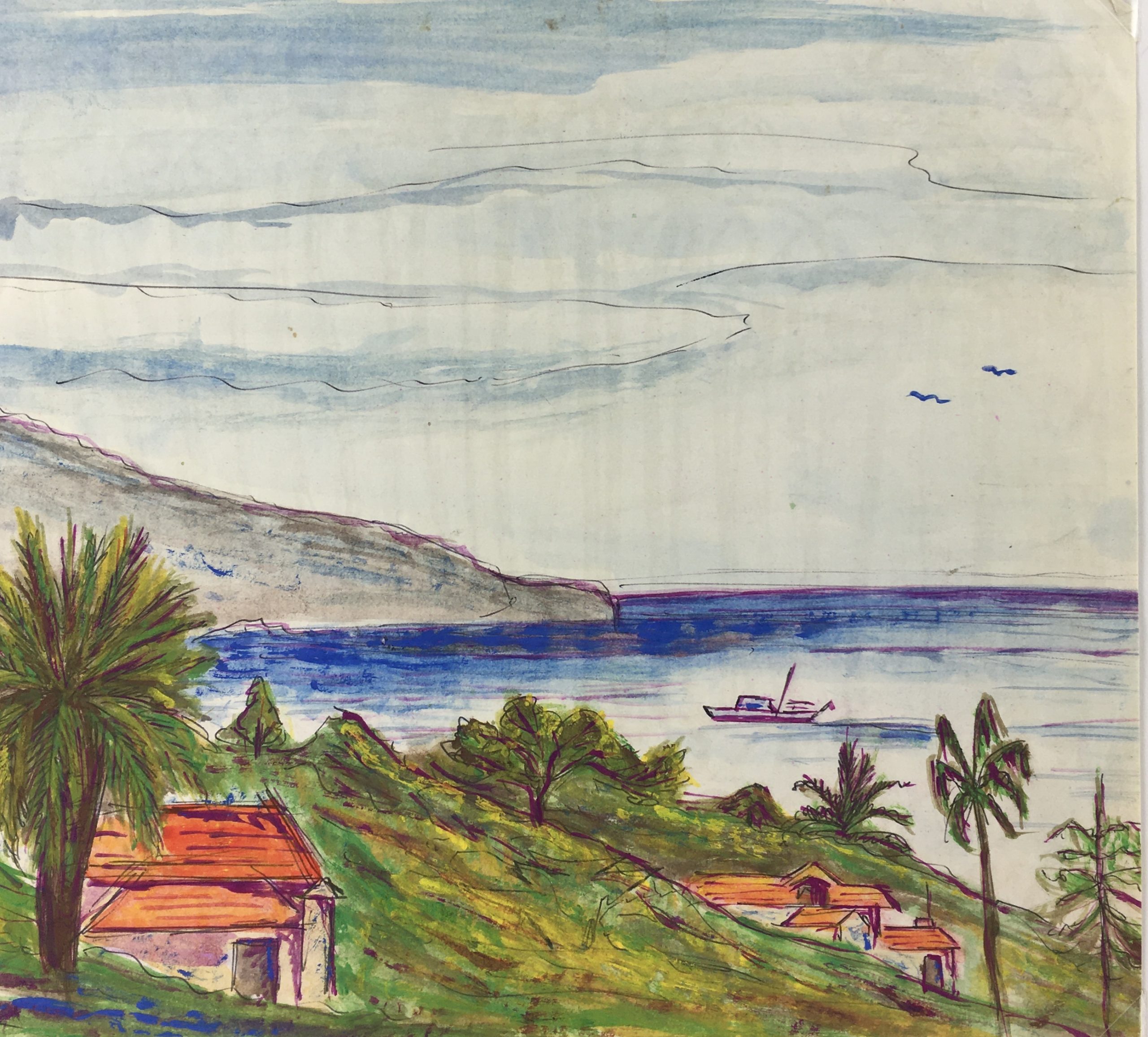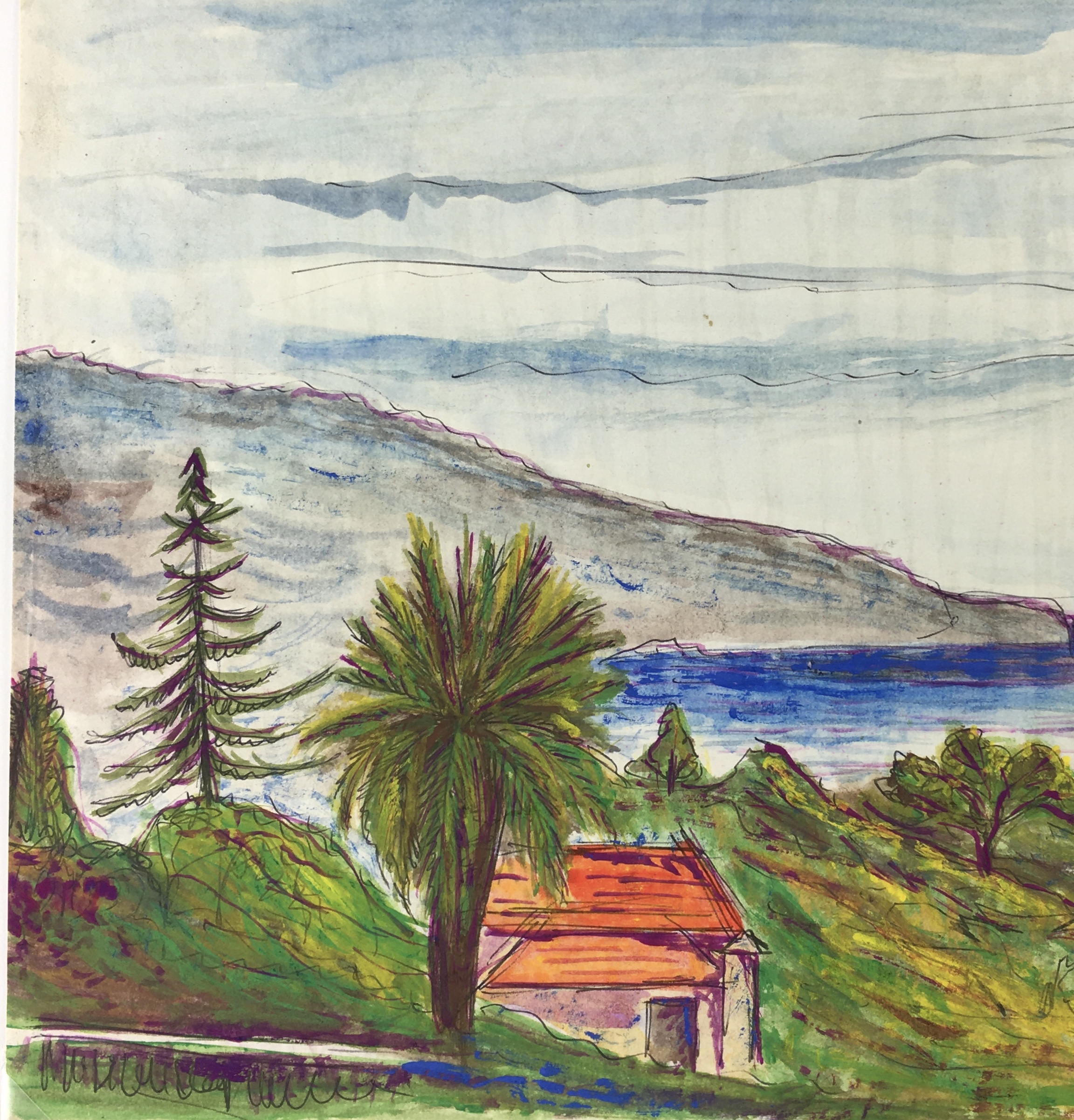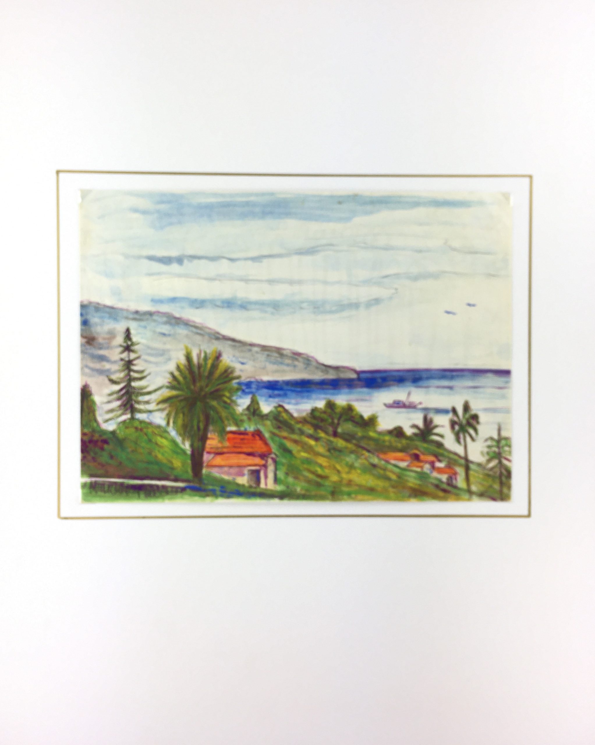 Original Art on paper displayed on a white mat with a gold border. Mat fits a standard-size frame. Archival plastic sleeve and Certificate of Authenticity included. Original Art, 11.5″W x 8″H; mat, 16″W x 20″H.