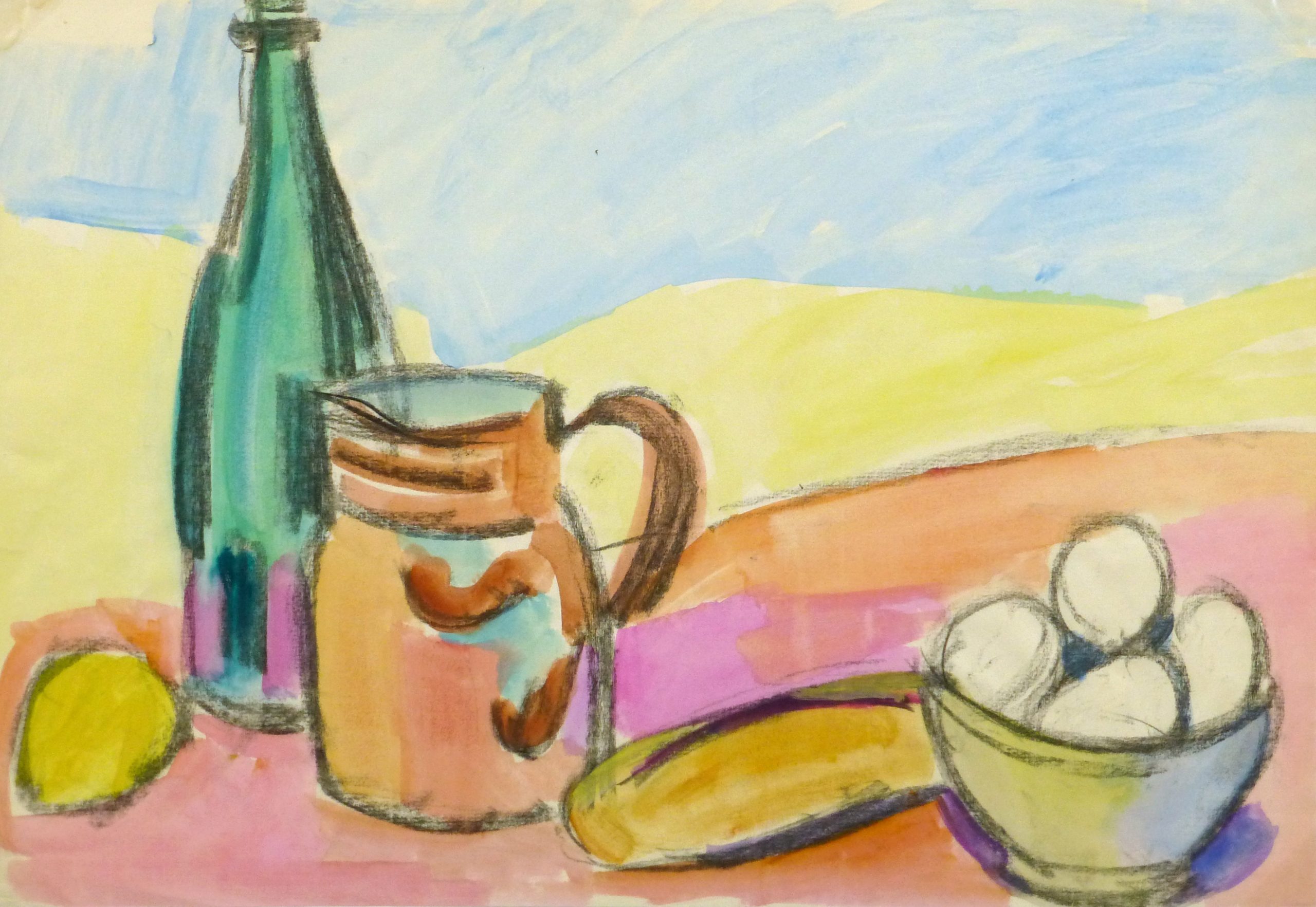 Watercolor and gouache still life of French staple items and a bottle of wine displayed against a harmonious pastel-colored backdrop by French artist Madeleine Scali (1911-2000), circa 1960.