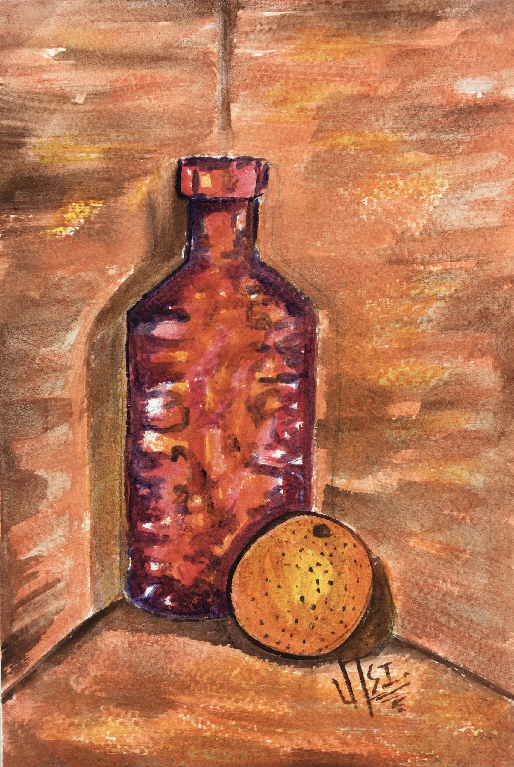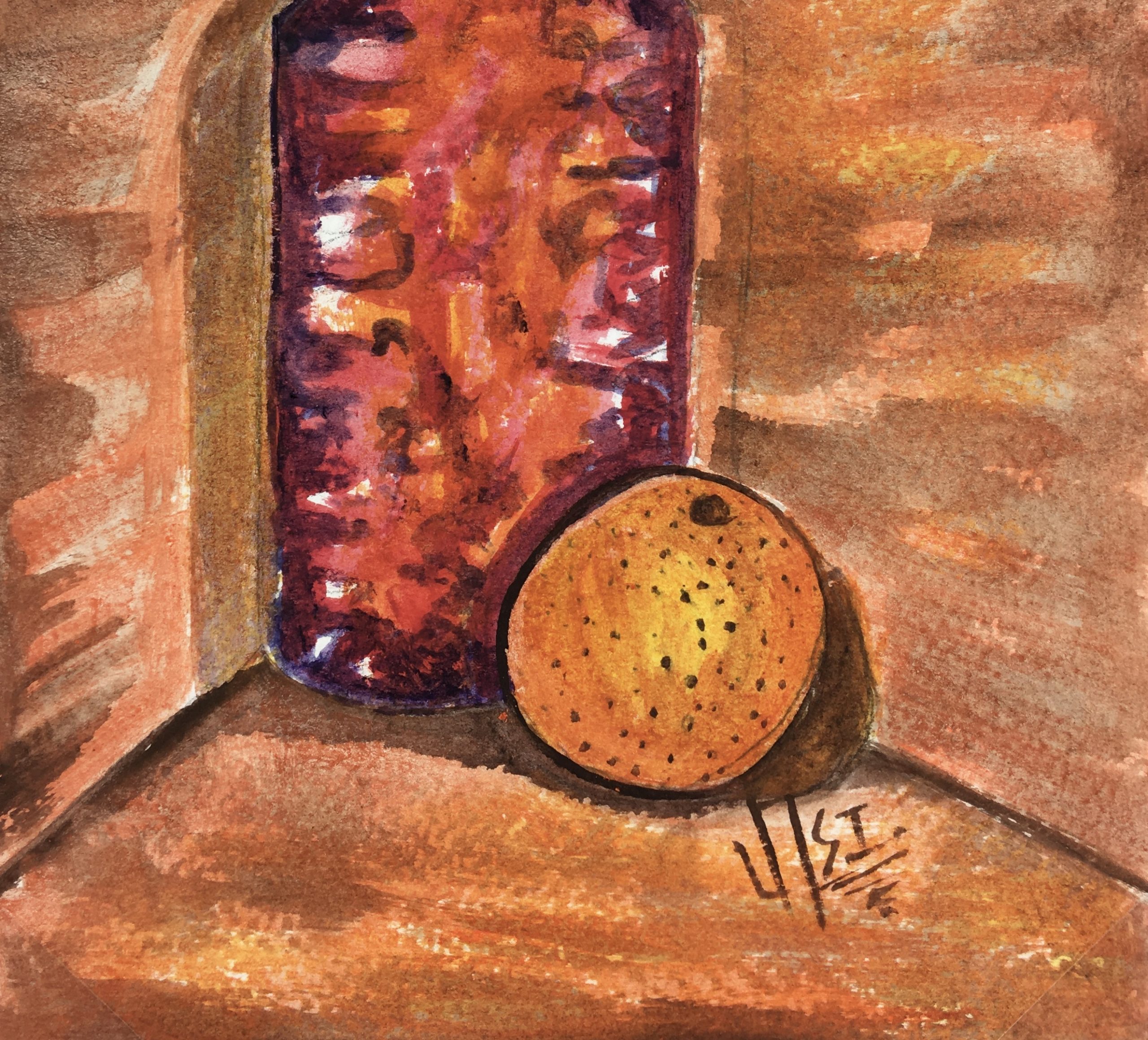 Still Life Original Art – Bottle and Orange, Armando Sanchez (Merida0, 2012
