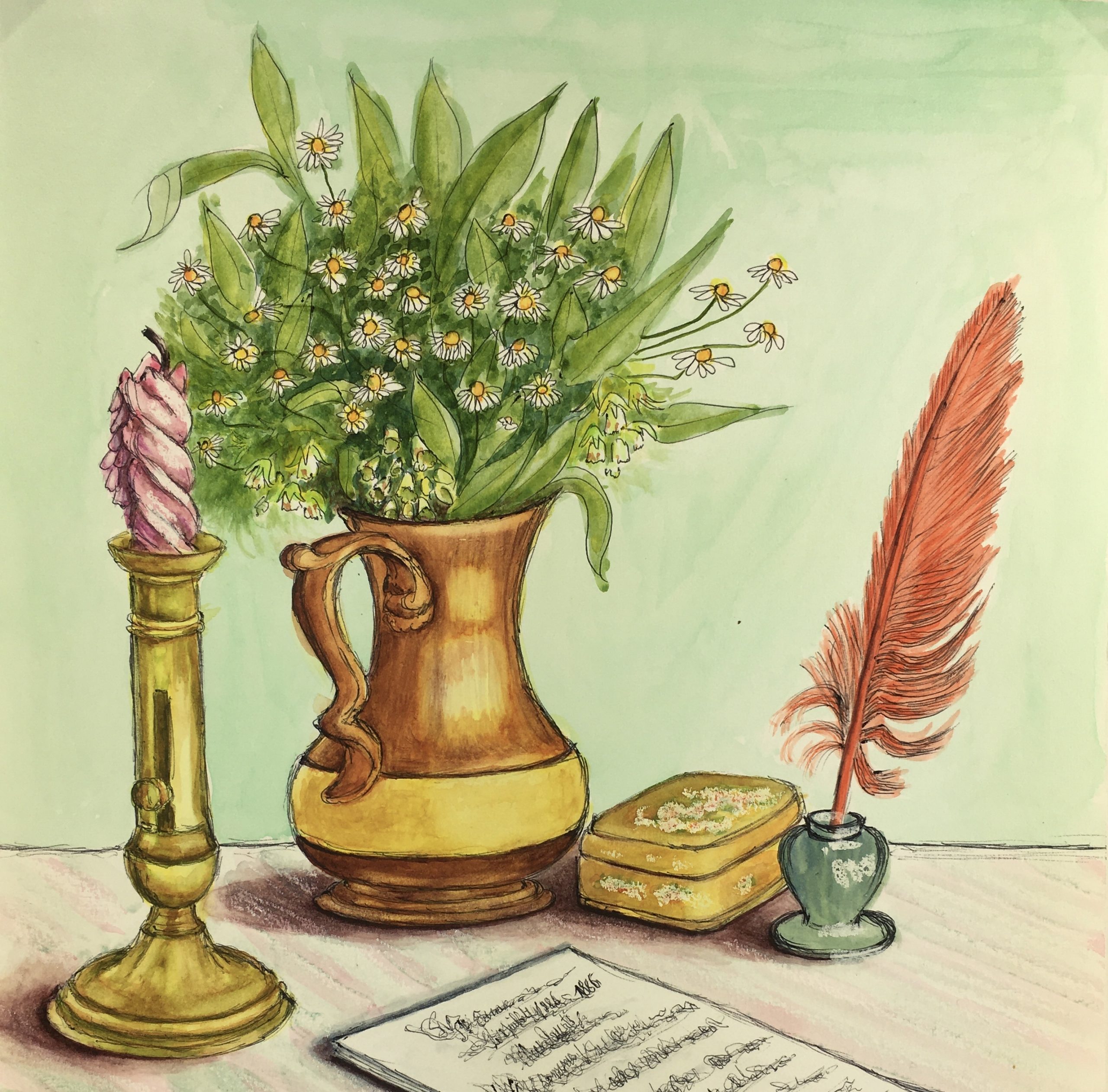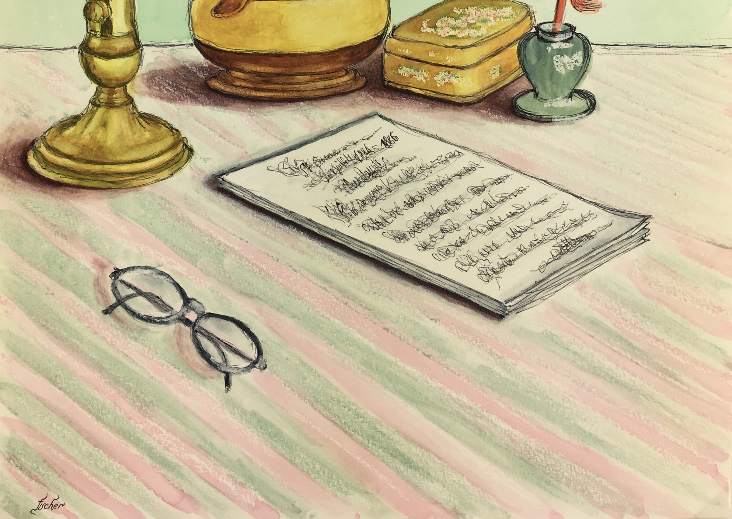 Original Art on paper displayed on a white mat with a gold border. Mat fits a standard-size frame. Archival plastic sleeve and Certificate of Authenticity included. Original Art, 11.75″W x 16.5″H; mat, 18″W x 24″H.