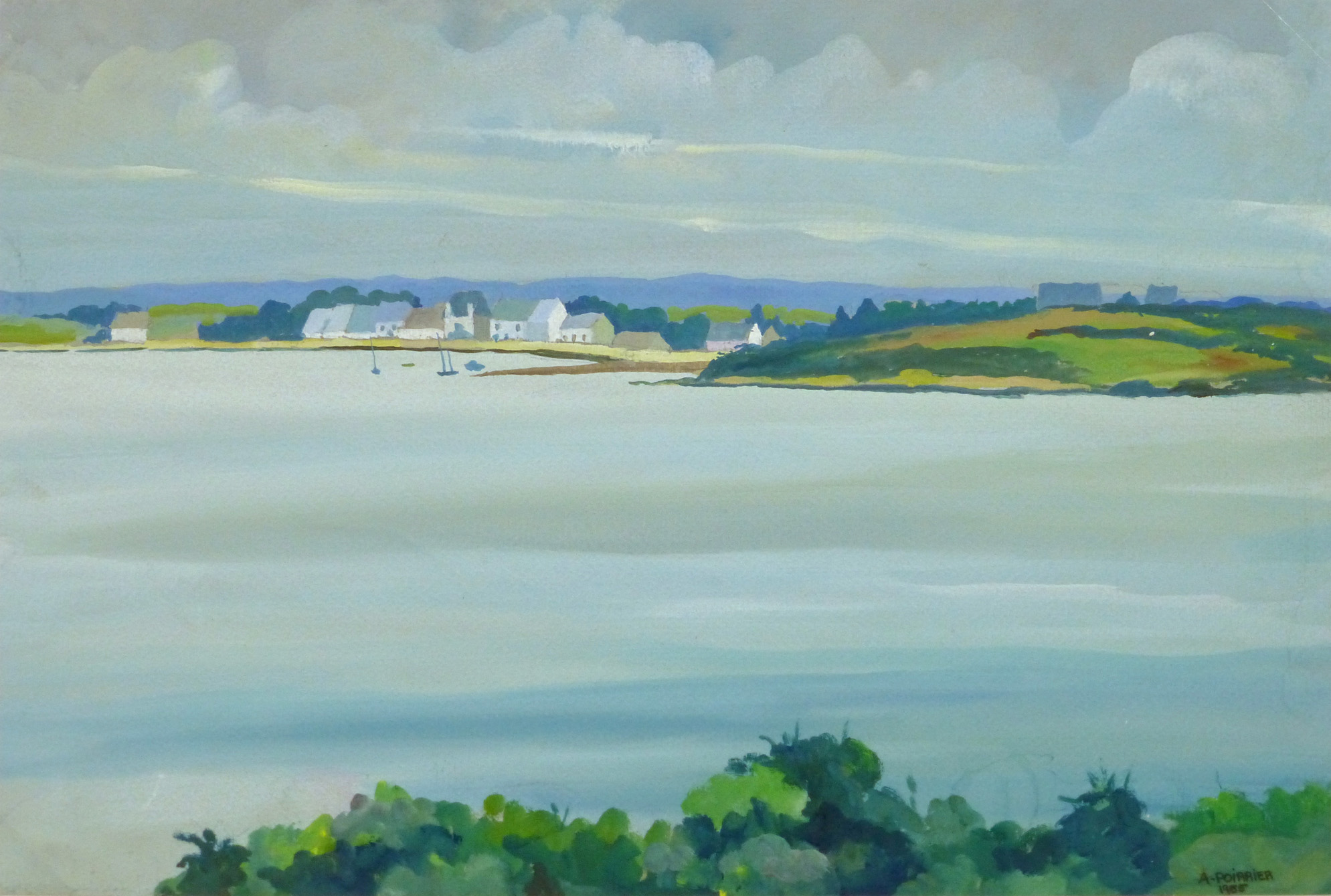 Vintage acrylic seascape of small homes dotting the coastline of Brittany, France by André Poirrier, 1955. Signed and dated lower right.