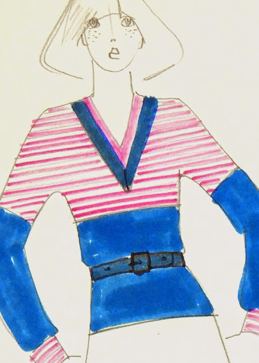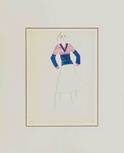 One-of-a-kind vintage ink fashion sketch of a pink and blue v-neck sweater by the Balmain Fashion house, founded by famed French fashion designer Pierre Balmain, circa 1960.