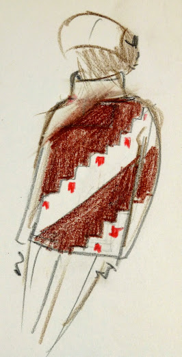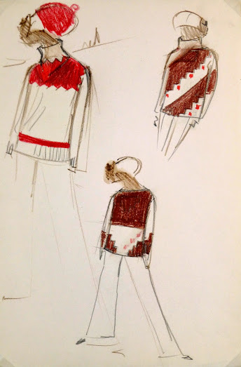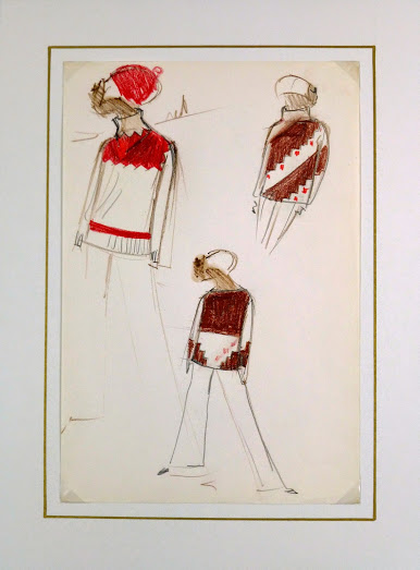 One-of-a-kind vintage pencil fashion sketch of three patterned sweaters by the Balmain Fashion house, founded by famed French fashion designer Pierre Balmain, circa 1960.