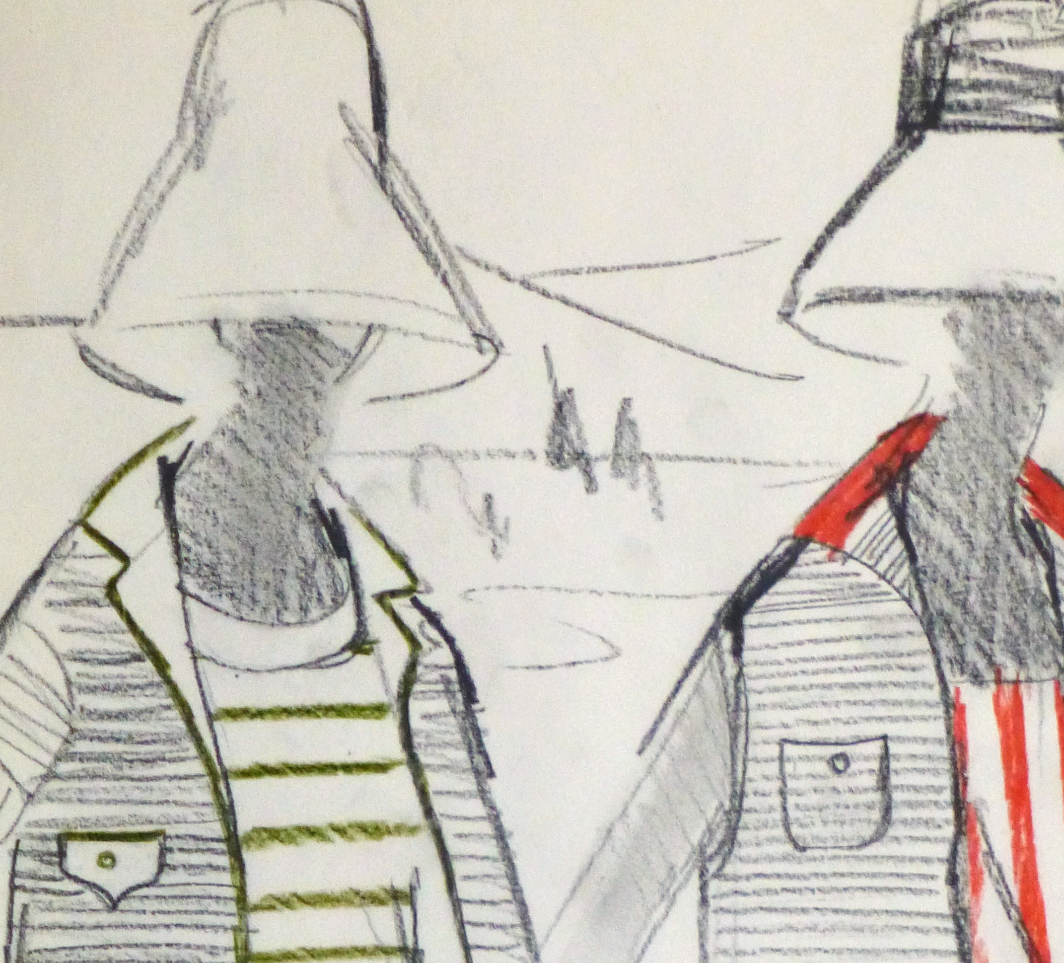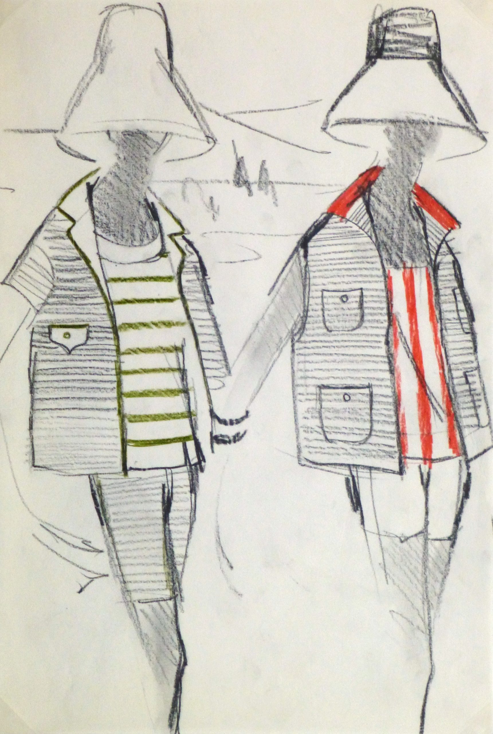 Vintage charcoal fashion sketch of two casual summer outfits paired with colorful striped shirts by Balmain Fashion House of Paris, circa 1960.